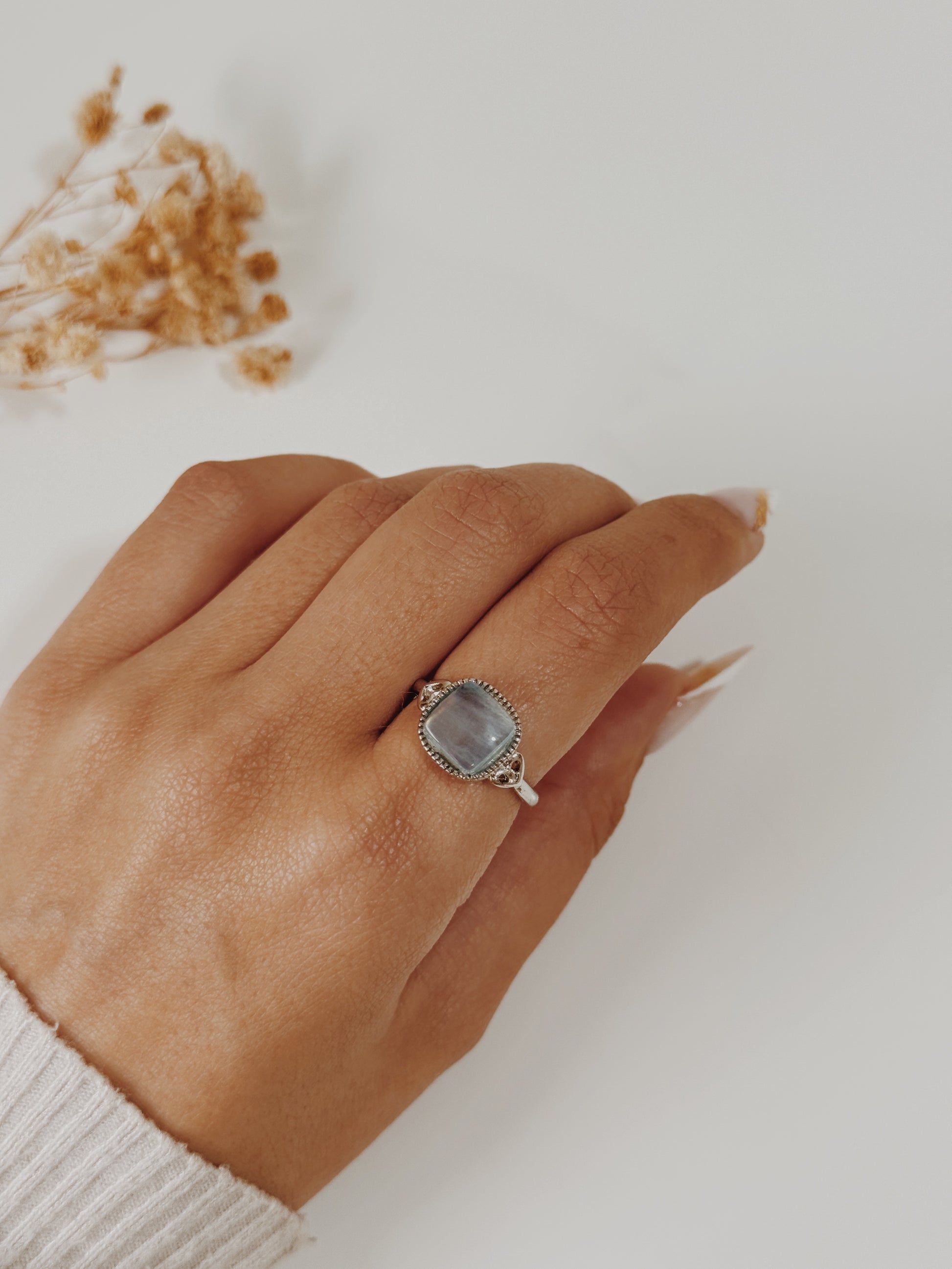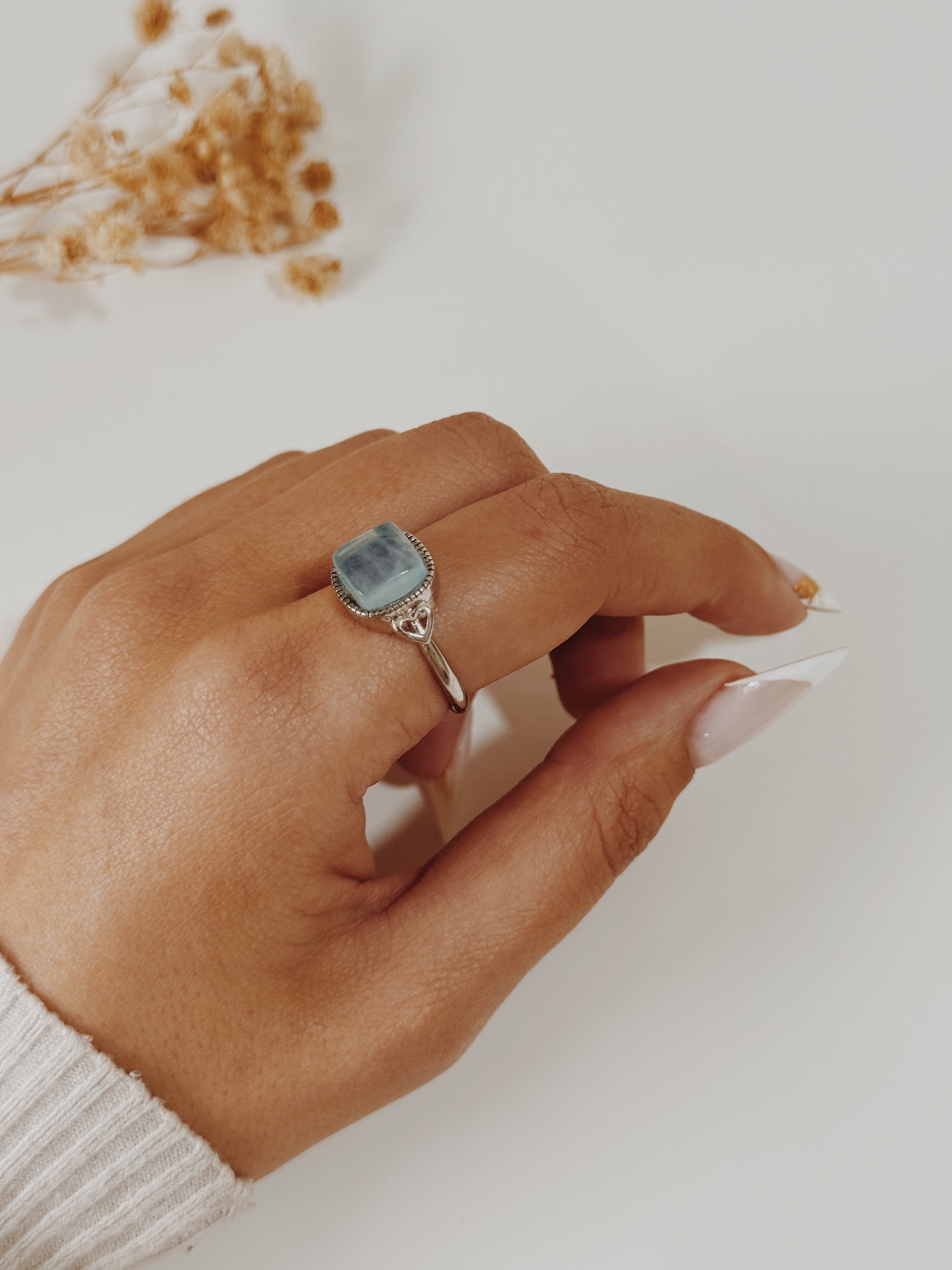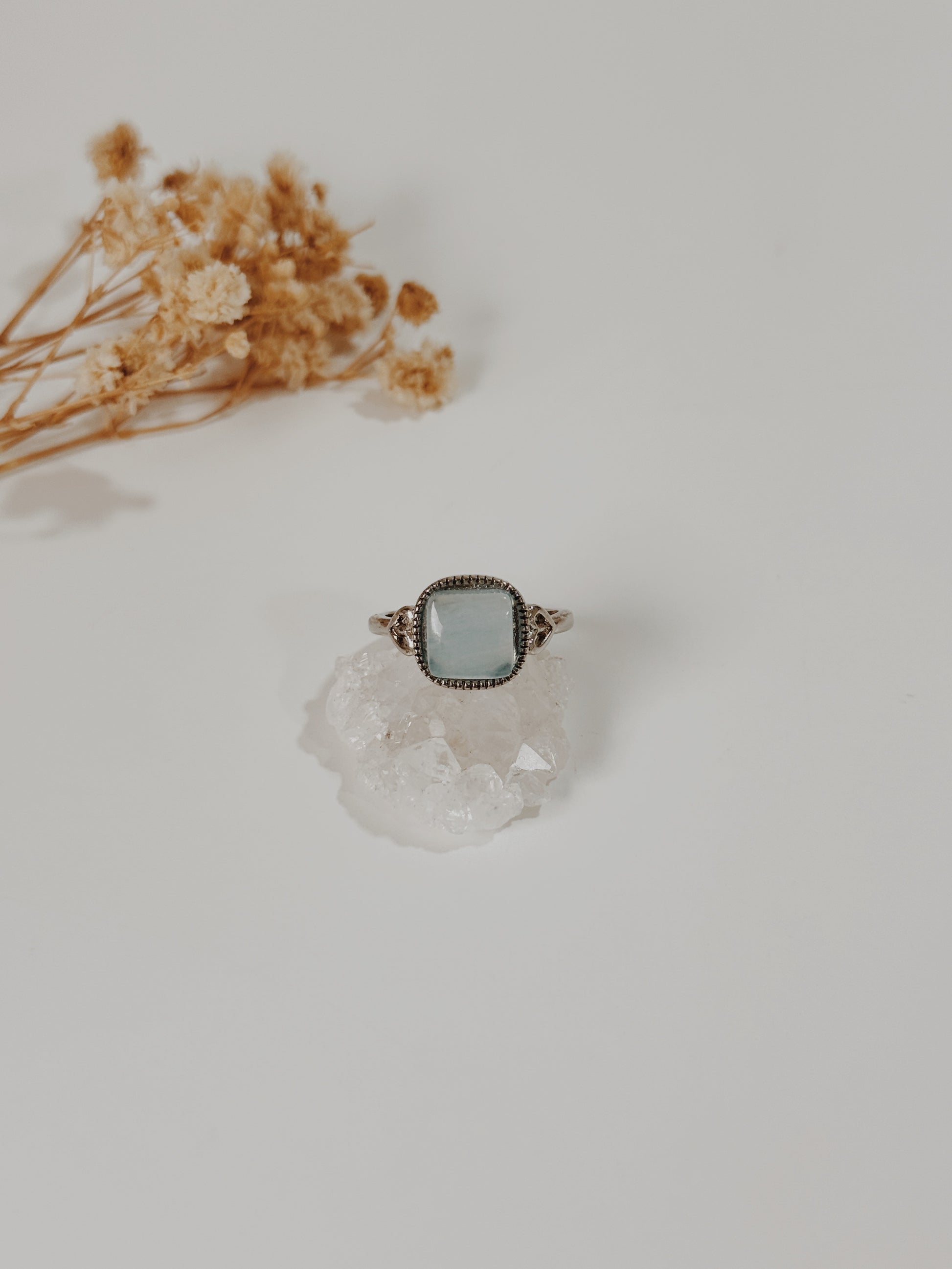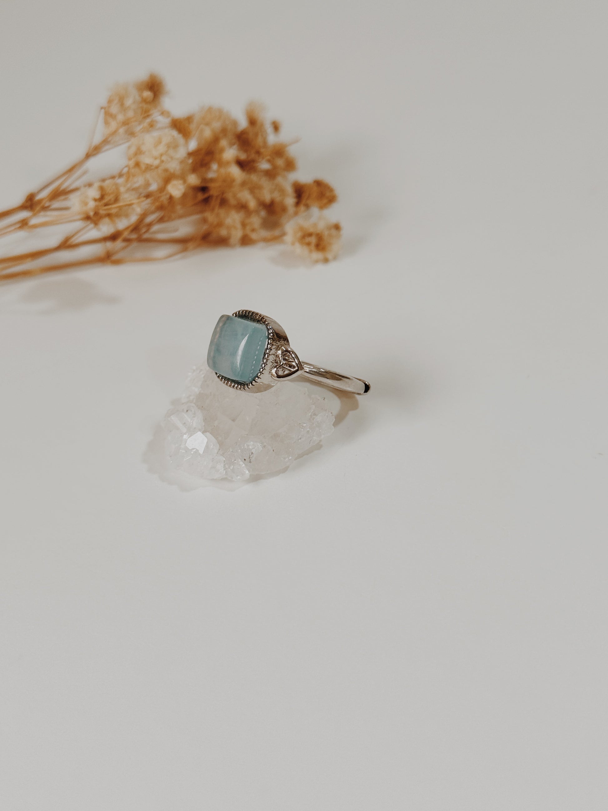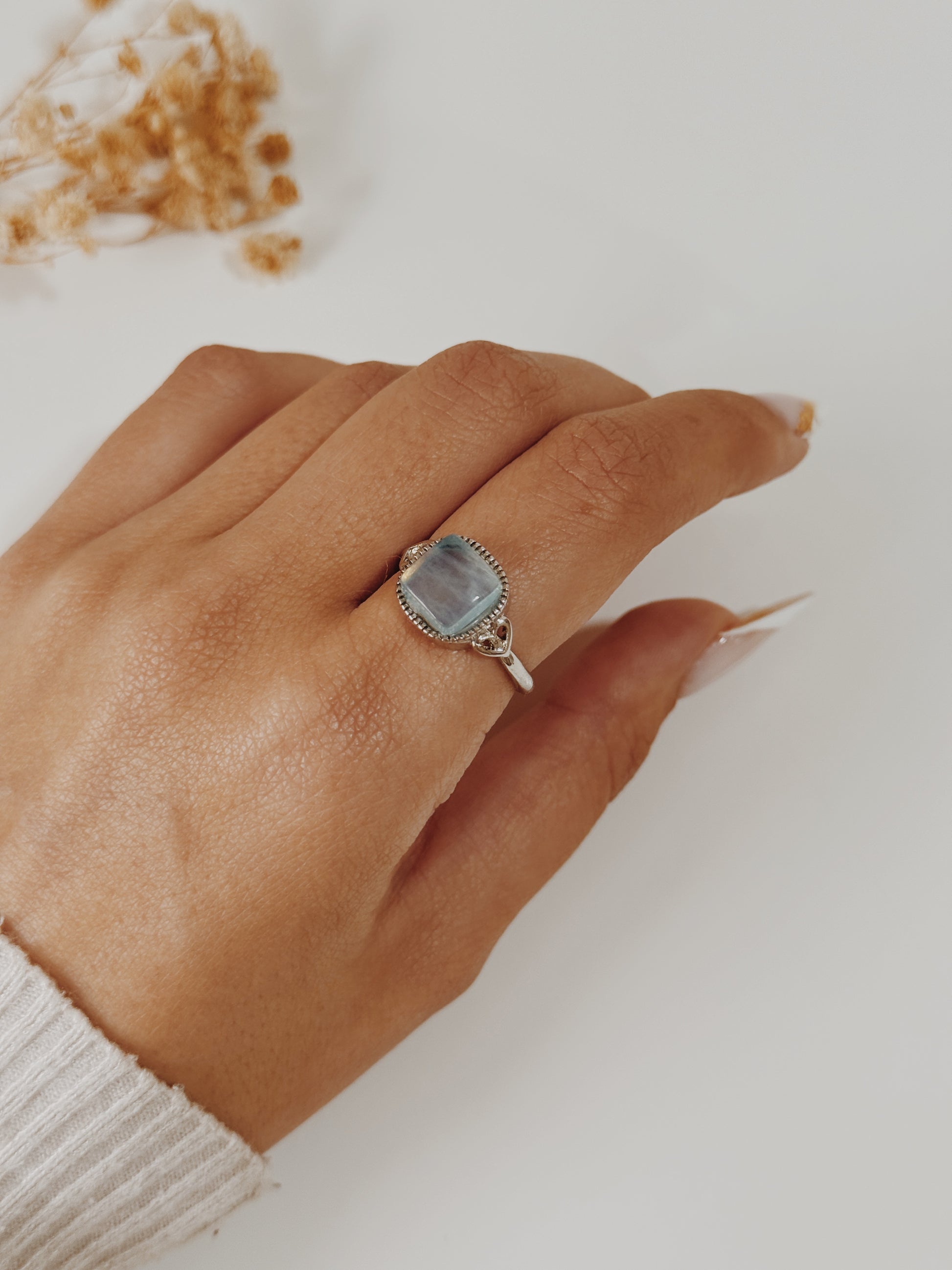 Este anel com Água Marinha é como um sopro de tranquilidade em forma de jóia. Conhecida como a pedra da coragem, da serenidade e comunicação clara, a Água Marinha acalma a mente e ajuda a expressar sentimentos com doçura e verdade.