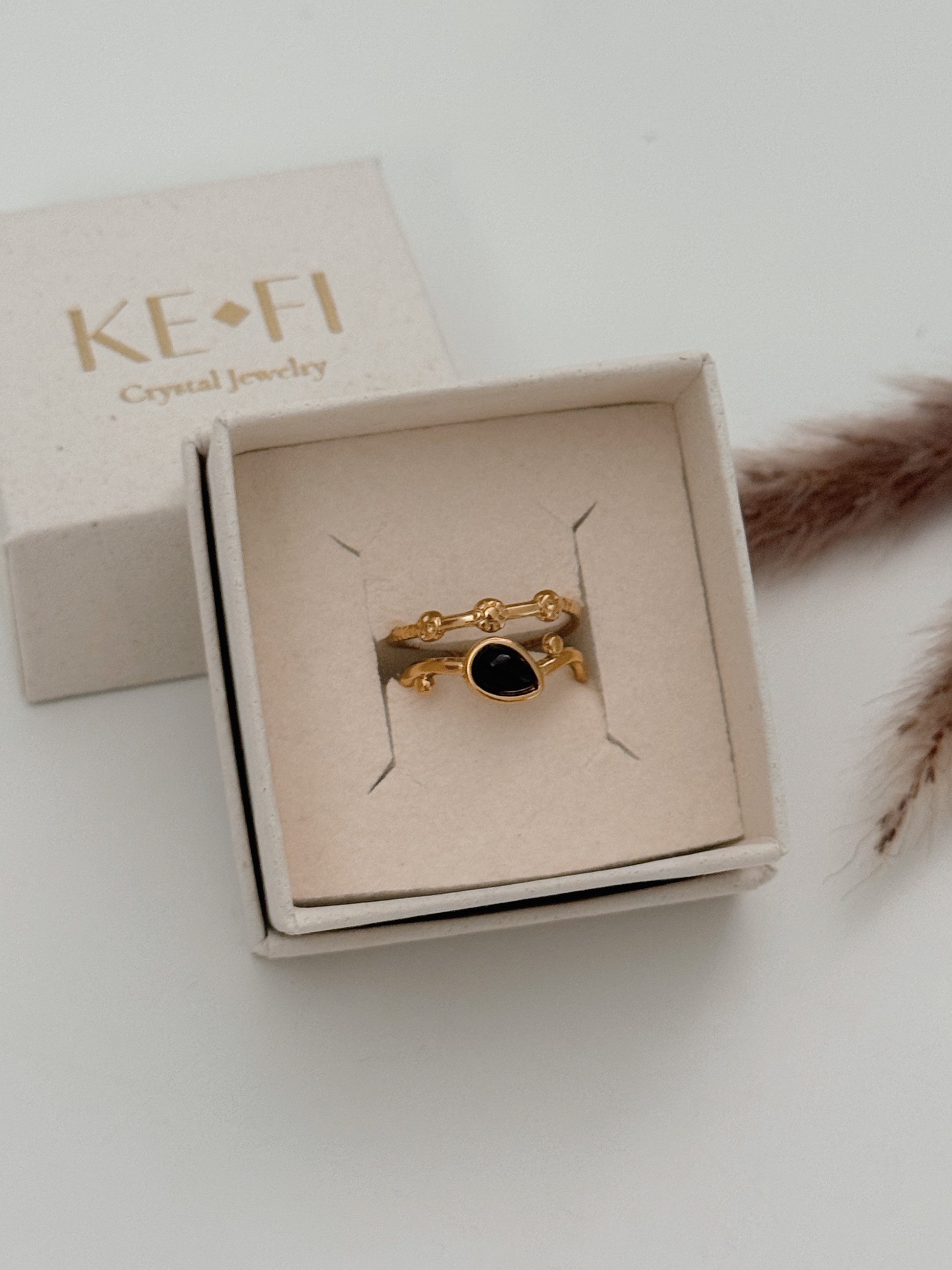 O anel Nara Onix é o amuleto perfeito para quem deseja caminhar com força e estabilidade. Este cristal é conhecido por proteger contra energias negativas, reforçar a autoconfiança e ajudar a manter o foco mesmo nos momentos de mudança. A sua cor negra simboliza o poder interior e a segurança energética , um lembrete de que estás sempre protegida, onde quer que vás.