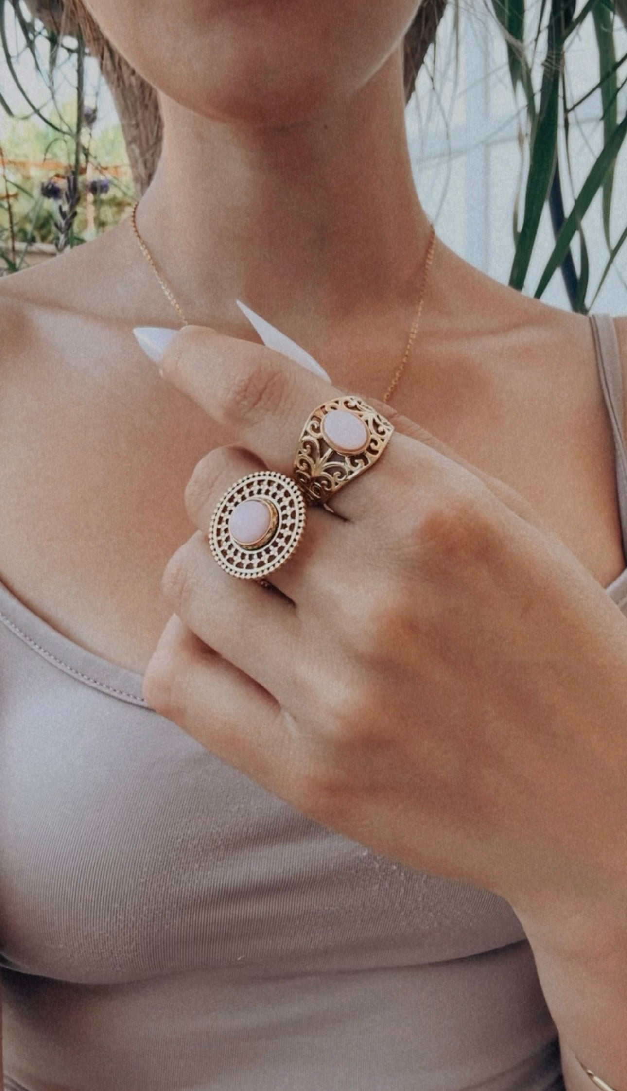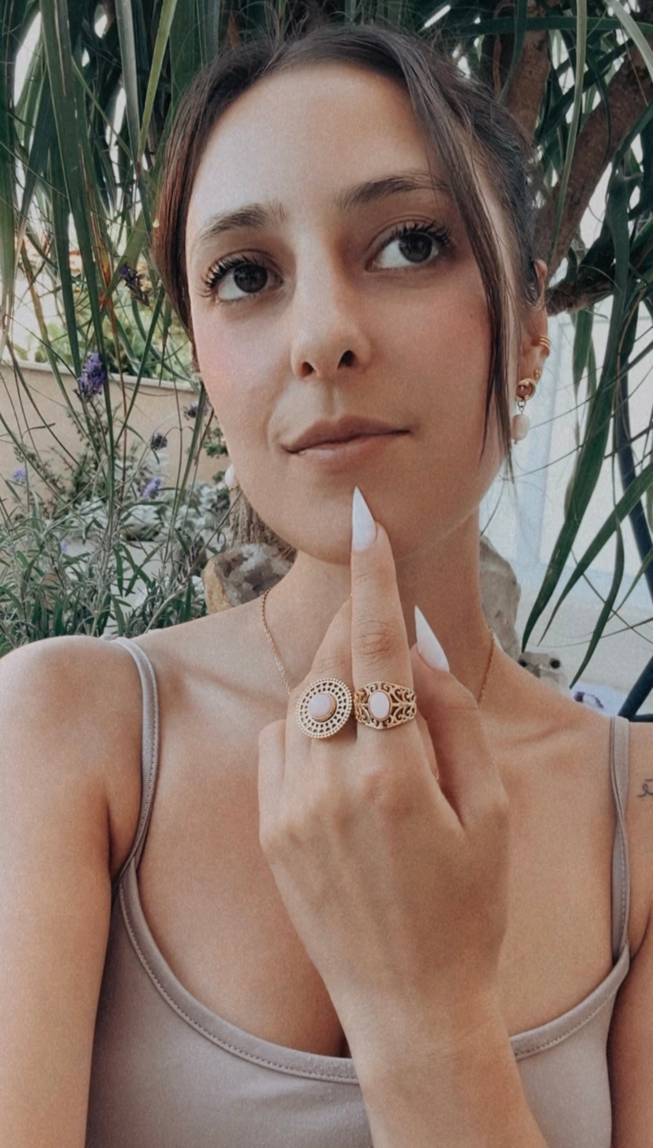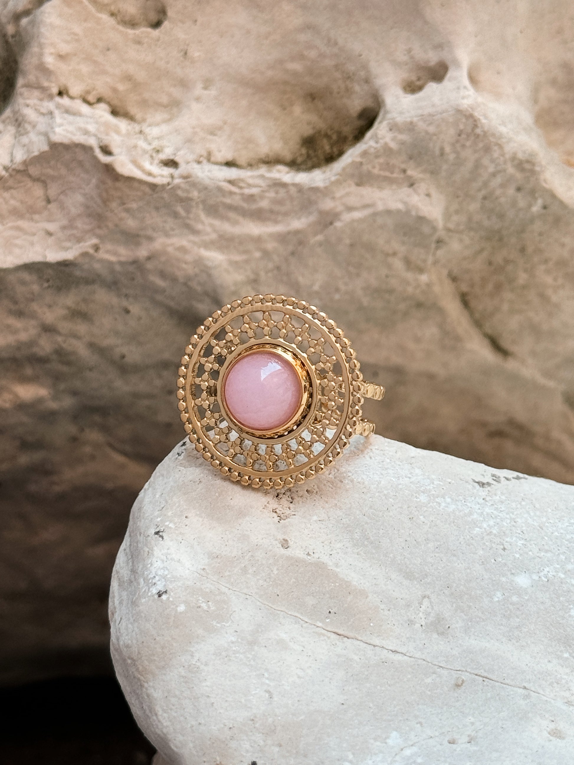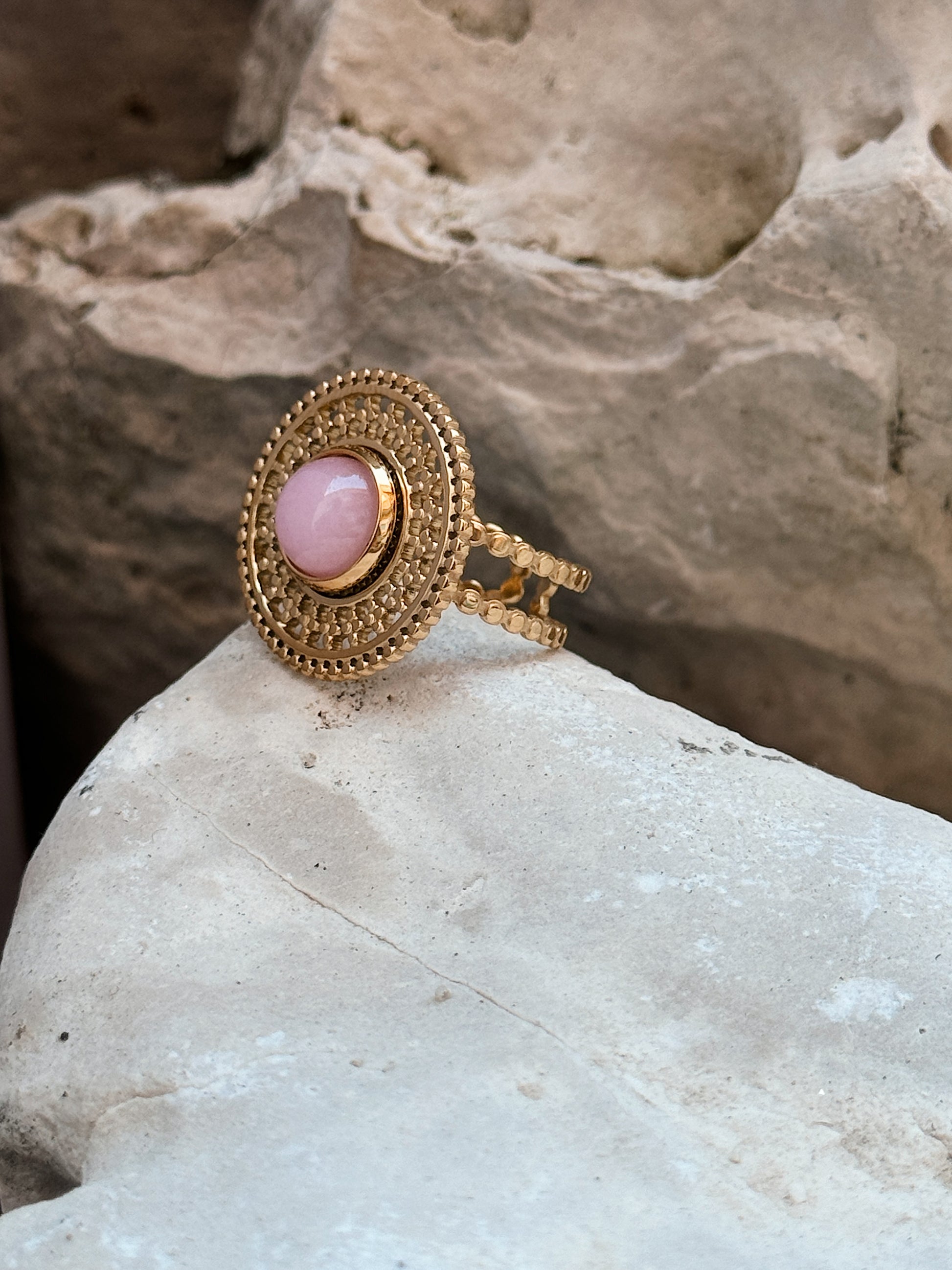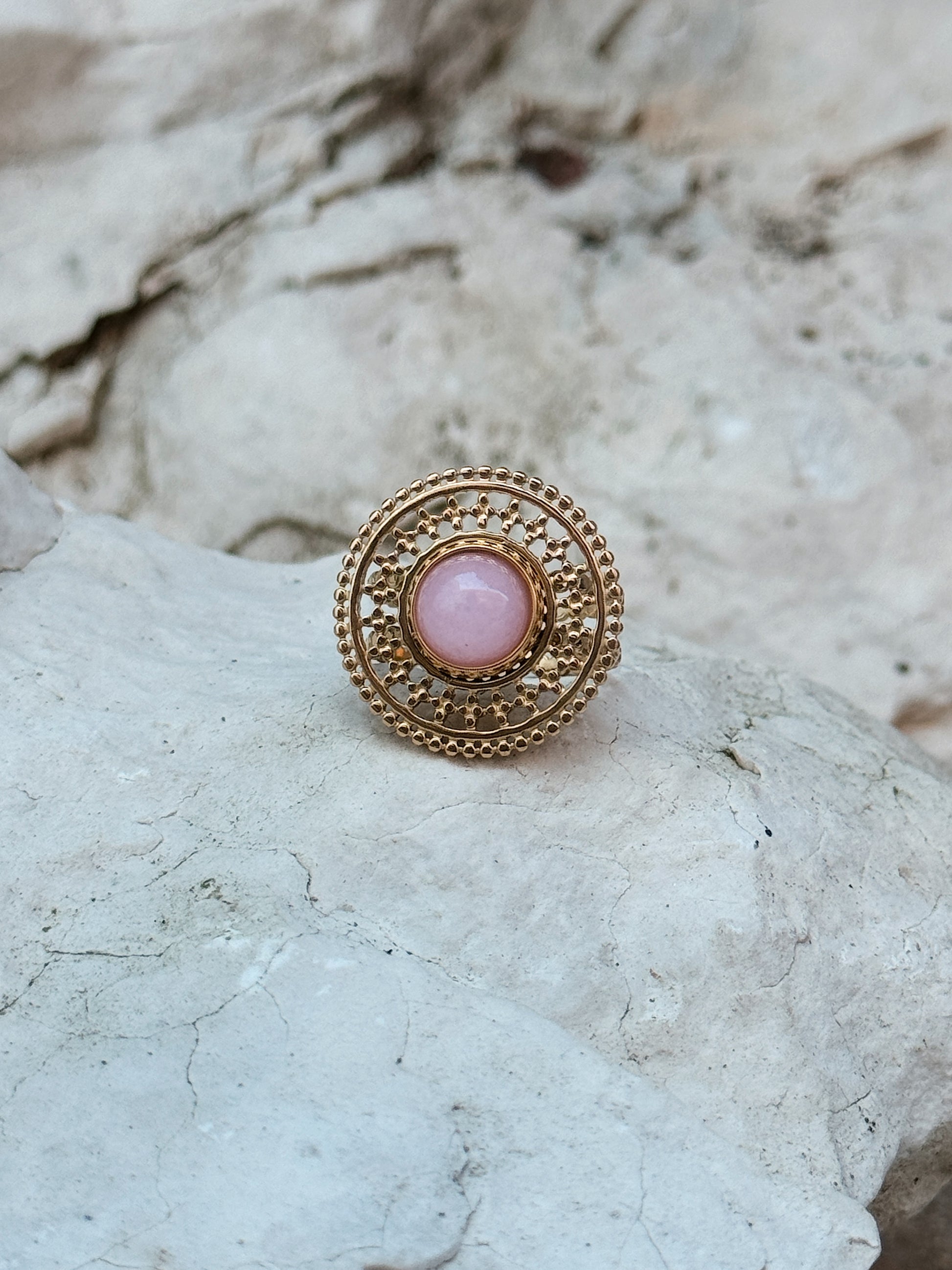 Anel cm Quartzo Rosa e ligação ao elemento terra .