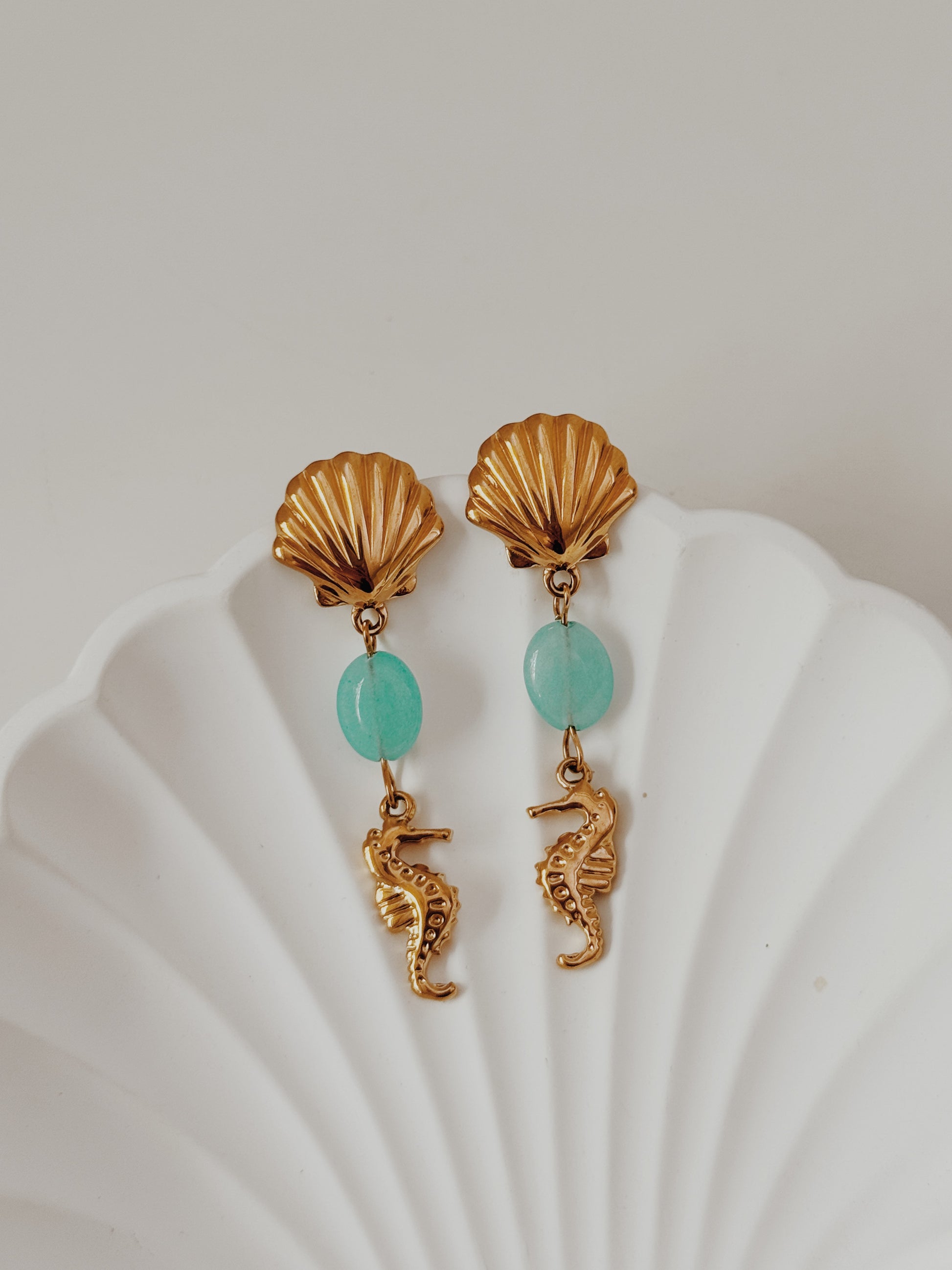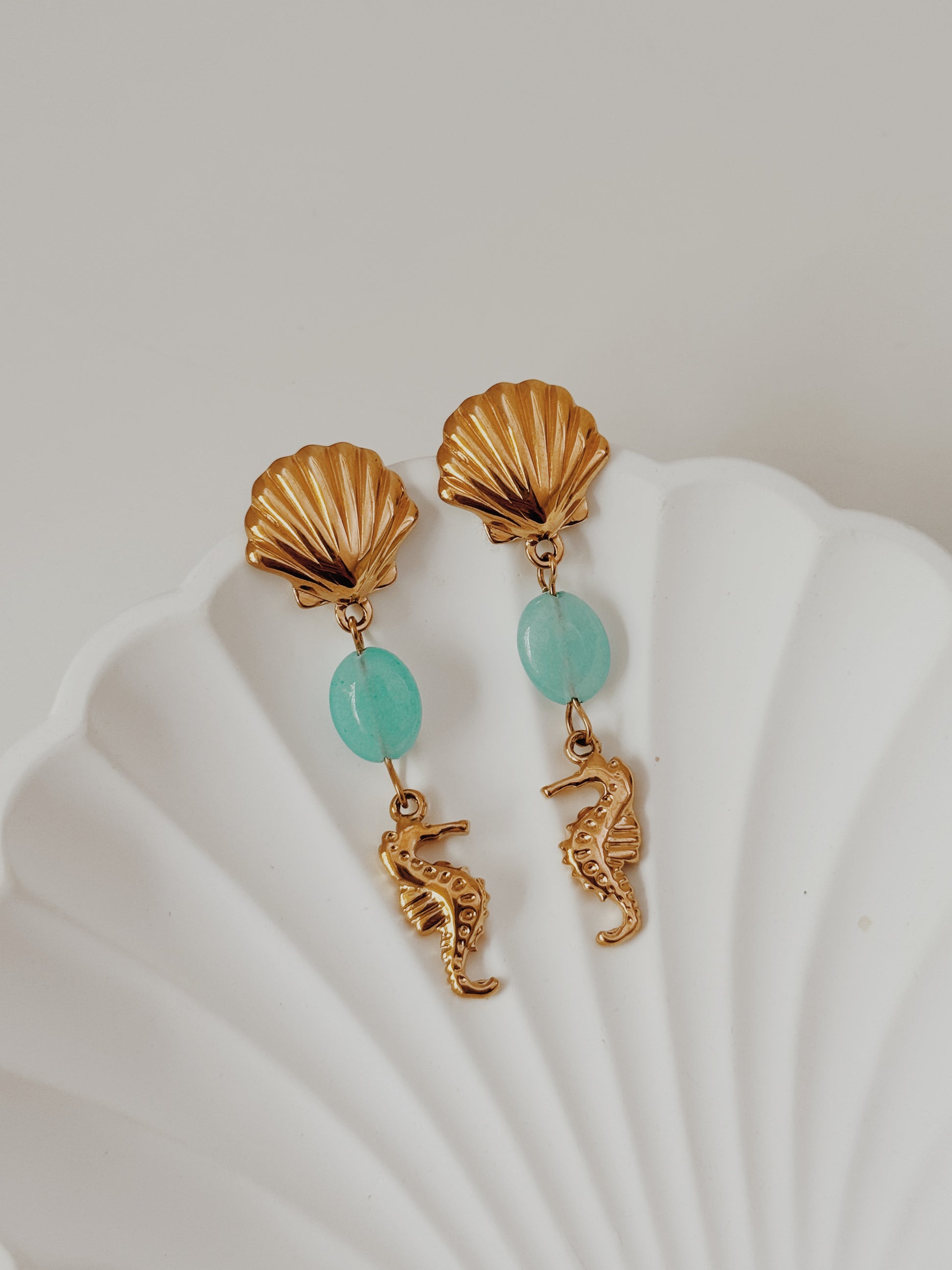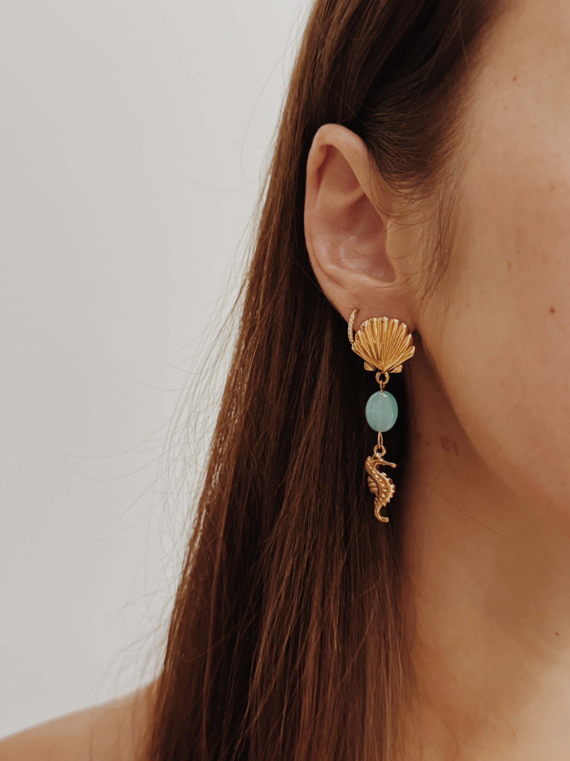 Os Brincos Summer Amazonite transportam a energia refrescante do oceano para o te dia a dia. Com um design elegante e fluido, unem três elementos cheios de simbolismo: a concha e o cavalo marinho que evocam a ligação ao mar e a Amazonite, conhecida por trazer calma, equilíbrio e confiança.