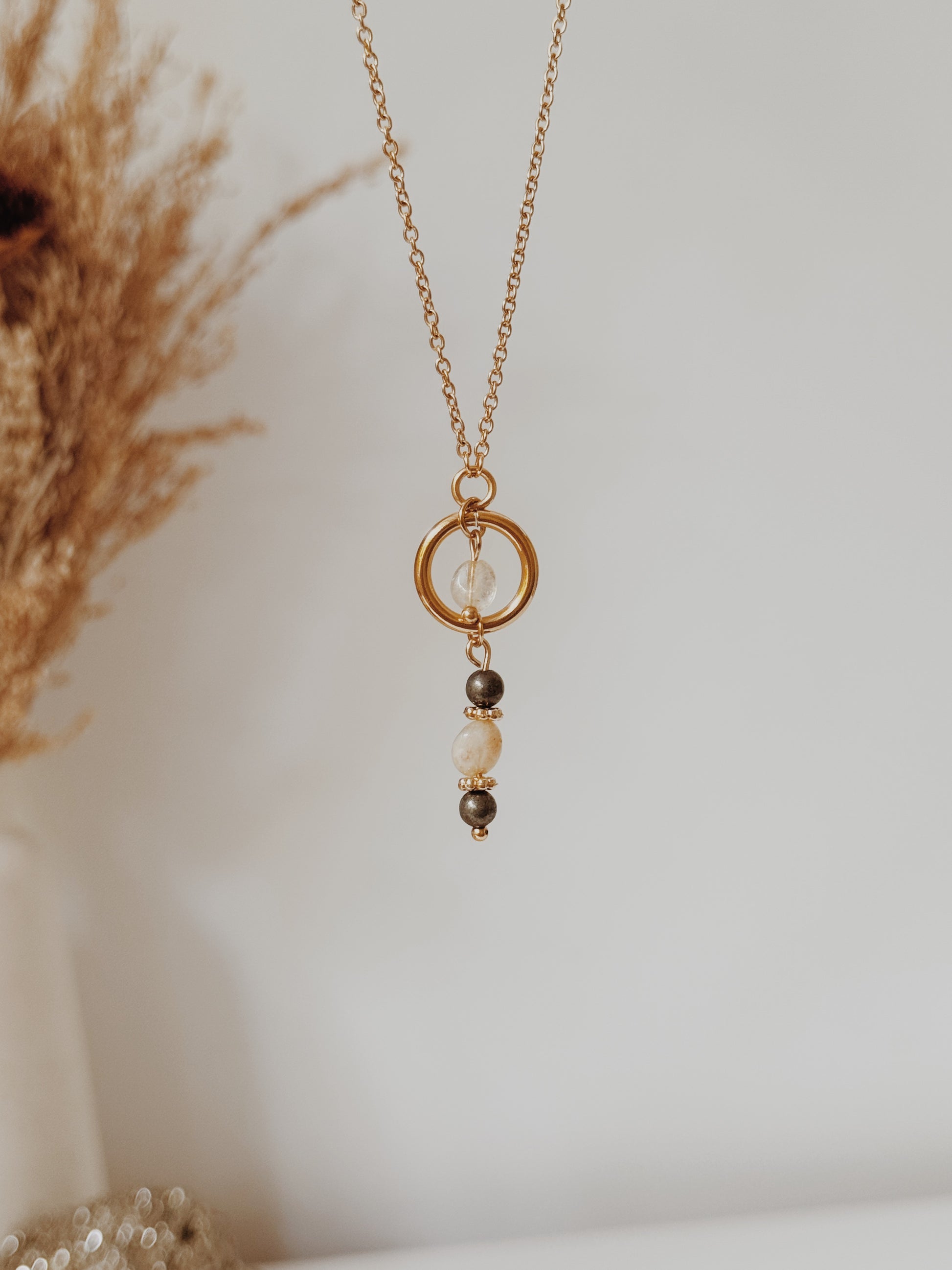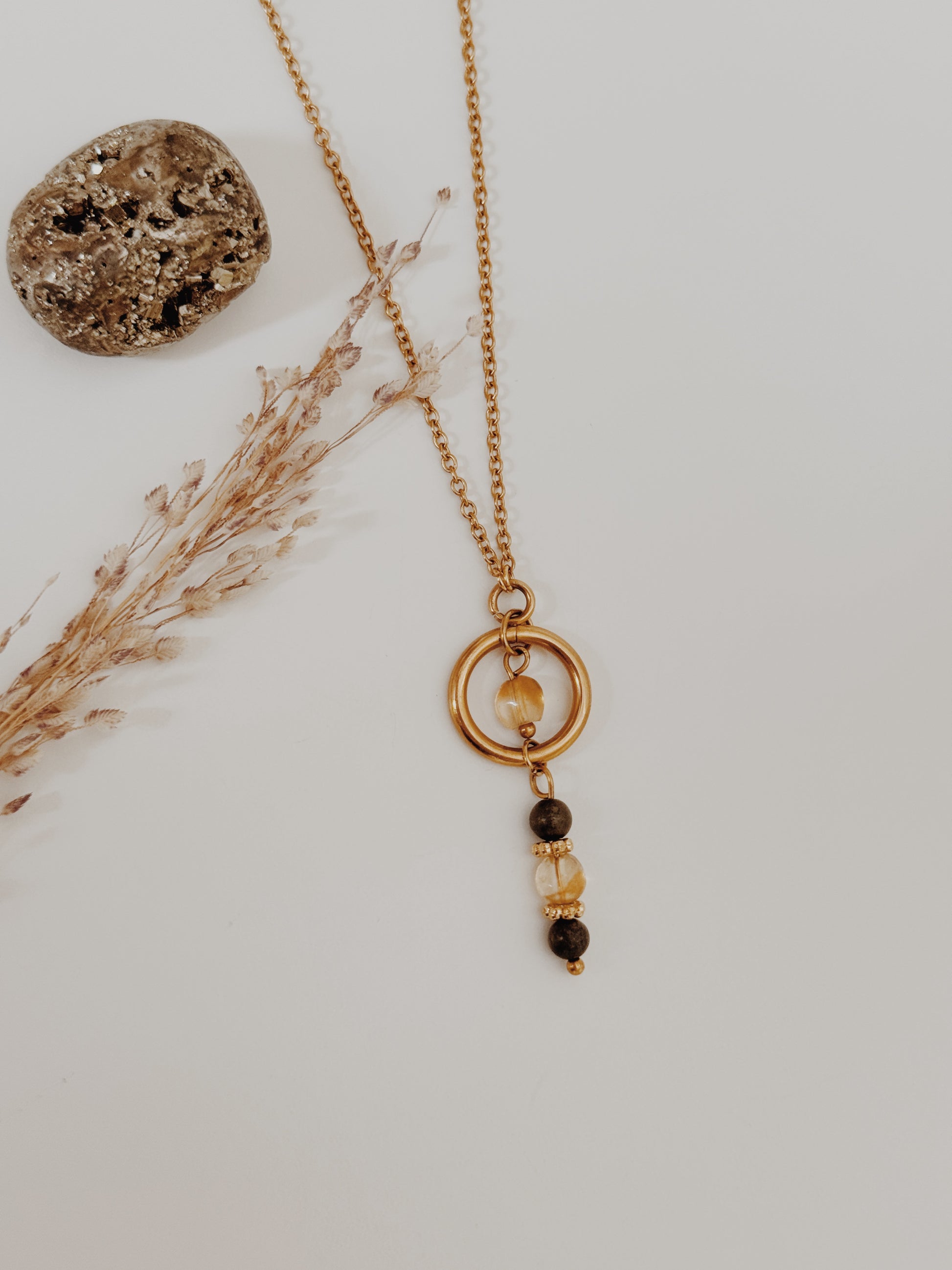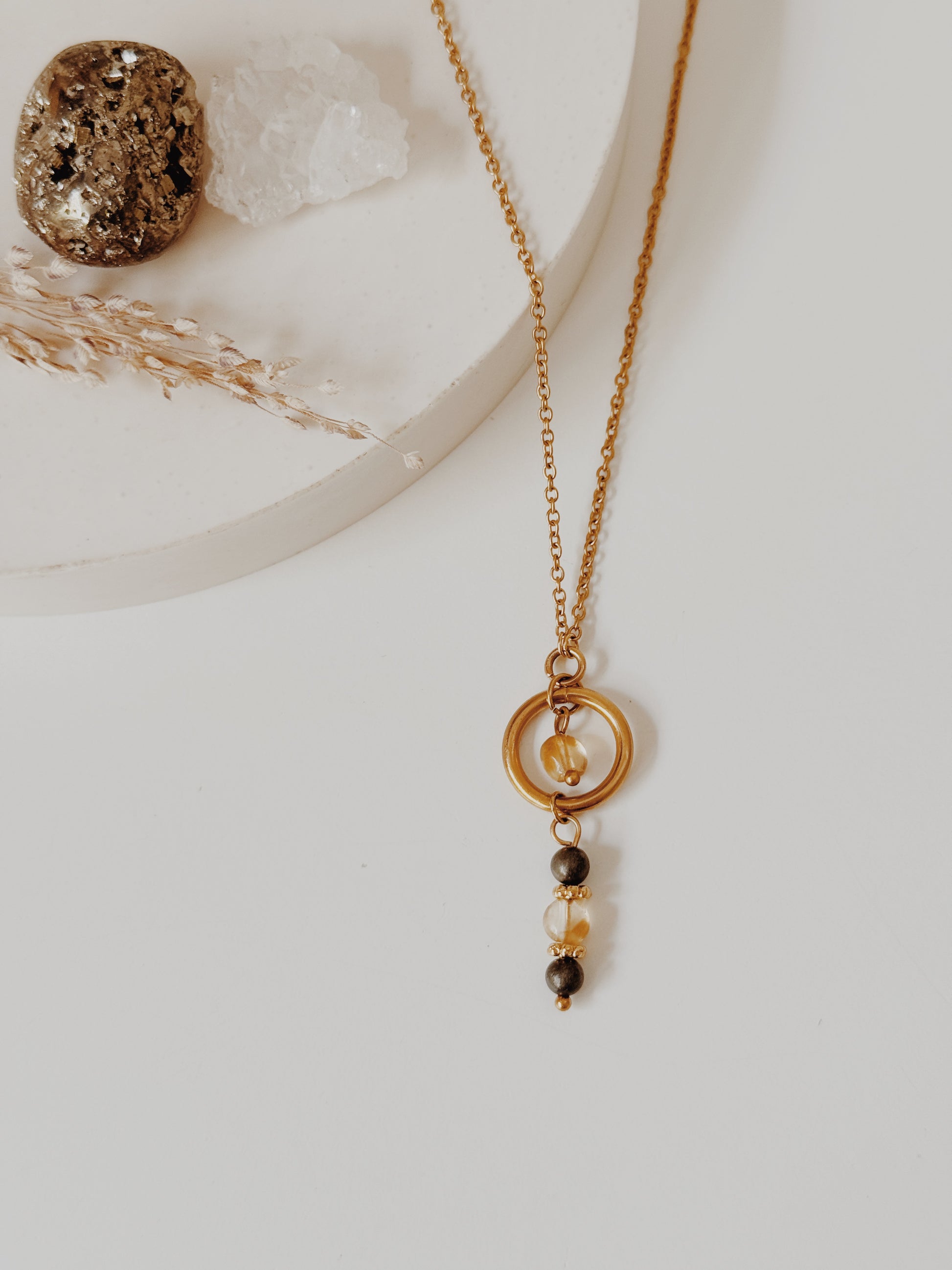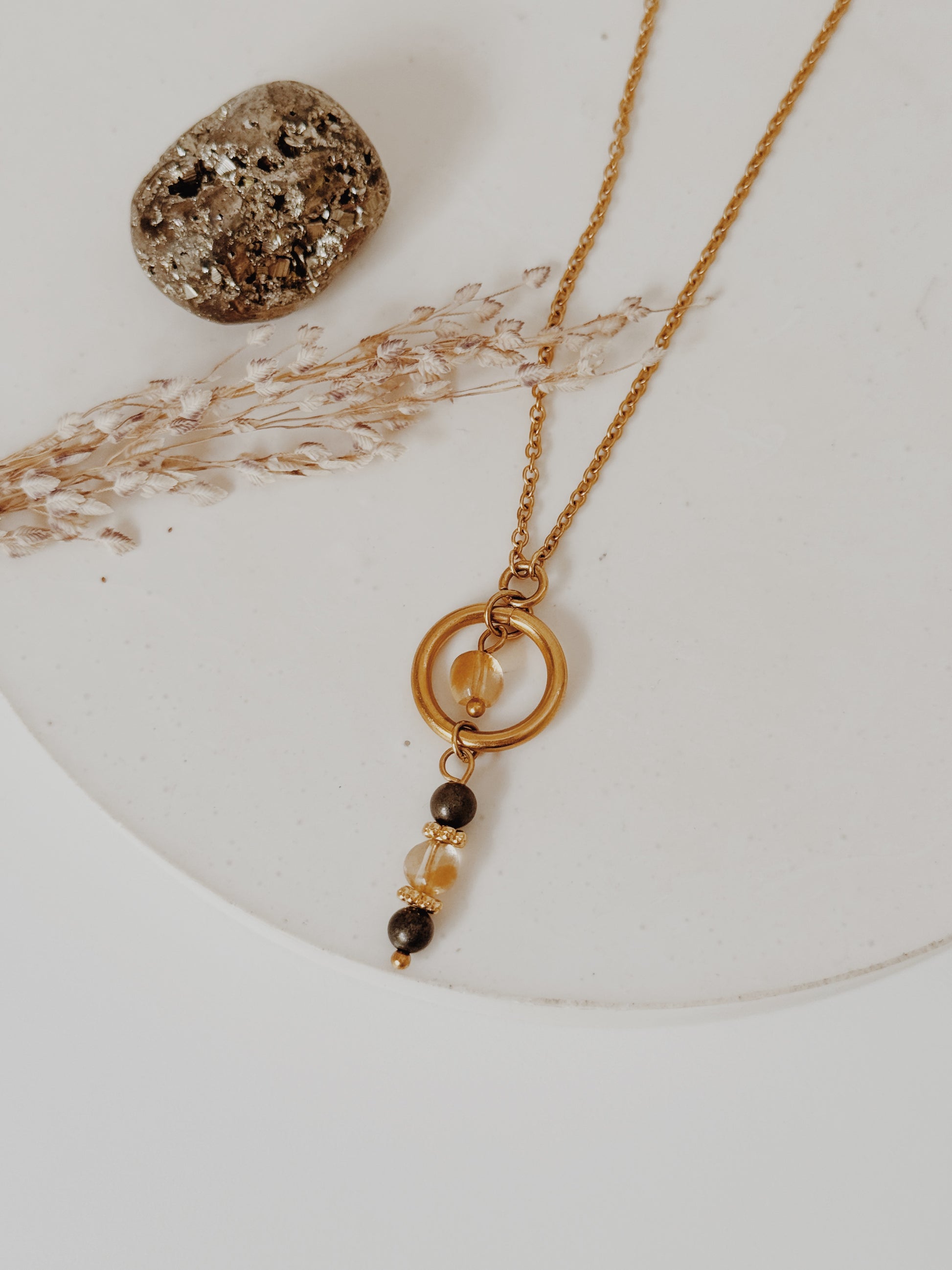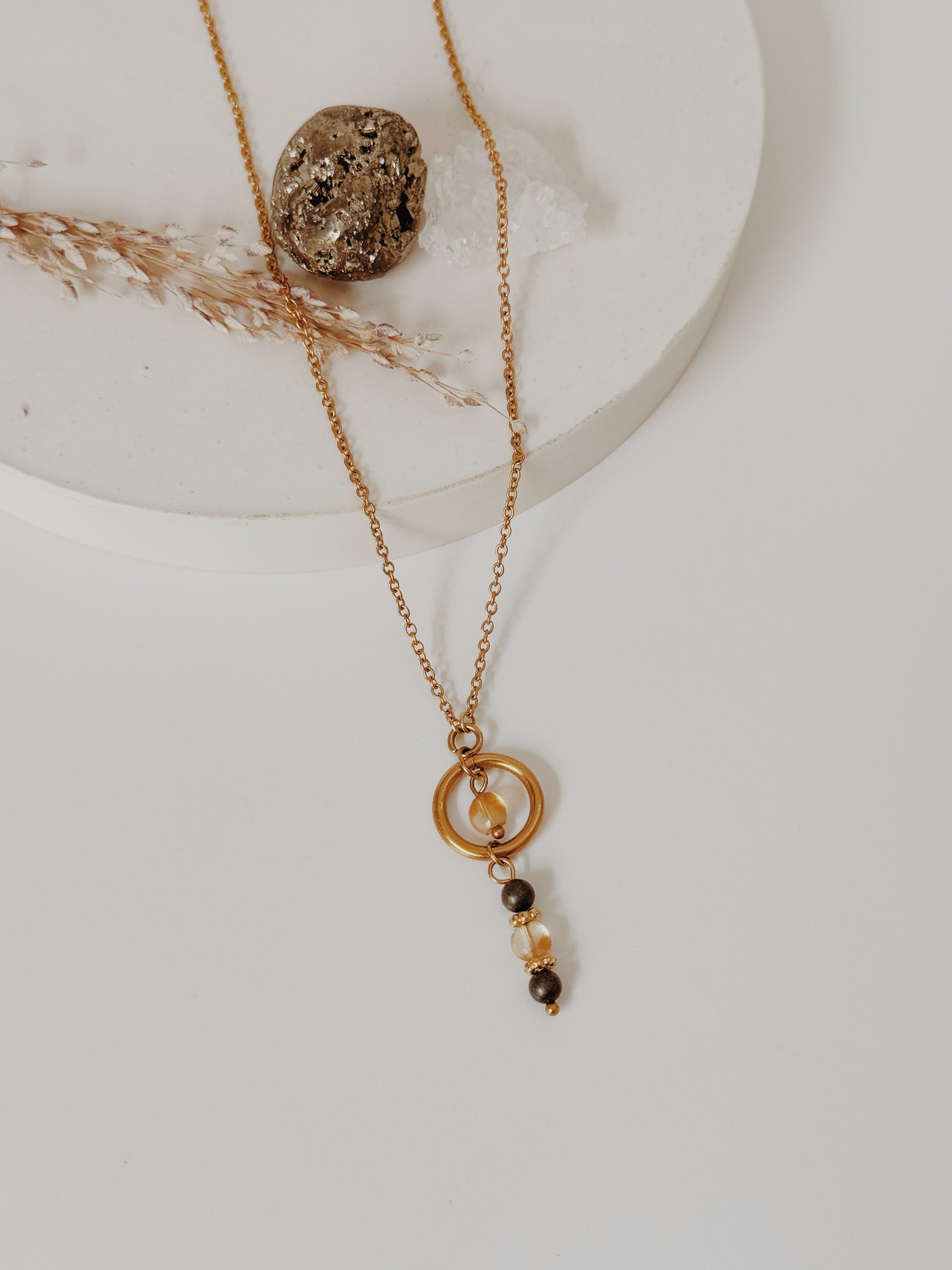 Combinando a energia do Citrino e da Pirite, este amuleto atua como um canalizador de energia de prosperidade, clareza e manifestação com alma. Representa o fluxo natural da abundância quando estás alinhada com quem realmente és.