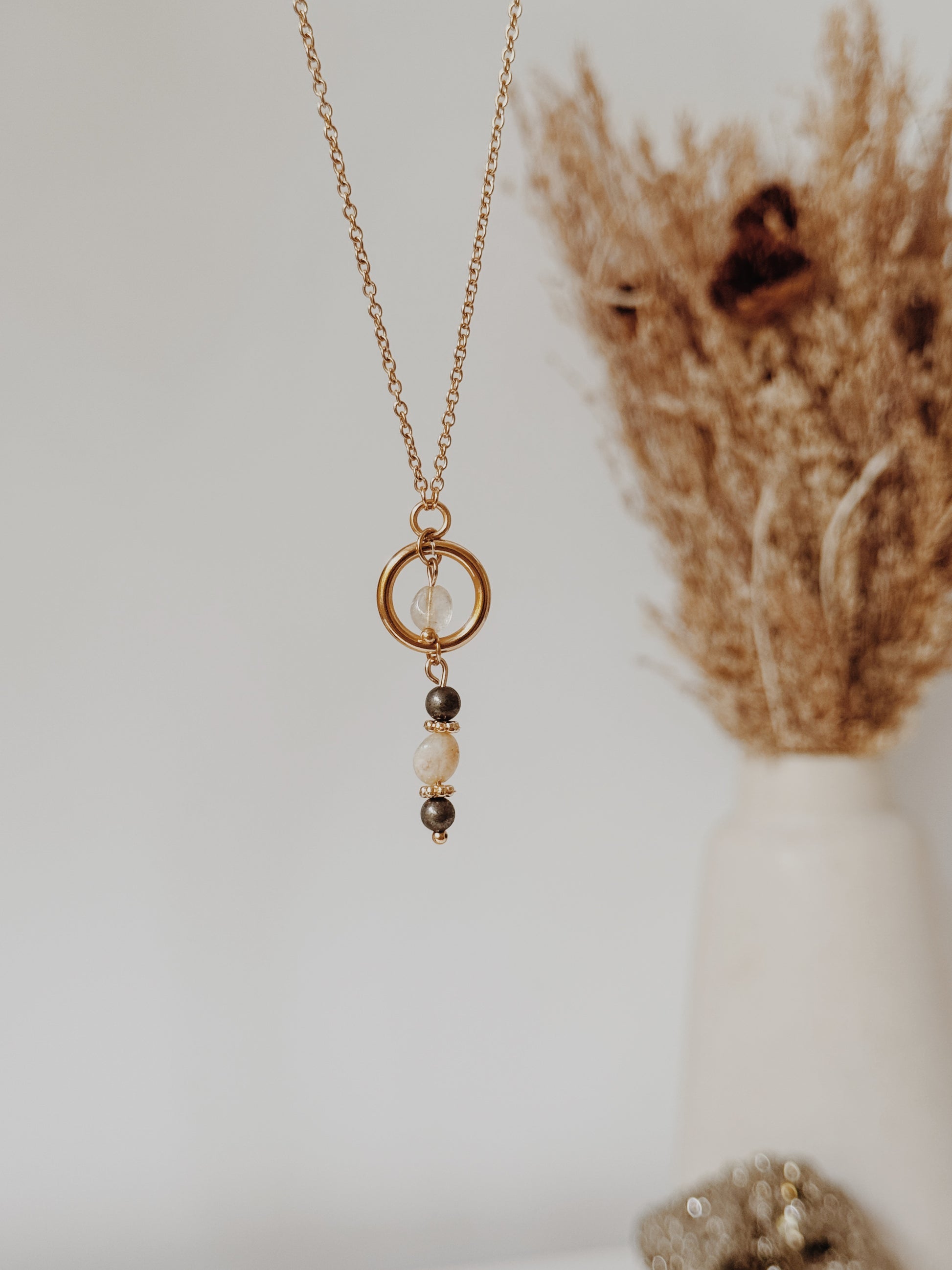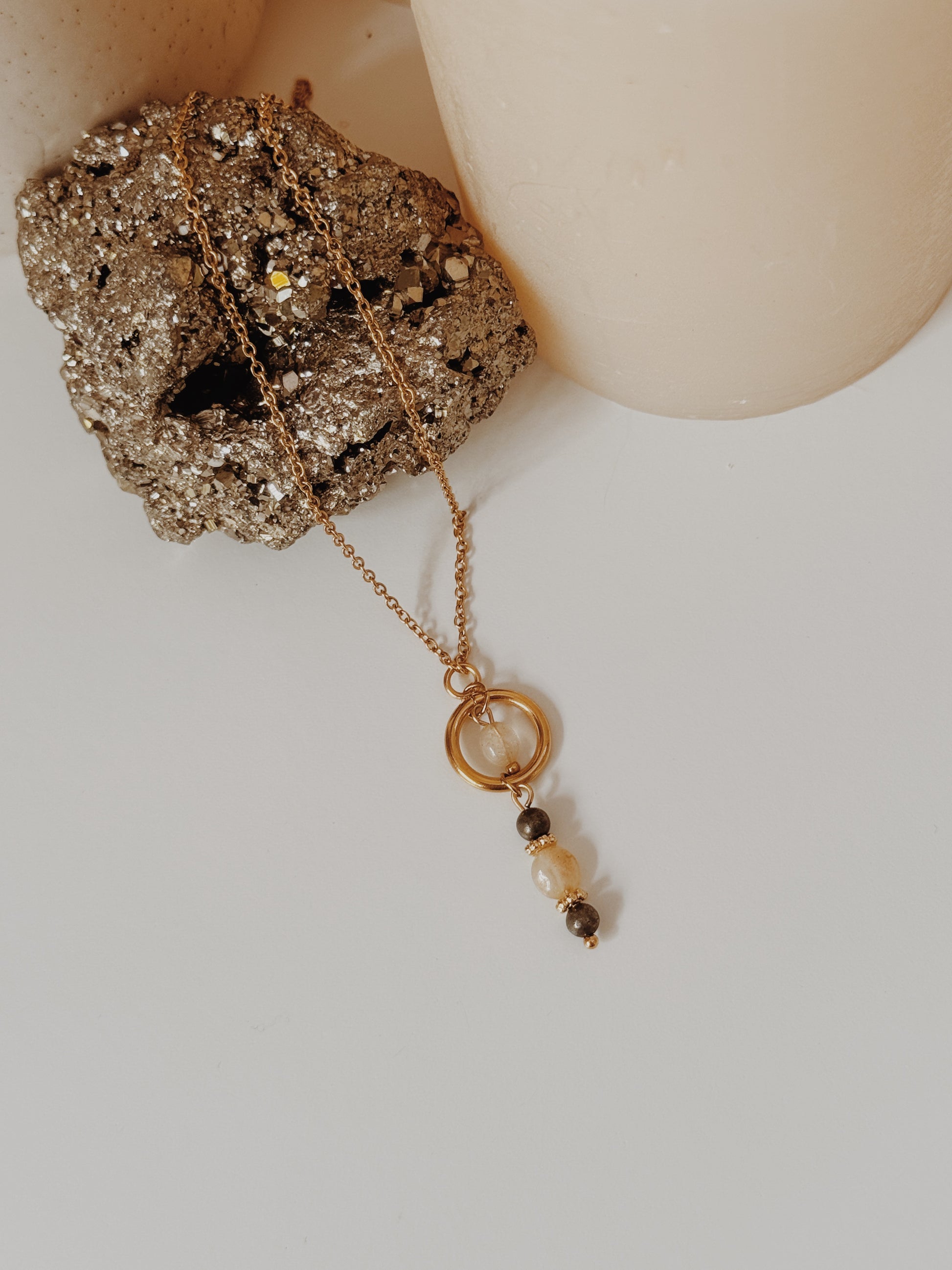 Este colar é um amuleto de manifestação e conexão, foi criado num momento muito especial, quando decidi transformar o meu bloqueio com a abundância em poder pessoal e verdade interior.