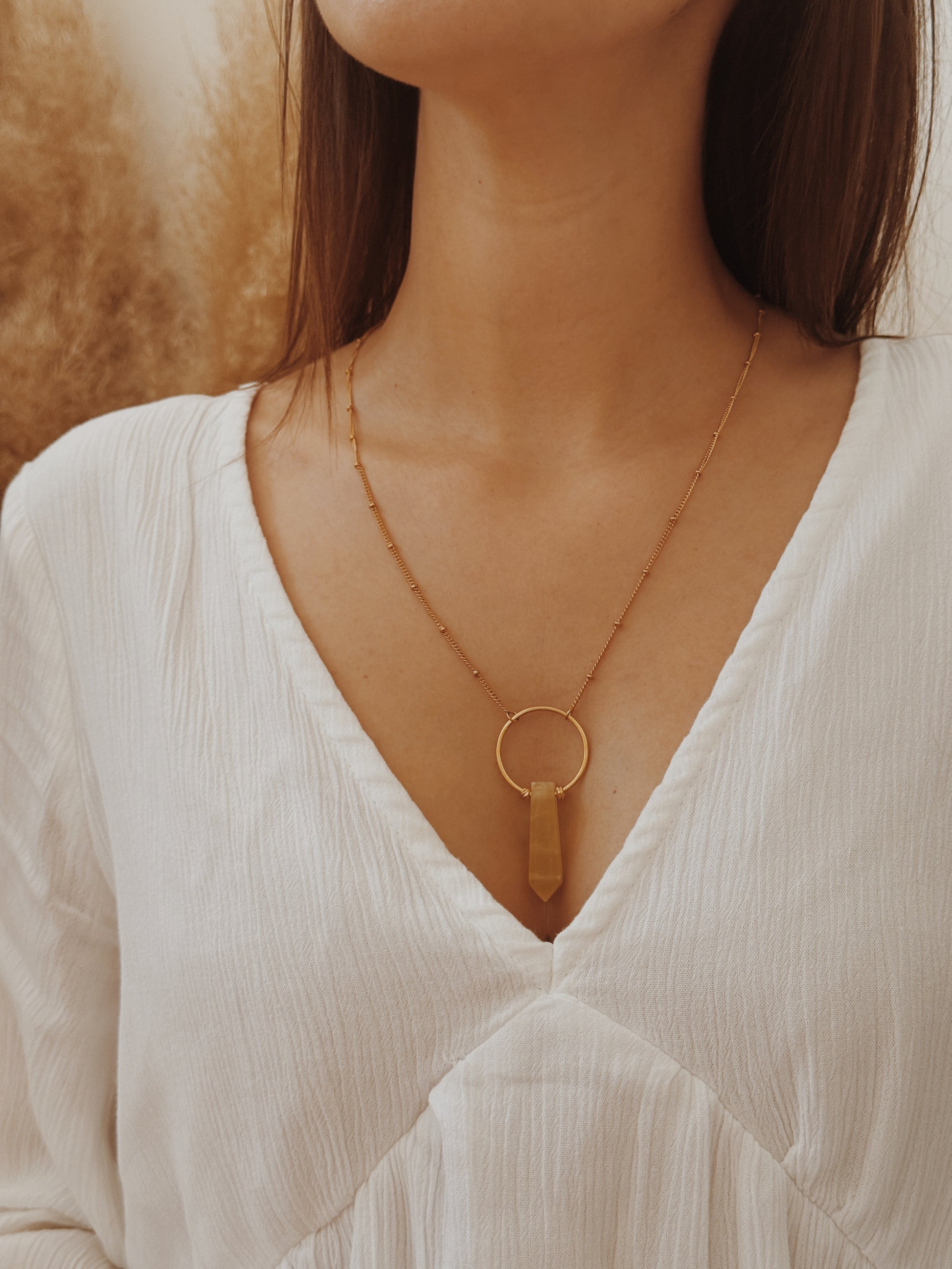 O colar Agni é um símbolo de transformação na tua vida. Composto por uma bela Calcite Limão , esta peça é um lembrete de esperança e confiança em ti mesma.