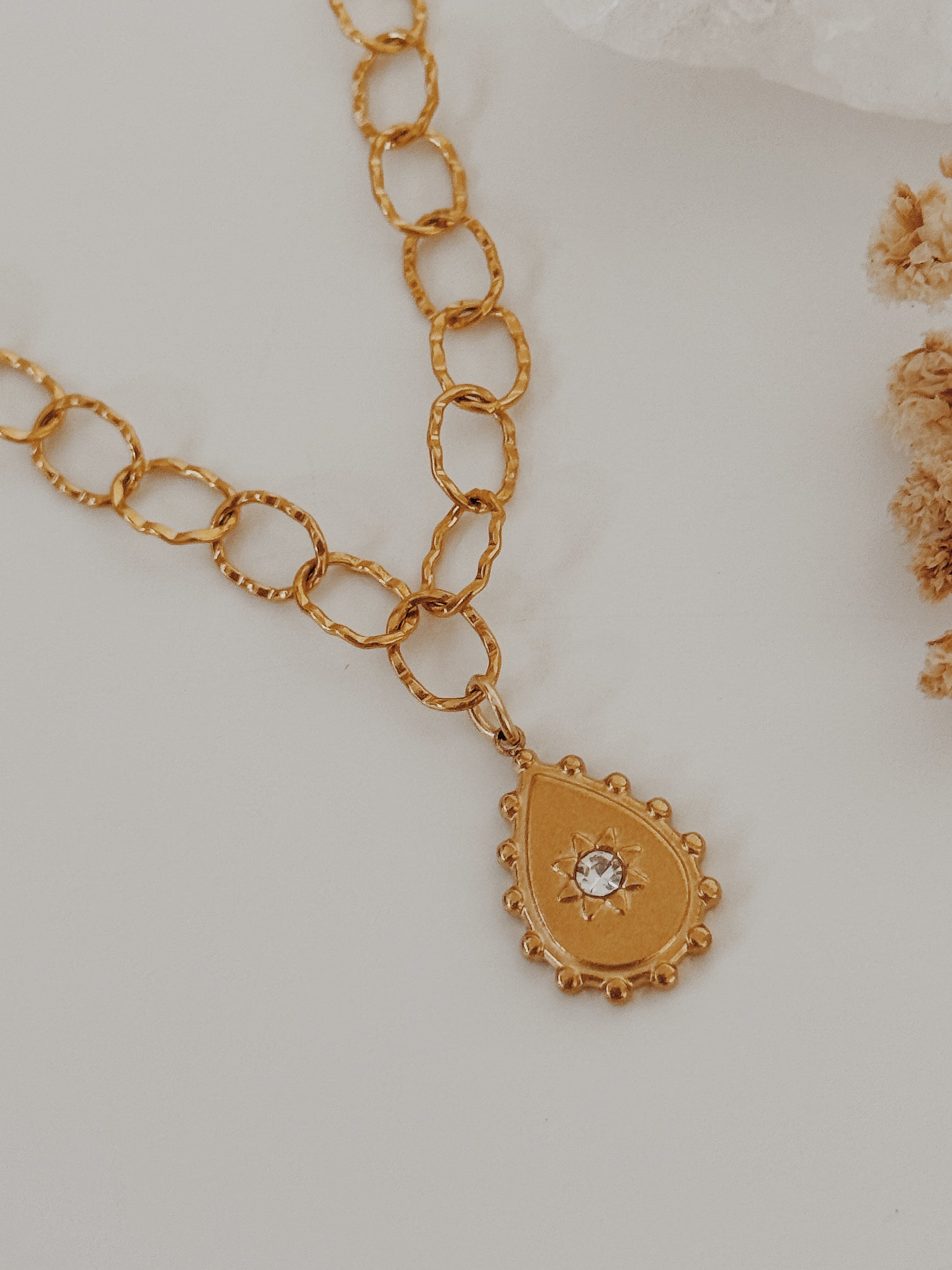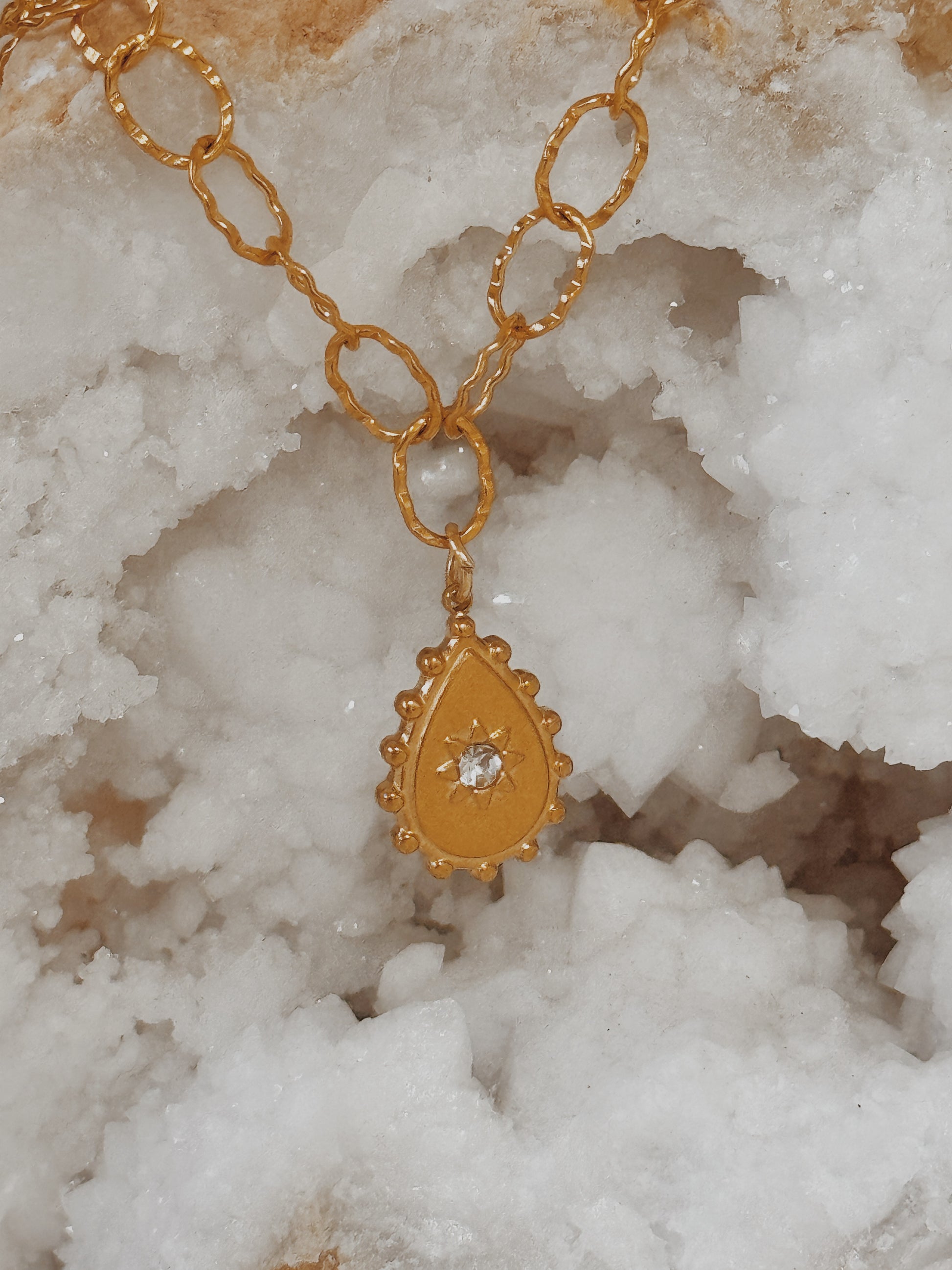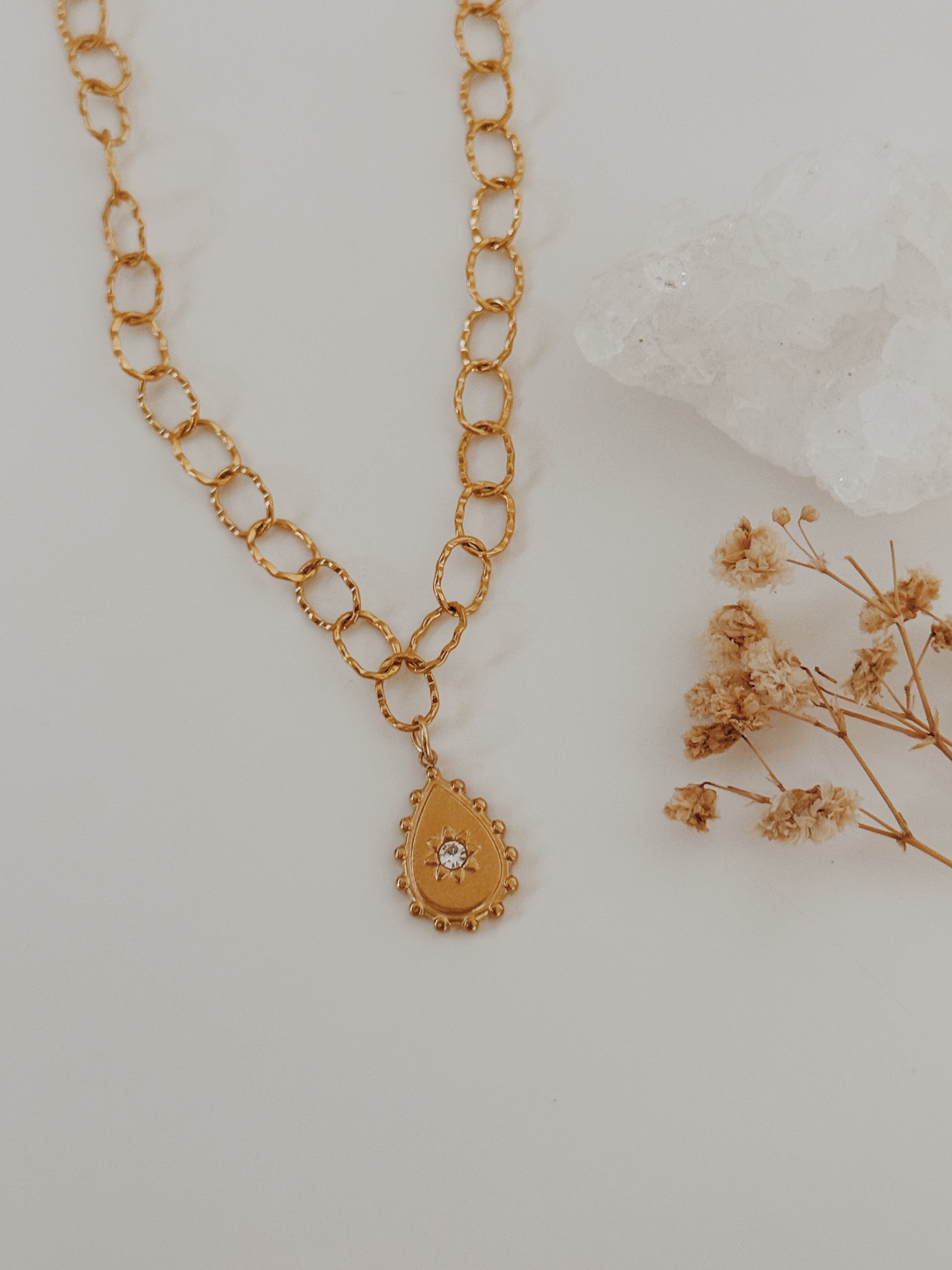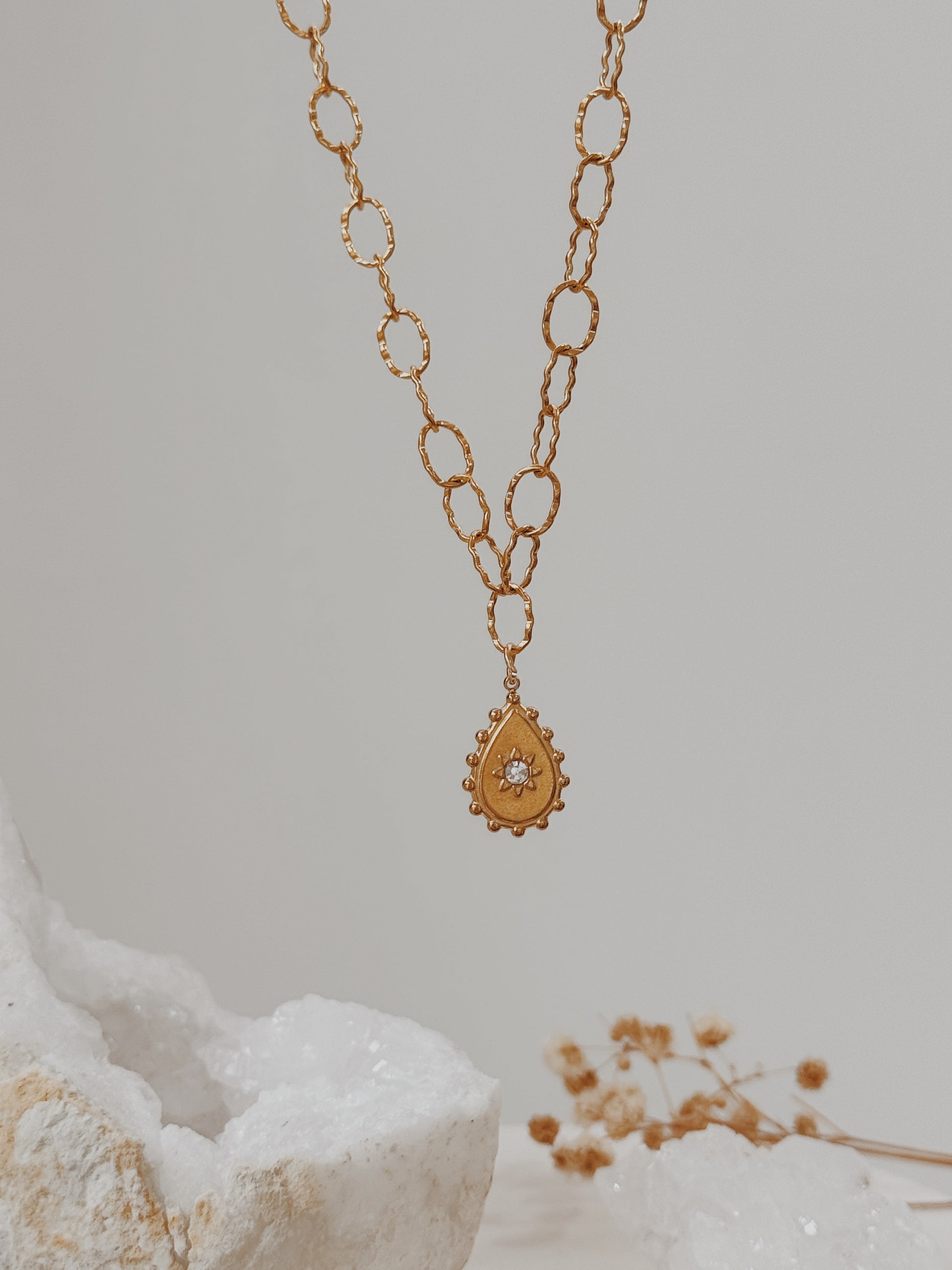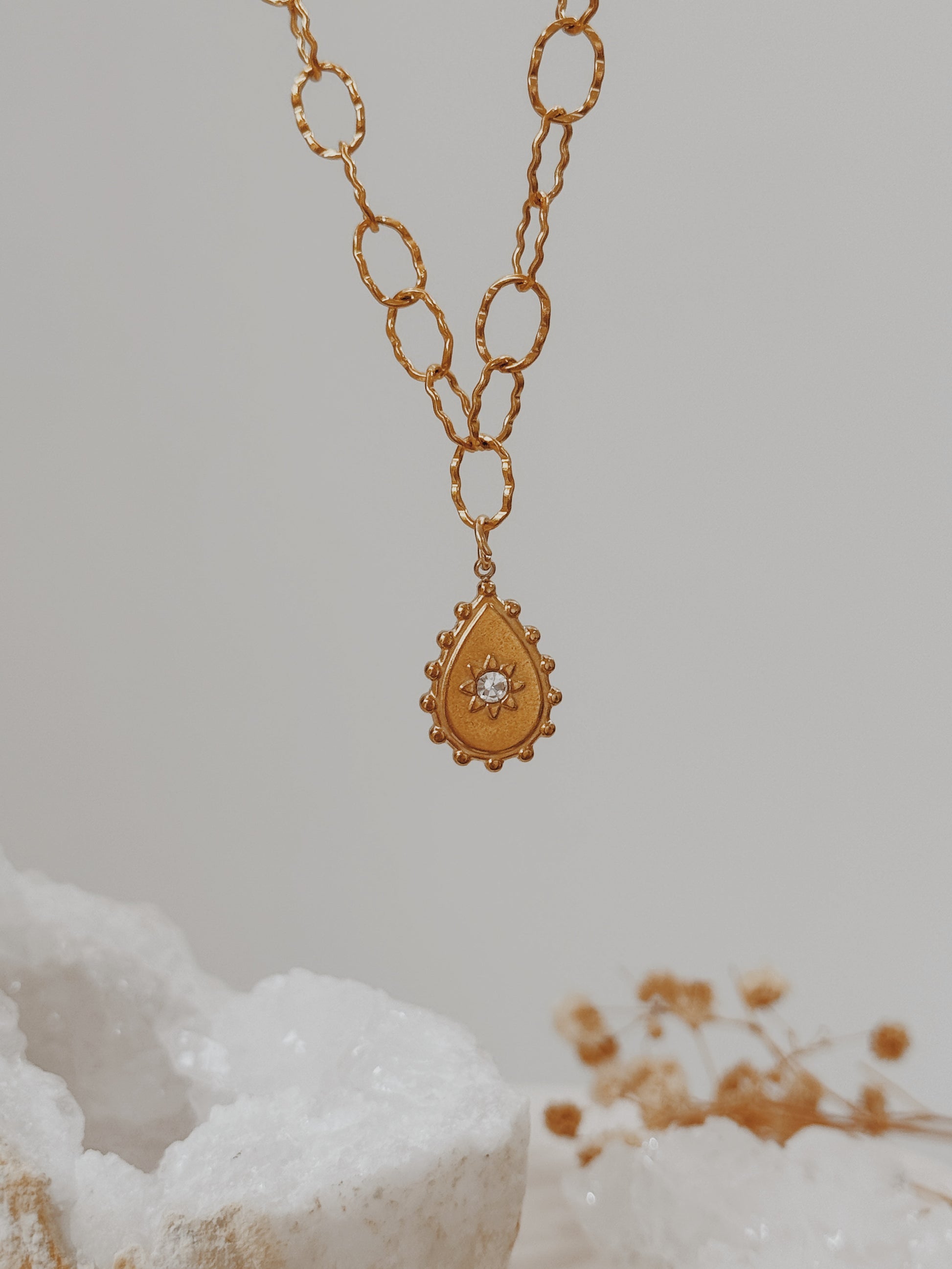 O colar beky é o complemento perfeito para utilizares juntamente com os teus acessórios cristalinos. O ornamento principal desta peça destaca-se bem no centro do colar, uma bela gota dornada com uma zirconia no centro.
