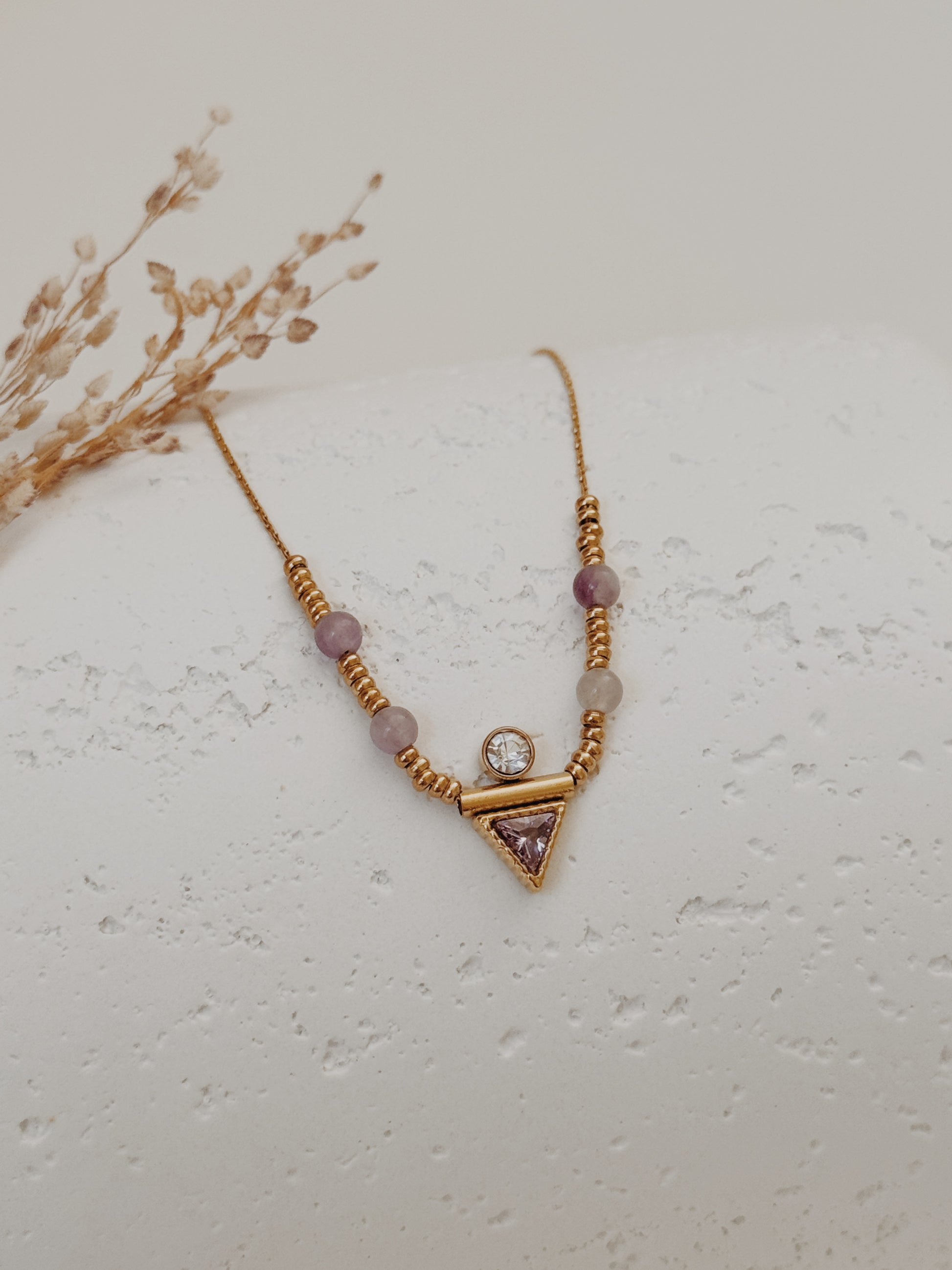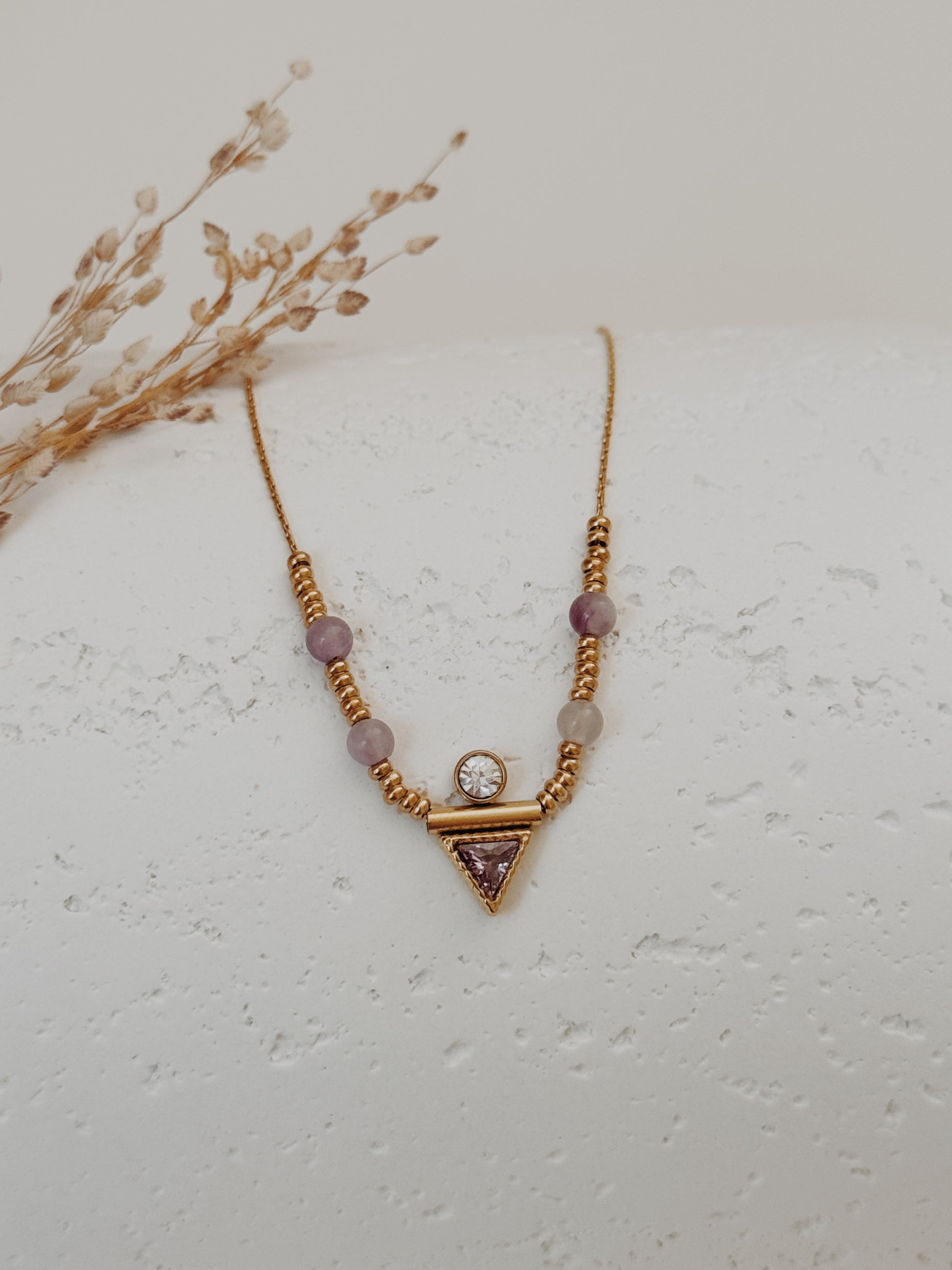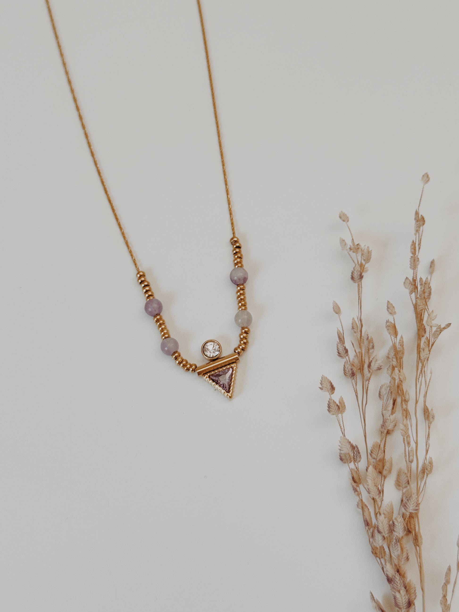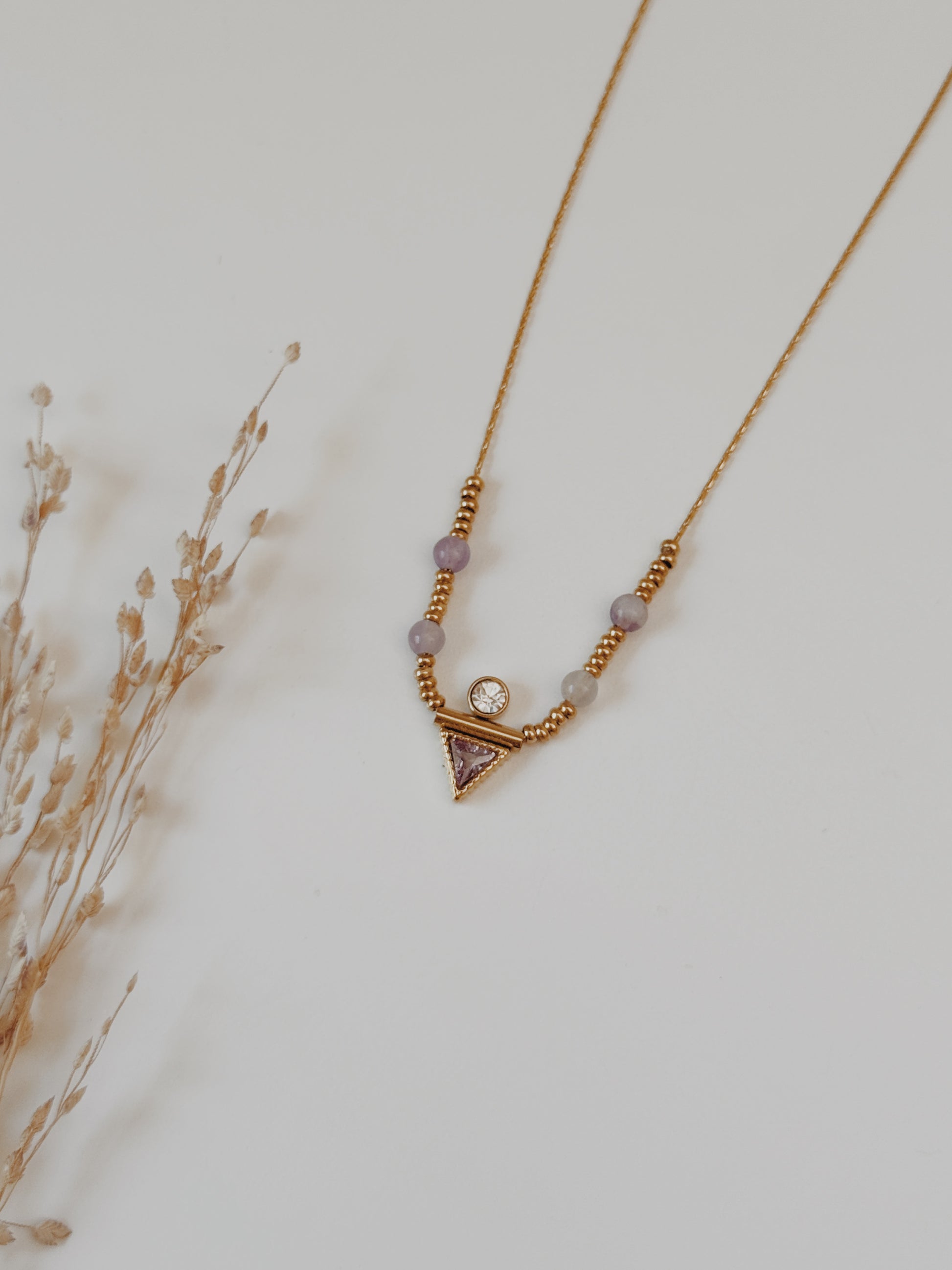 Com a sua energia tranquila e espiritual, a Ametista é uma pedra de paz interior, clareza mental e conexão com o que é essencial. No centro do colar, o triângulo com zircónia lilás simboliza equilíbrio entre corpo, mente e alma.