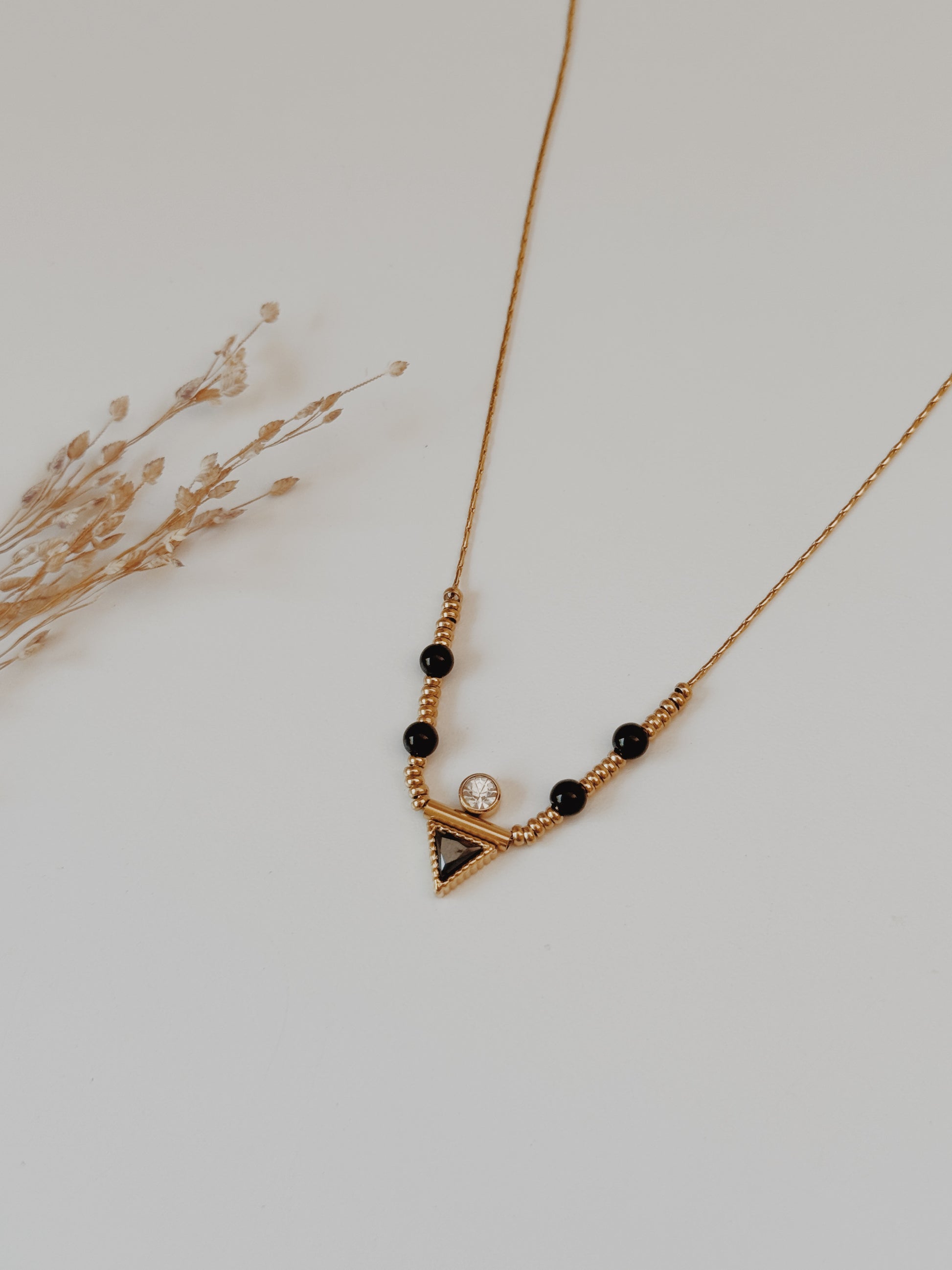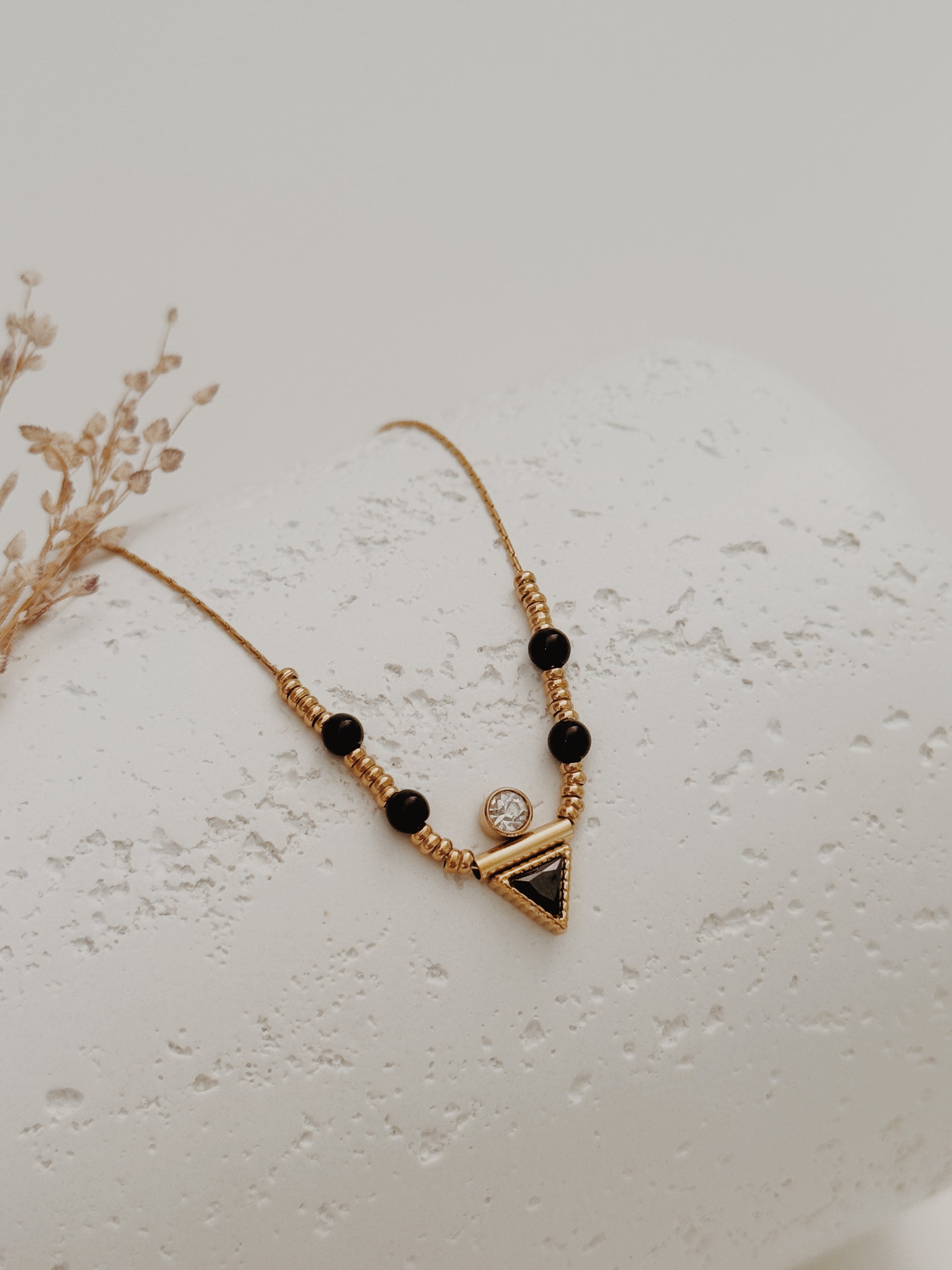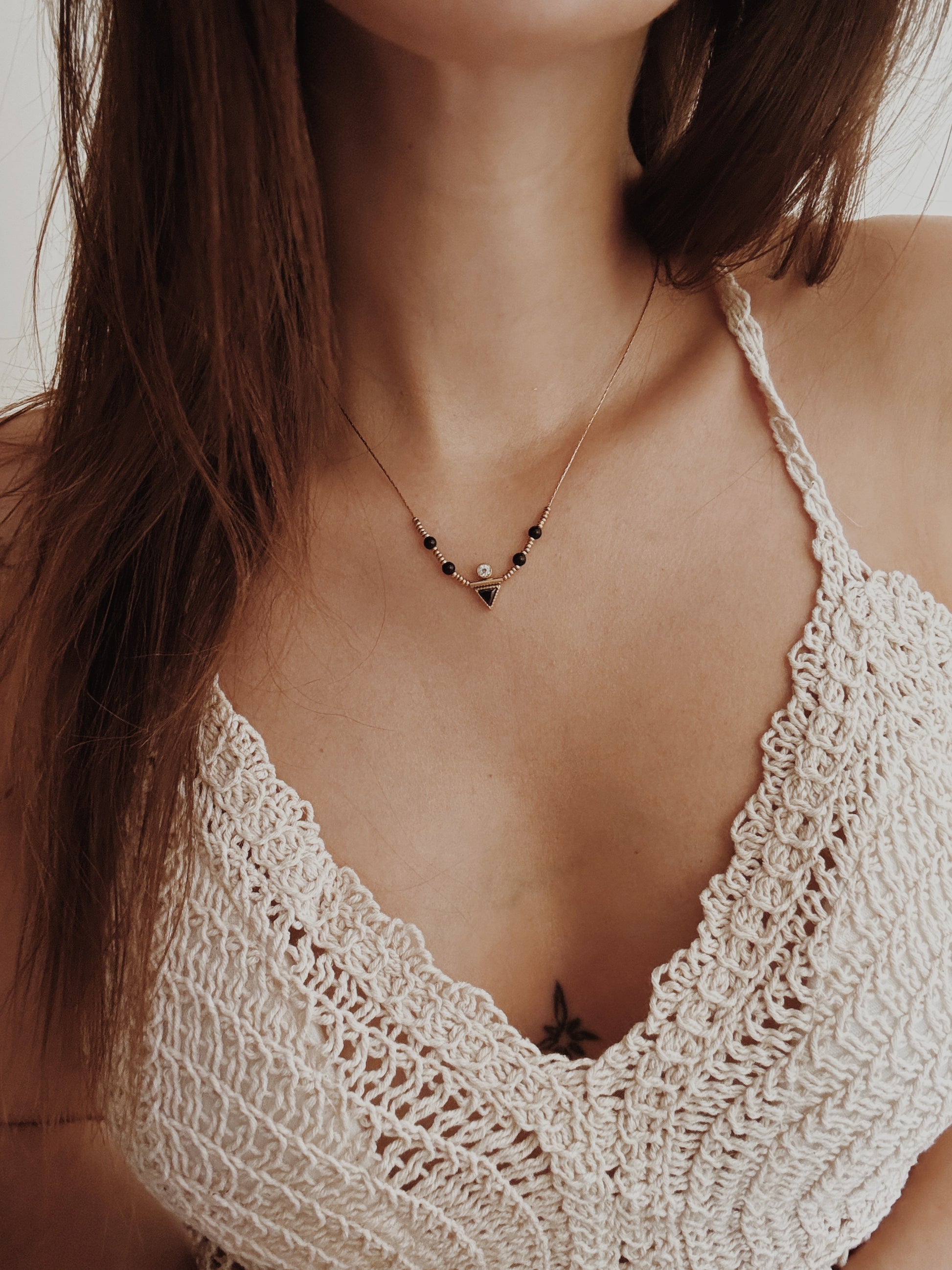 Este colar carrega a força do Ônix, um cristal de proteção e firmeza interior. Ideal para momentos em que precisas de te manter centrada, com os pés bem assentes na terra. O triângulo central com zircónia preta representa o poder silencioso da estabilidade e da presença.