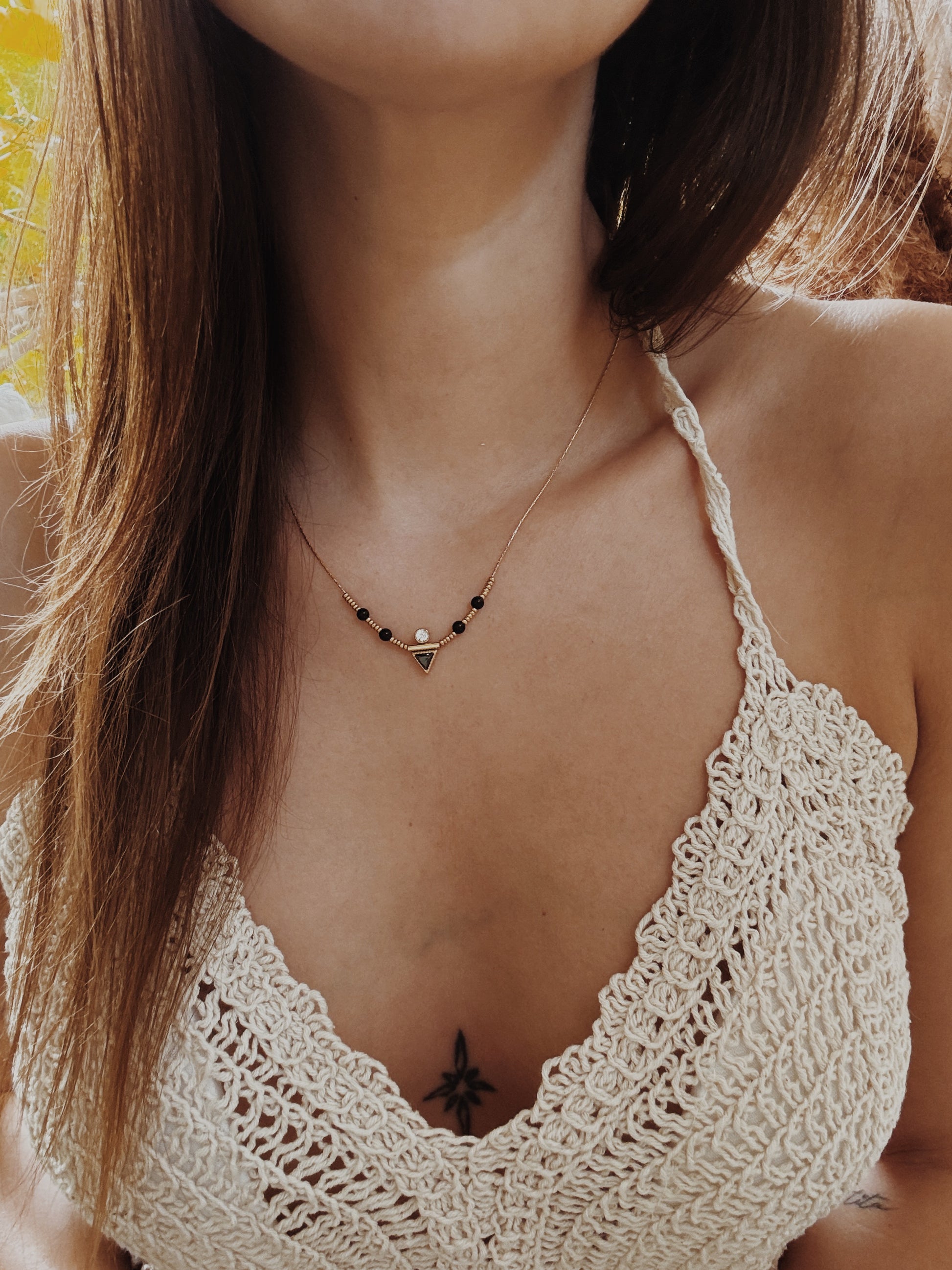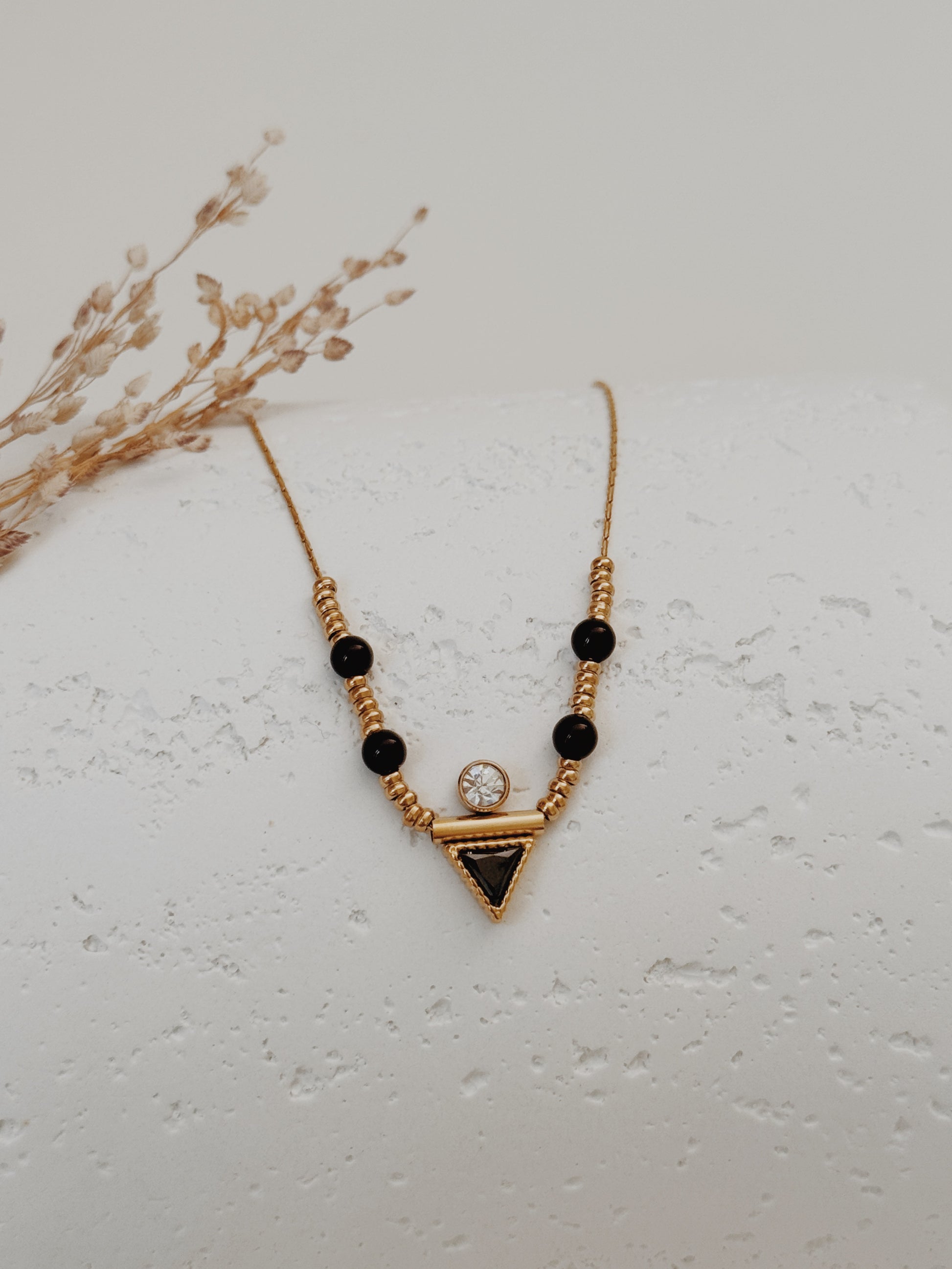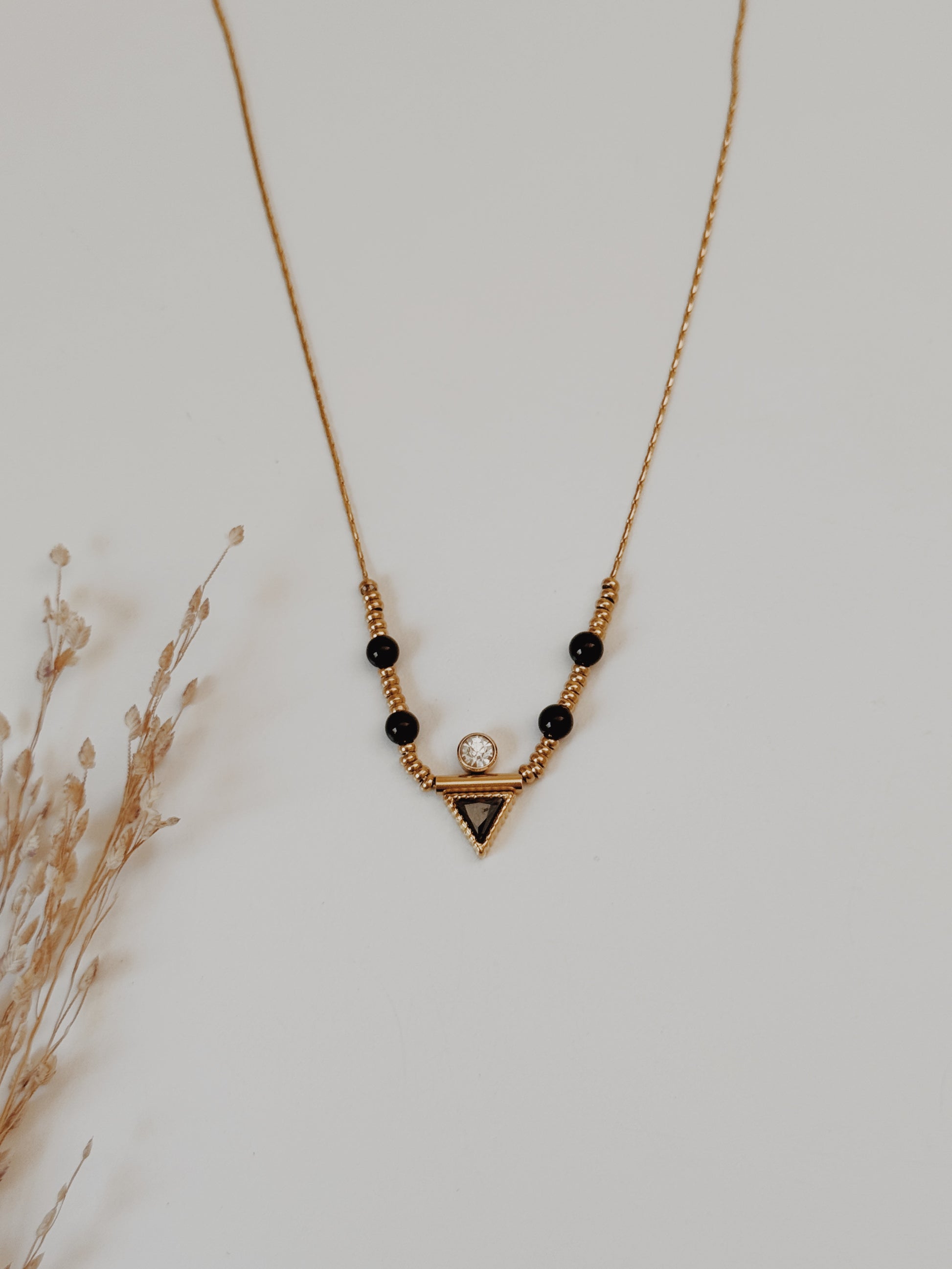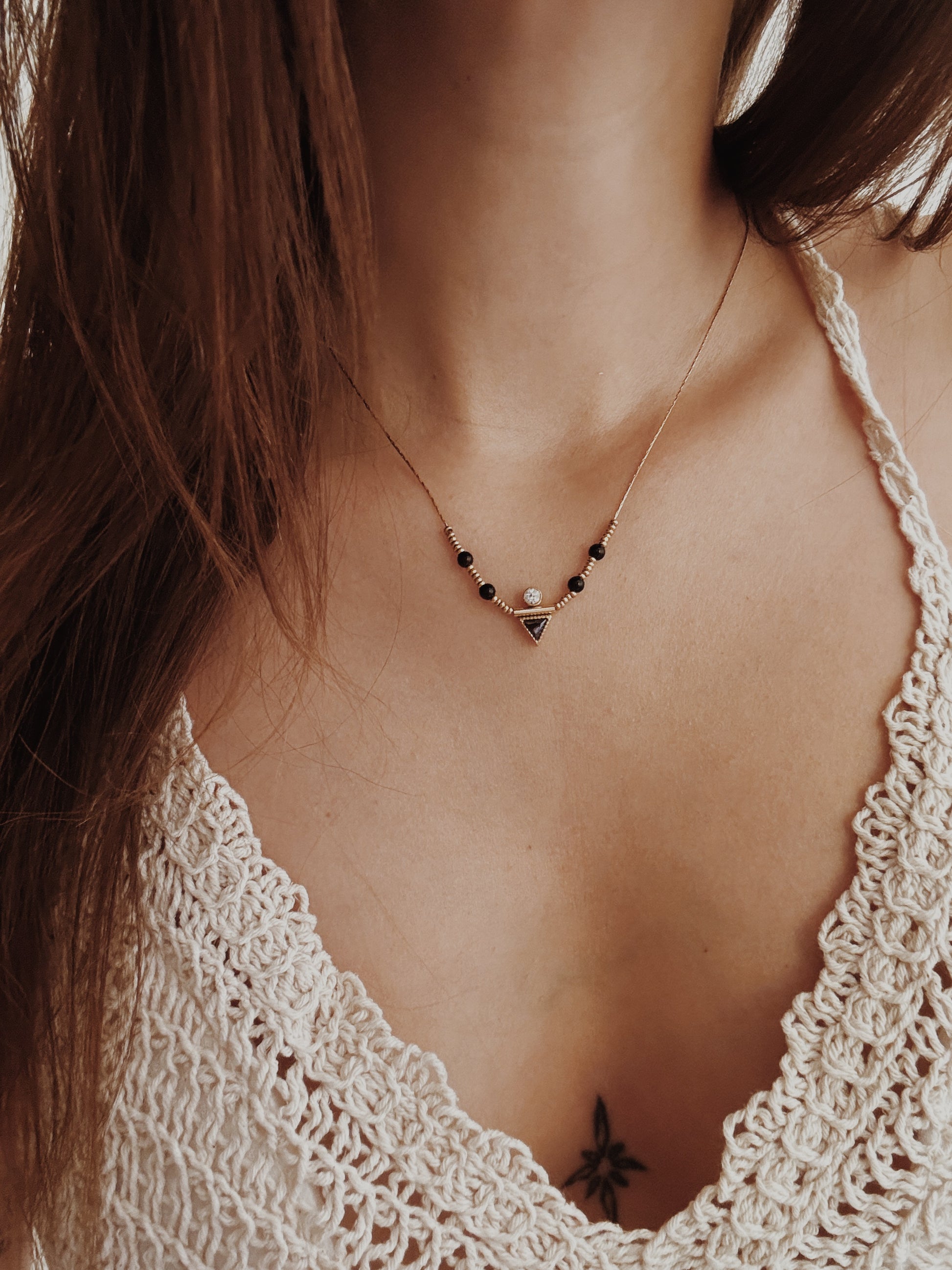 Este colar carrega a força do Ônix, um cristal de proteção e firmeza interior. Ideal para momentos em que precisas de te manter centrada, com os pés bem assentes na terra. O triângulo central com zircónia preta representa o poder silencioso da estabilidade e da presença.