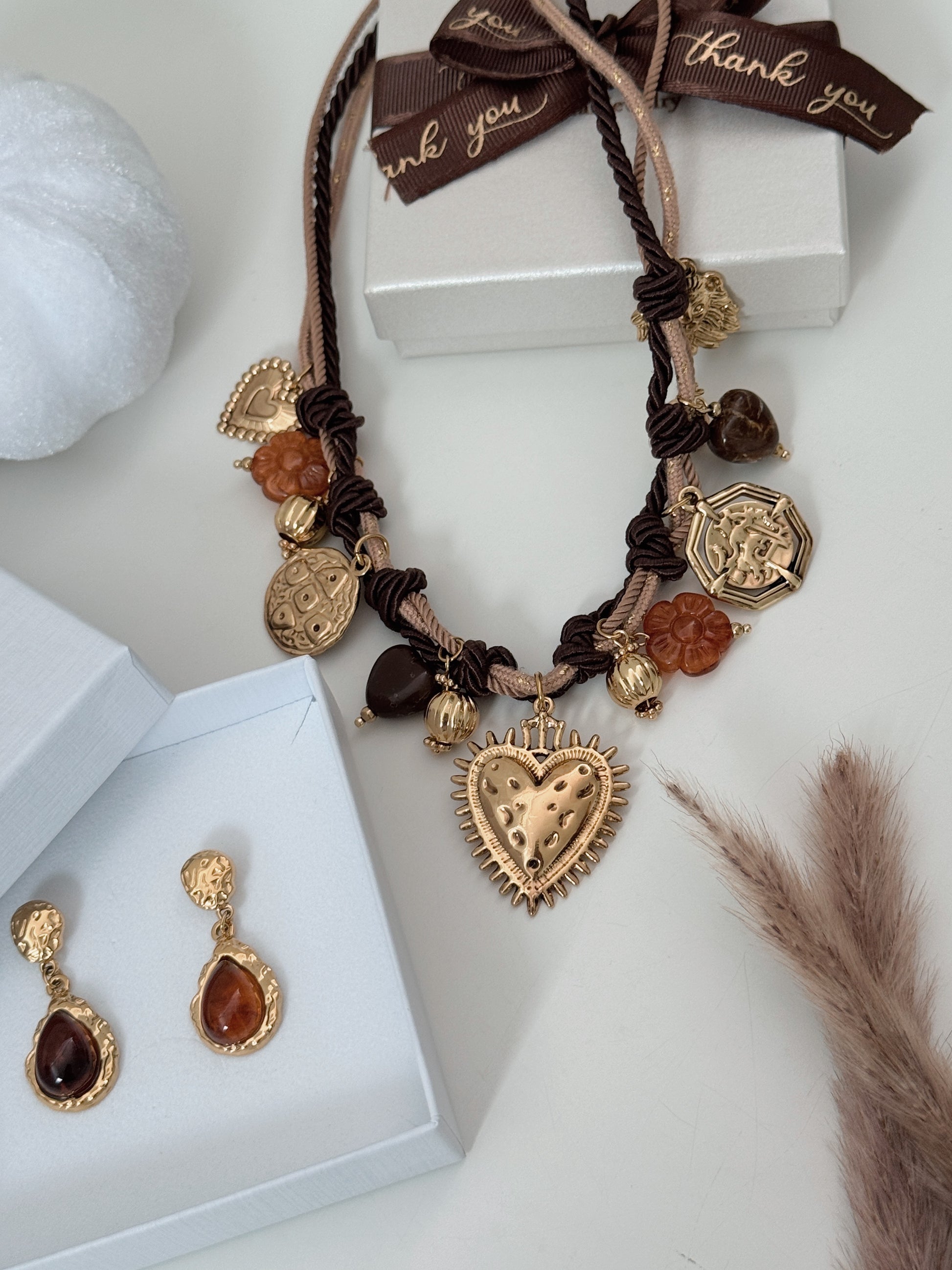 O colar charm love é a fusão entre o brilho do dourado e os tons terrosos do outono, uma peça que combina elegância e simbolismo. Os seus pendentes dourados e castanhos representam os ciclos da natureza, a proteção e a força interior que o outono desperta. Mais do que um acessório, é um amuleto de energia positiva, perfeito para realçar o teu estilo com um toque boémio e amoroso.