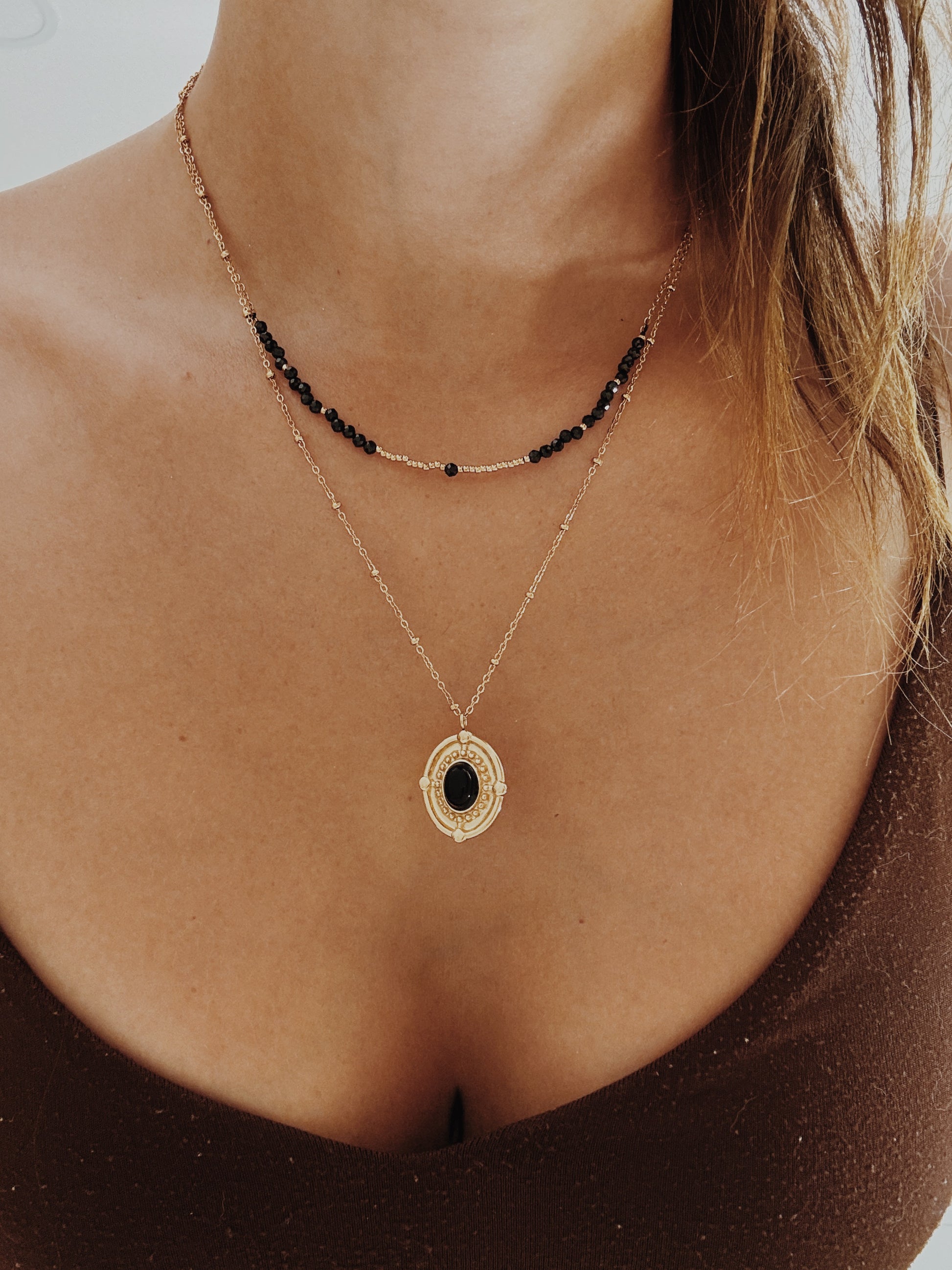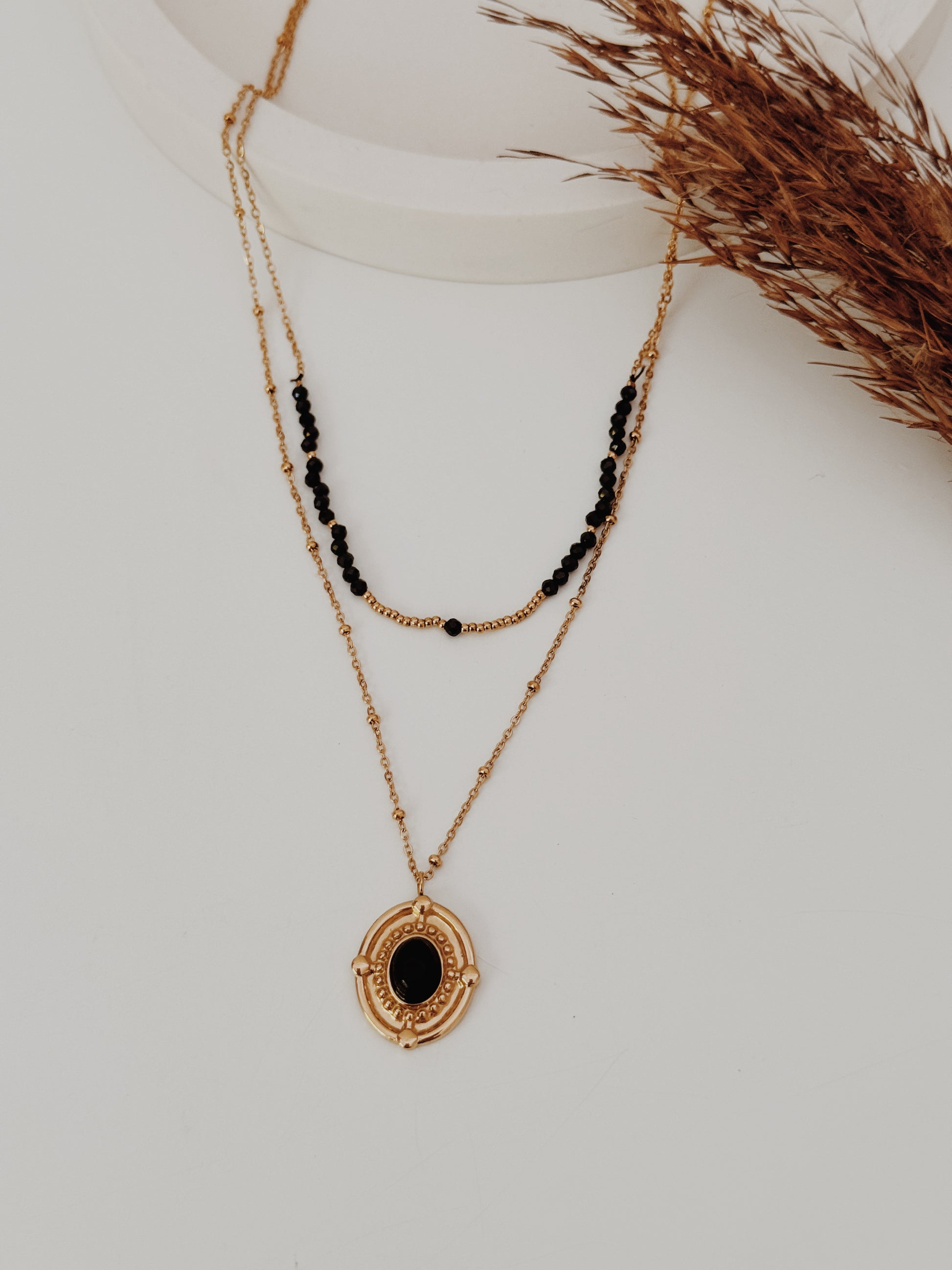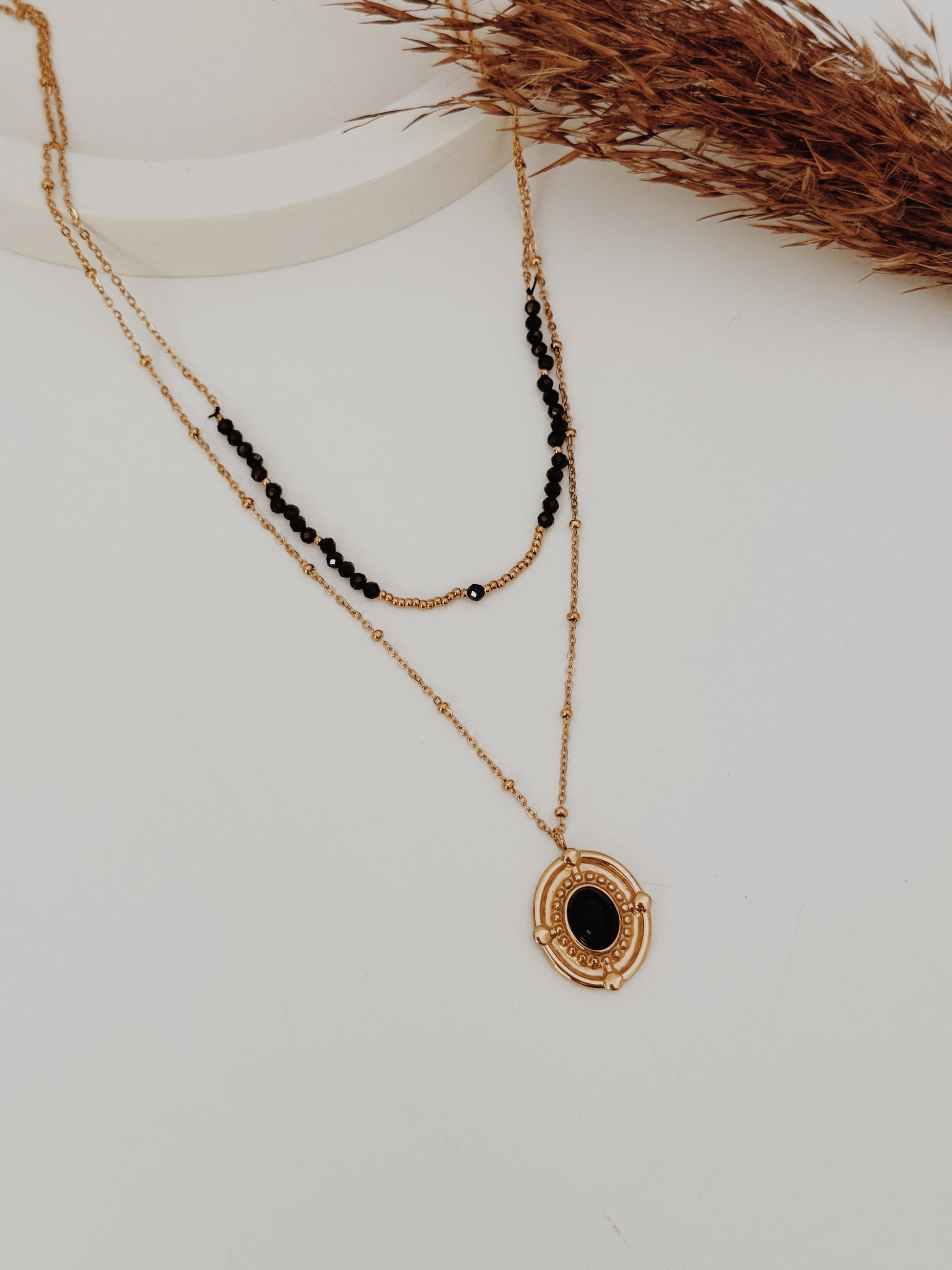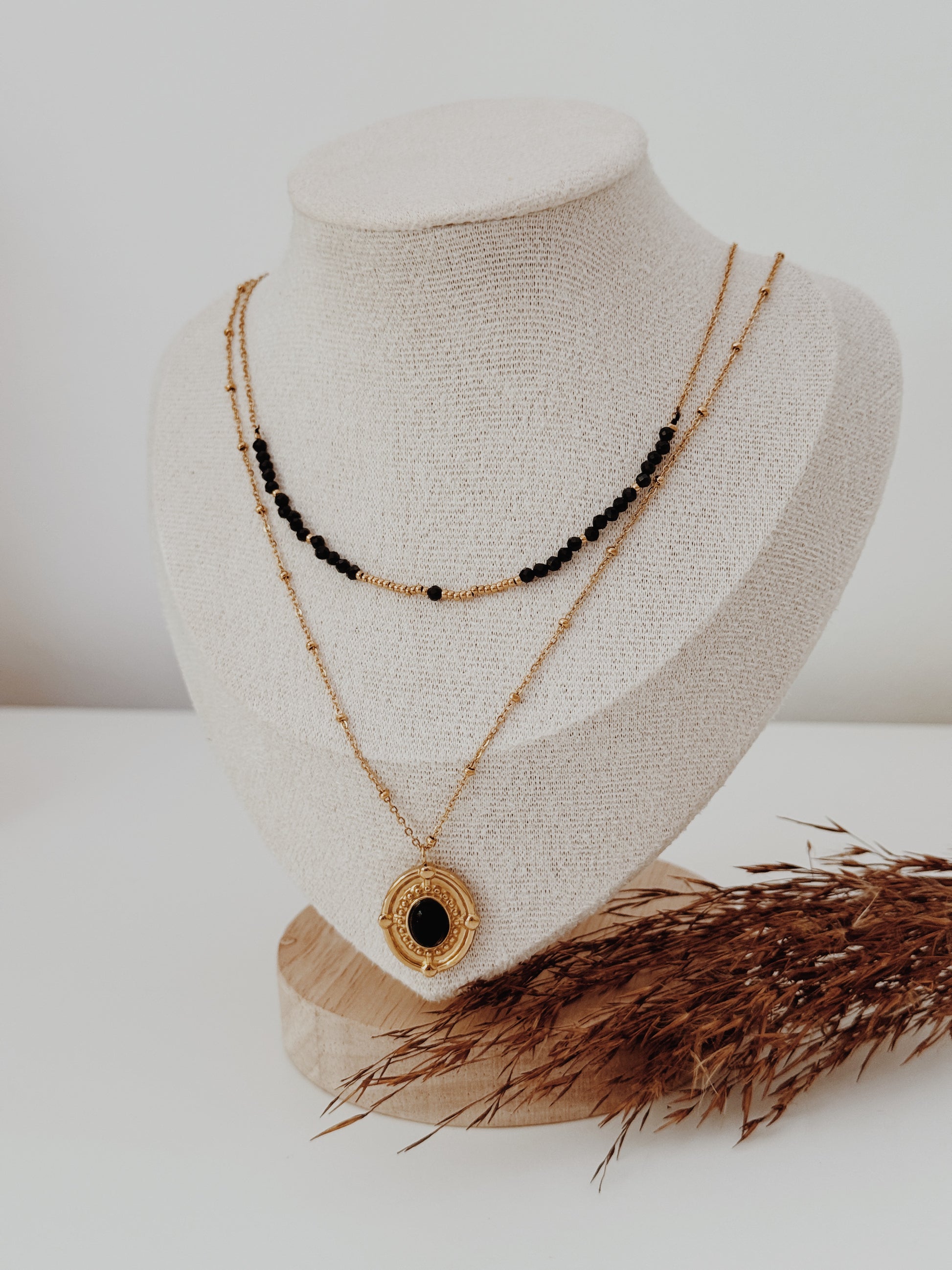 Um colar com duas camadas que une a força da Turmalina negra e a estabilidade do Onix , criando um escudo protetor contra energias negativas e influências externas.