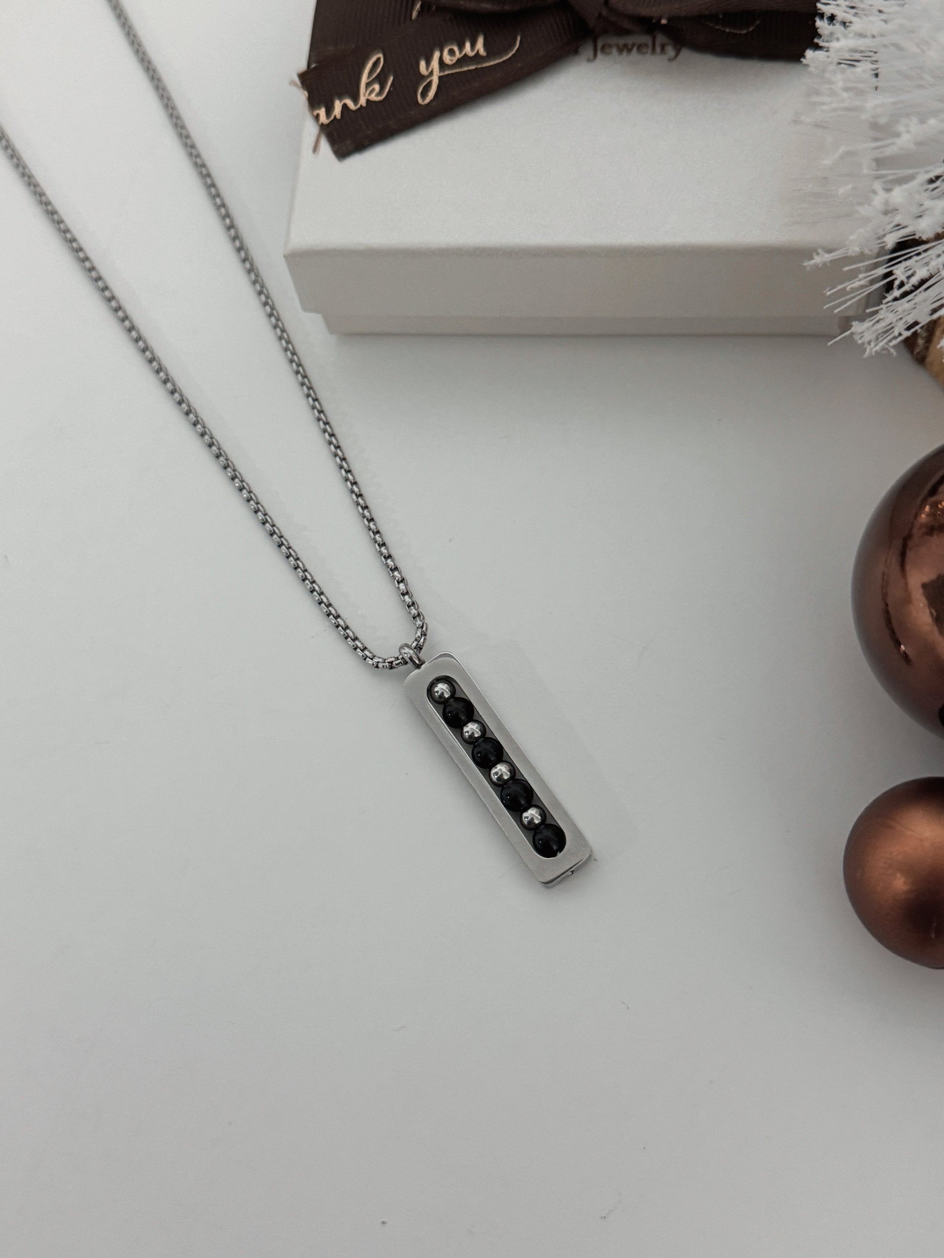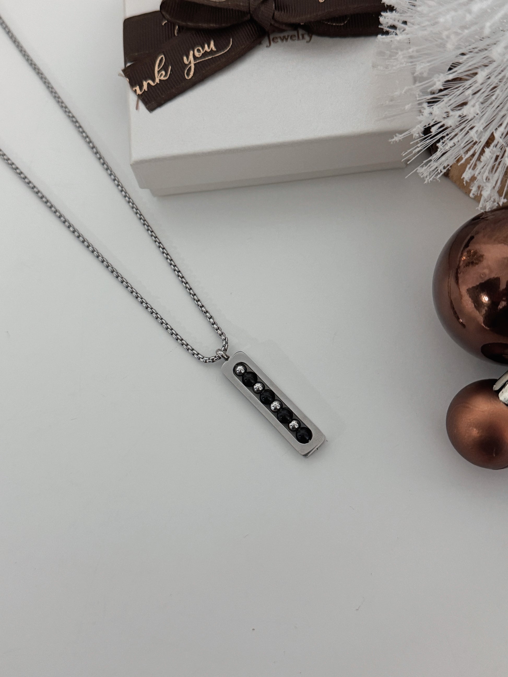 Um colar pensado para o homem moderno, que valoriza estilo, propósito e energia. Com design minimalista em aço inoxidável, este colar traz um pendente retangular com esferas naturais de hematite e olho de tigre. Pedra conhecida pela sua força energética e presença marcante, poder interior e estabilidade. Ajuda a afastar energias negativas e reforça a autoconfiança.