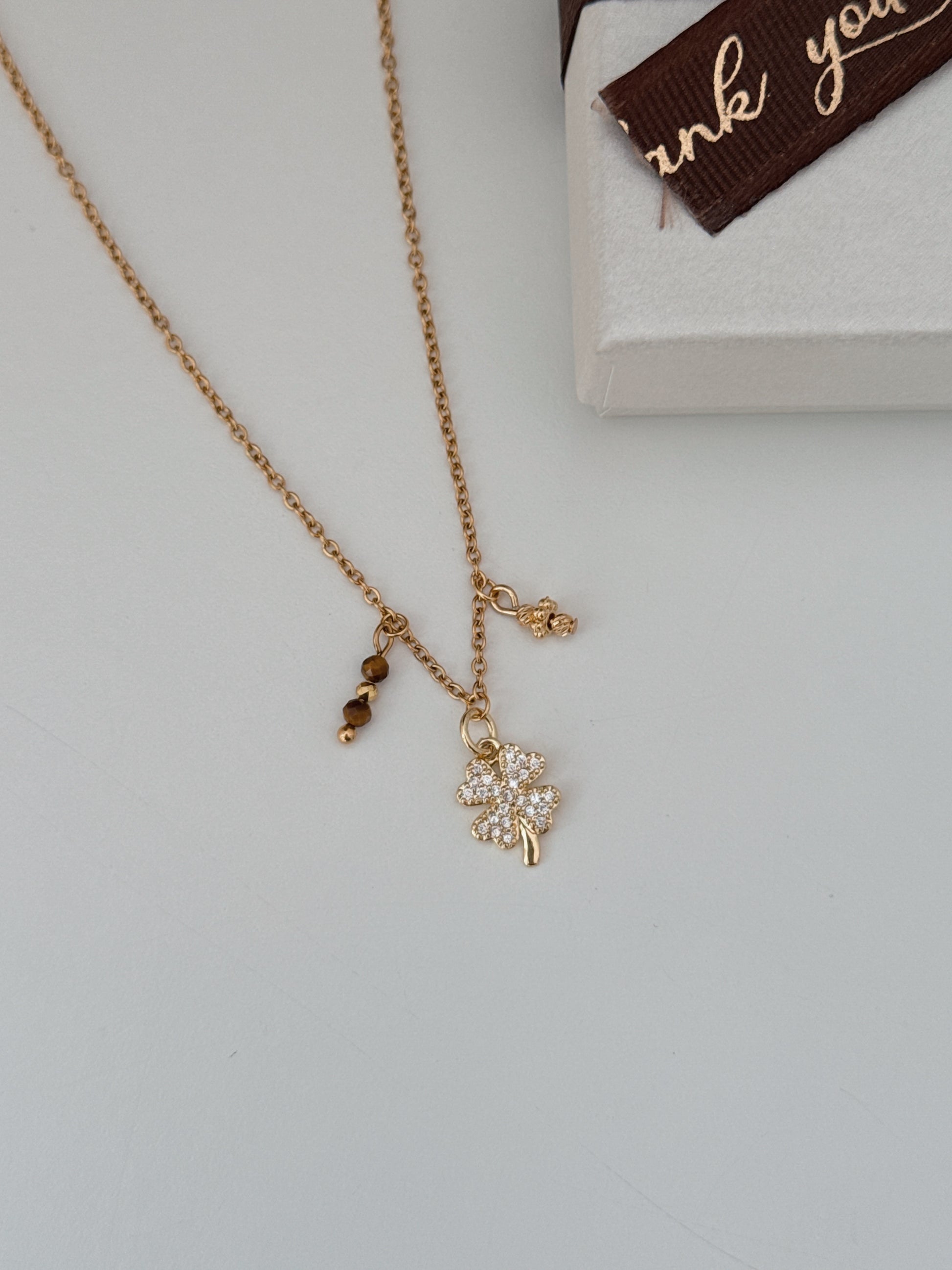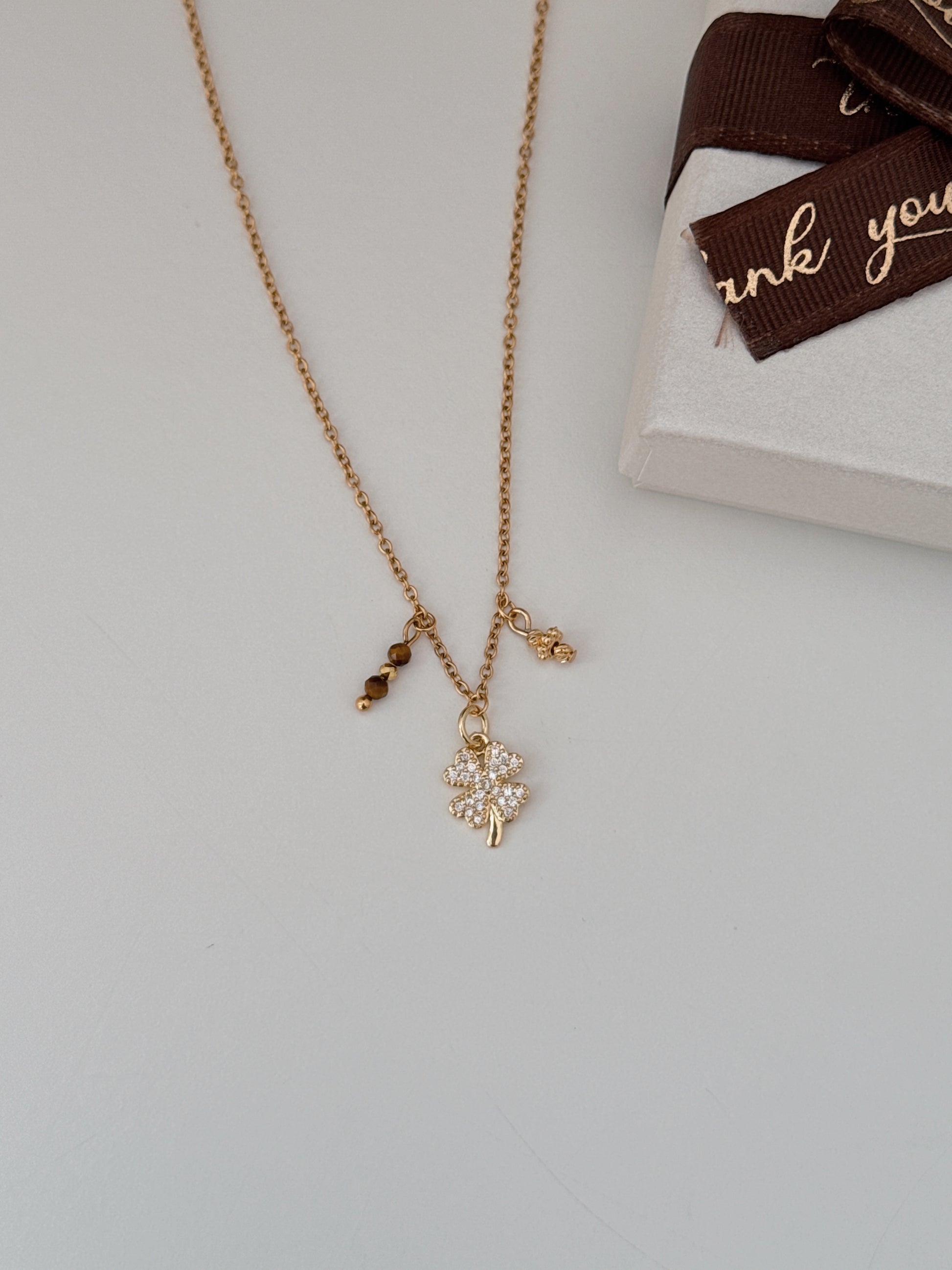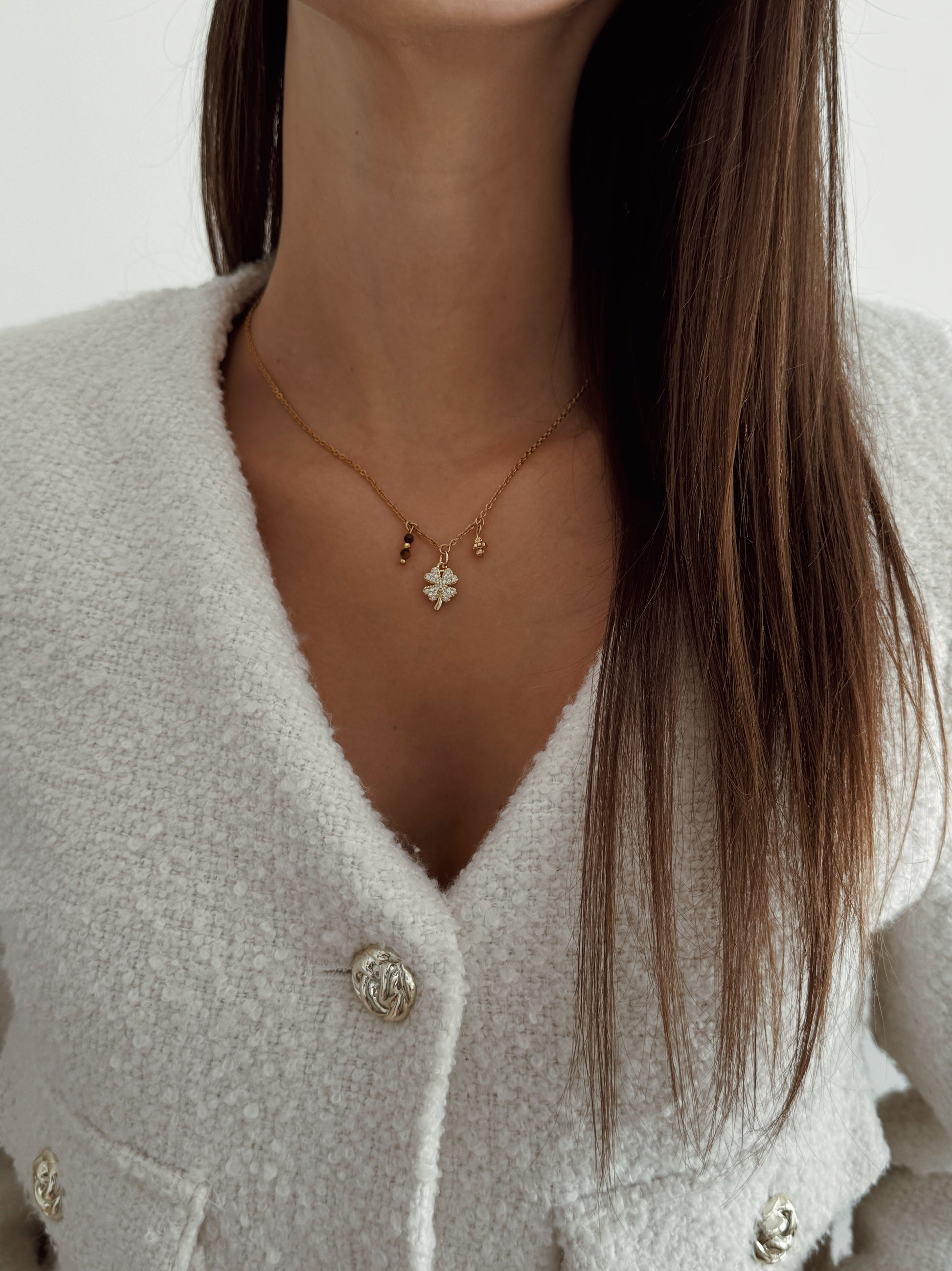 O Colar Luck Élite reúne o símbolo clássico da sorte, o trevo, com a energia poderosa do Olho de Tigre. Uma fusão de elegância e espiritualidade que atrai oportunidades, prosperidade e boas decisões.