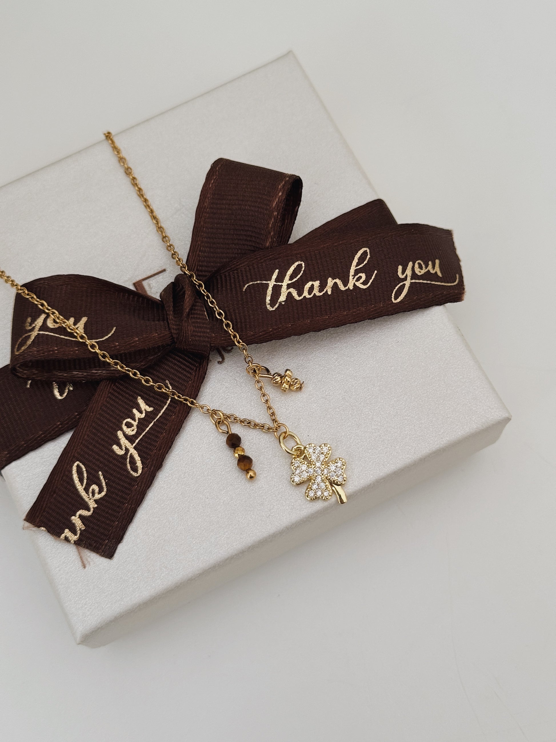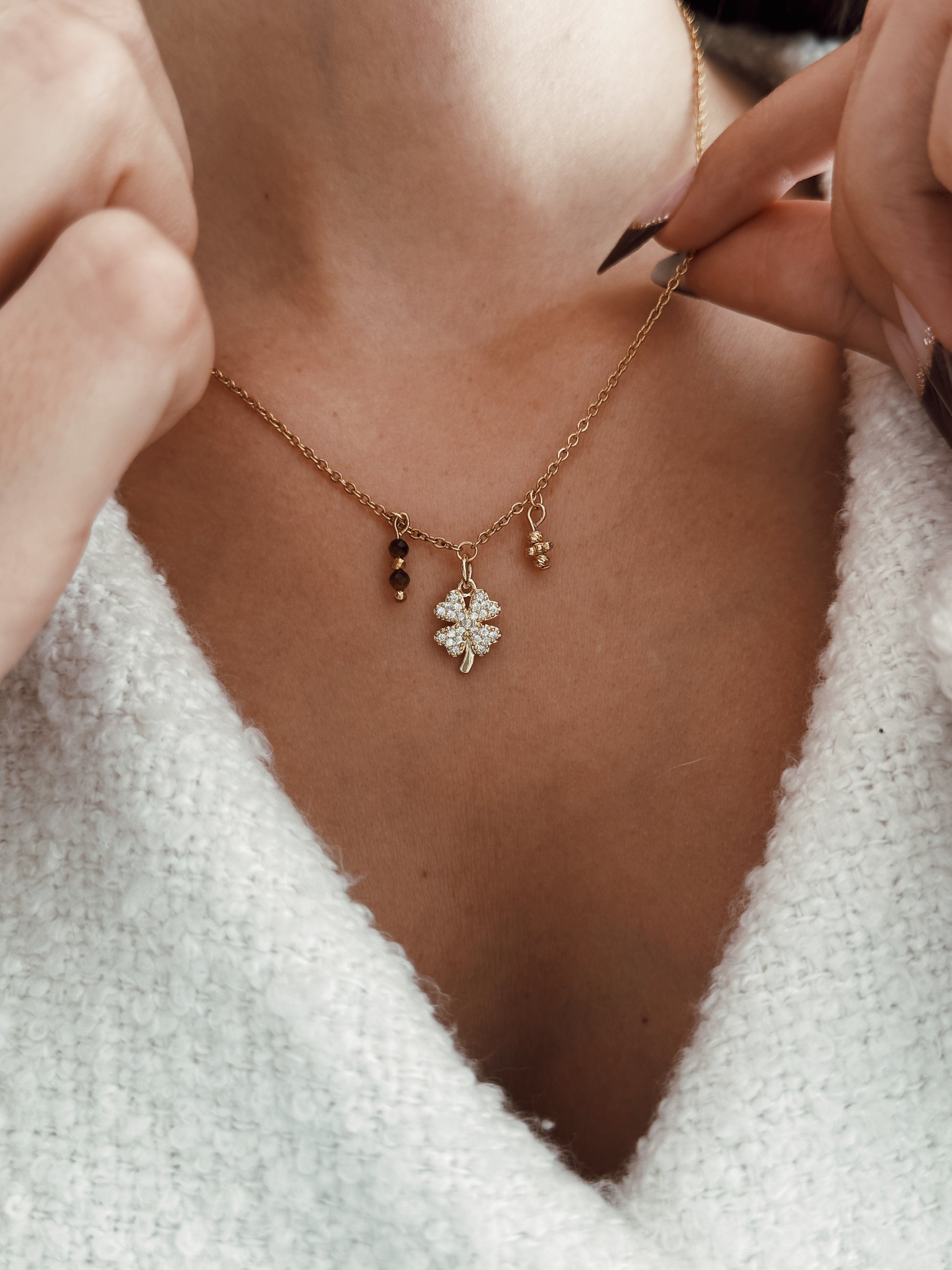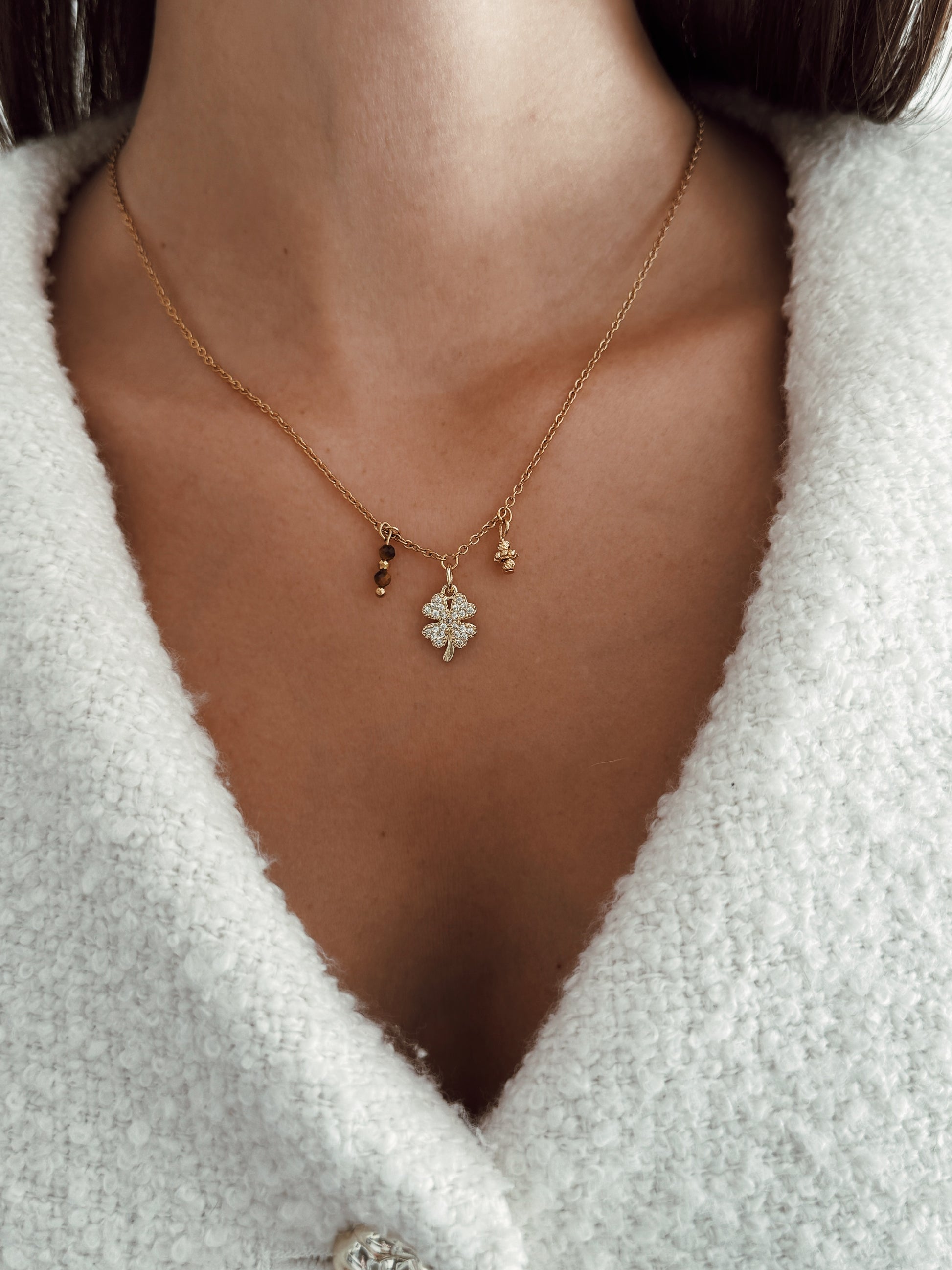 O Colar Luck Élite reúne o símbolo clássico da sorte, o trevo, com a energia poderosa do Olho de Tigre. Uma fusão de elegância e espiritualidade que atrai oportunidades, prosperidade e boas decisões.