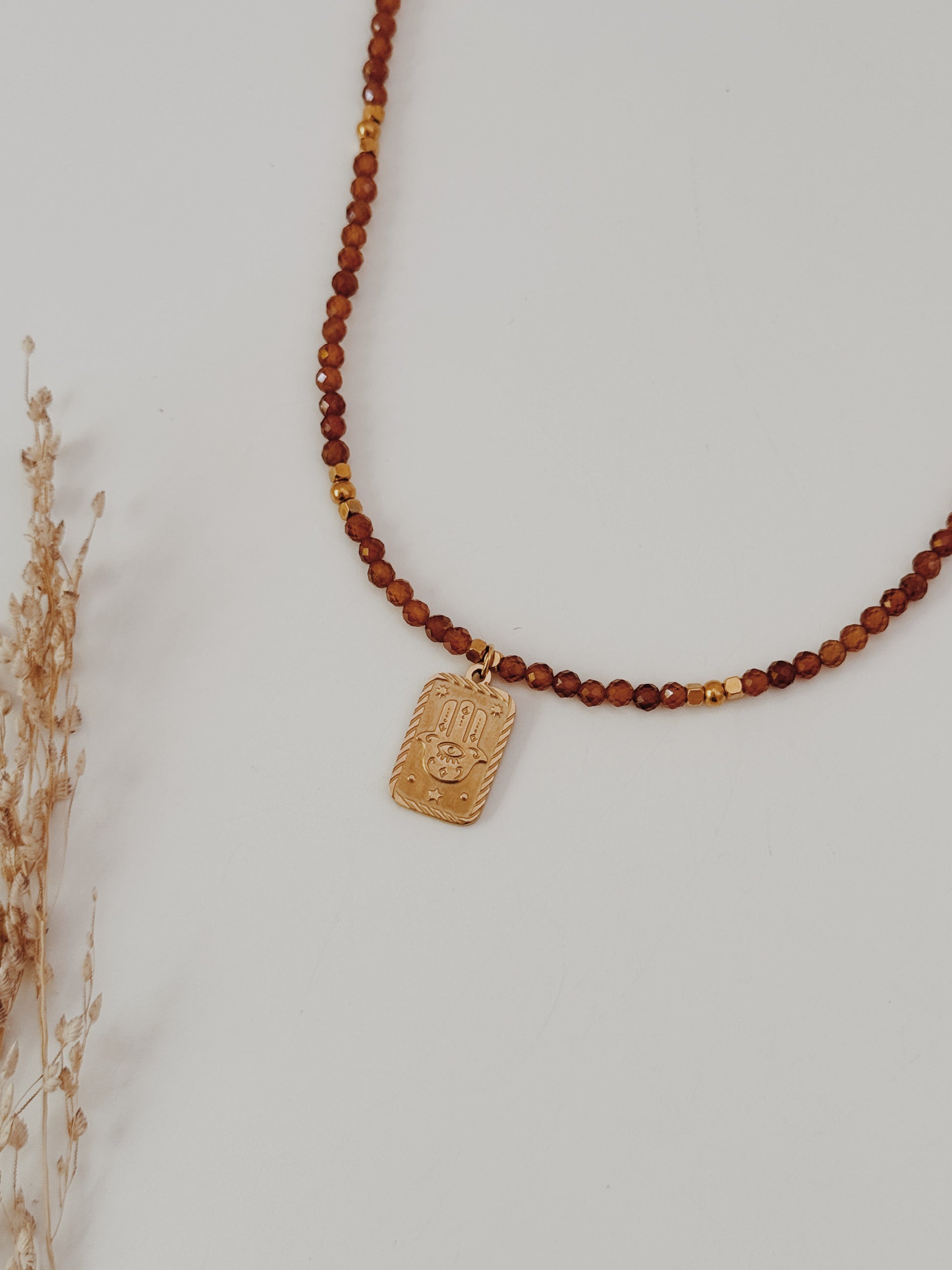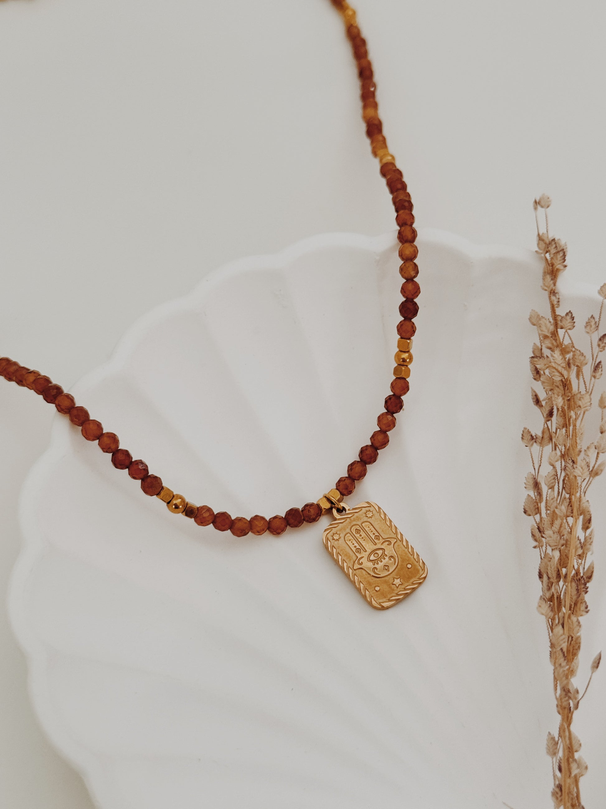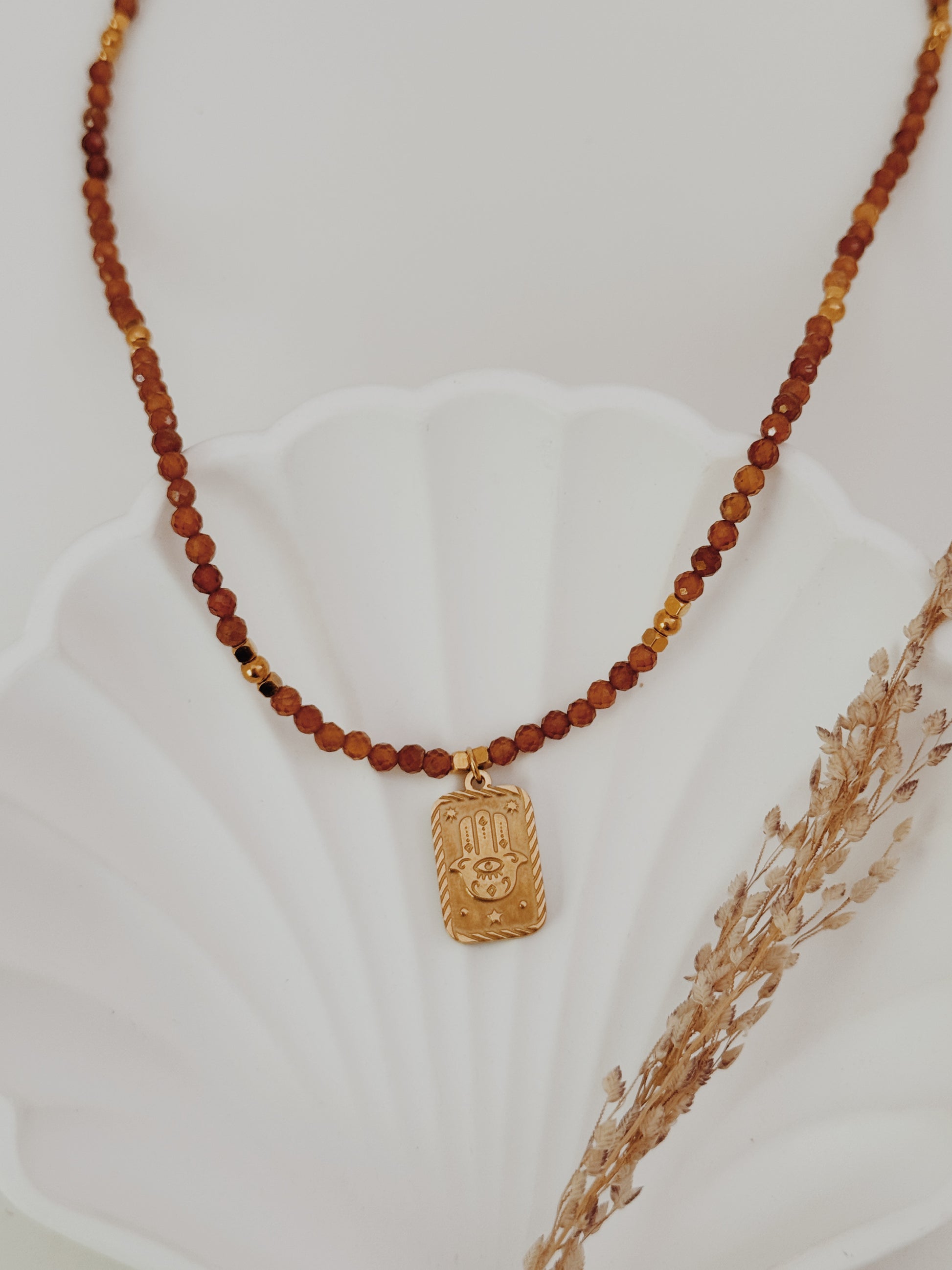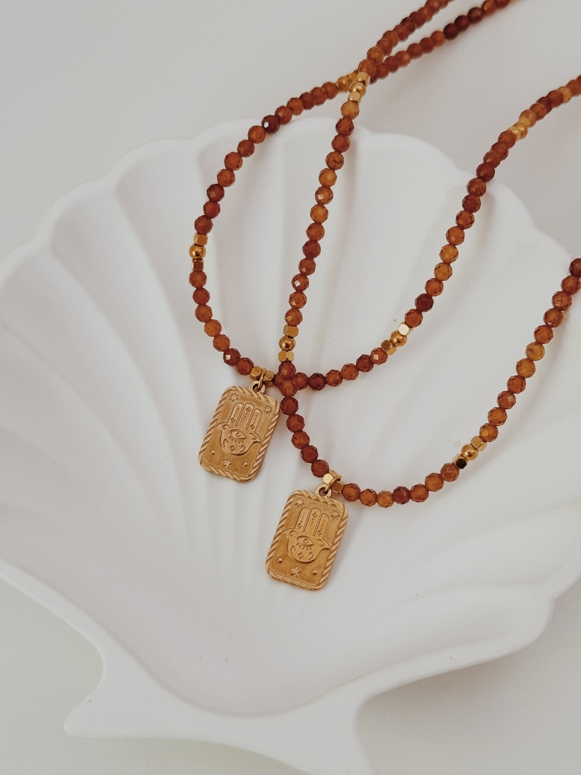 A mão Hamsá, presente em várias culturas, é um amuleto de proteção contra energias negativas e um convite à paz interior. As contas facetadas de âmbar captam a luz de forma única, criando reflexos quentes que transmitem calor e serenidade. Uma peça com significado profundo, perfeita para que deseja unir beleza e espiritualidade no dia a dia.