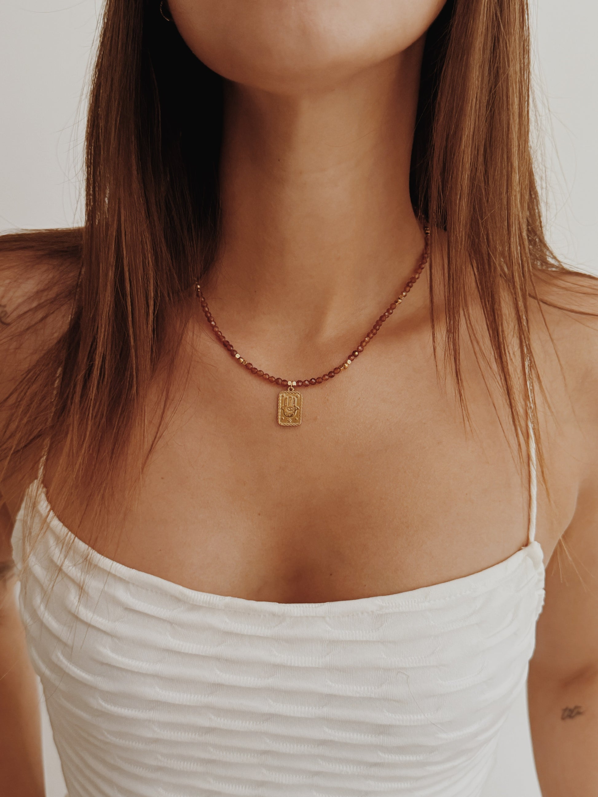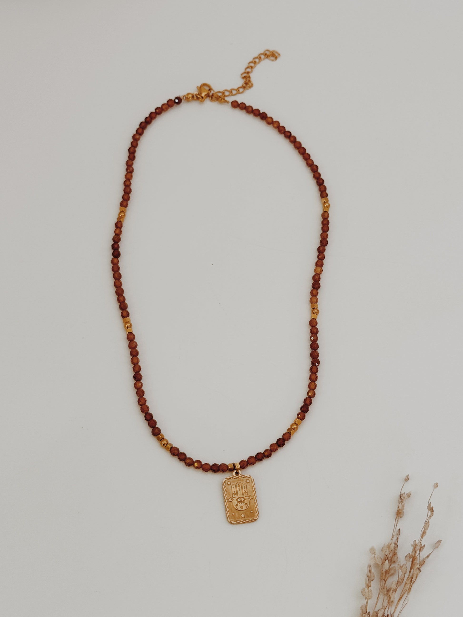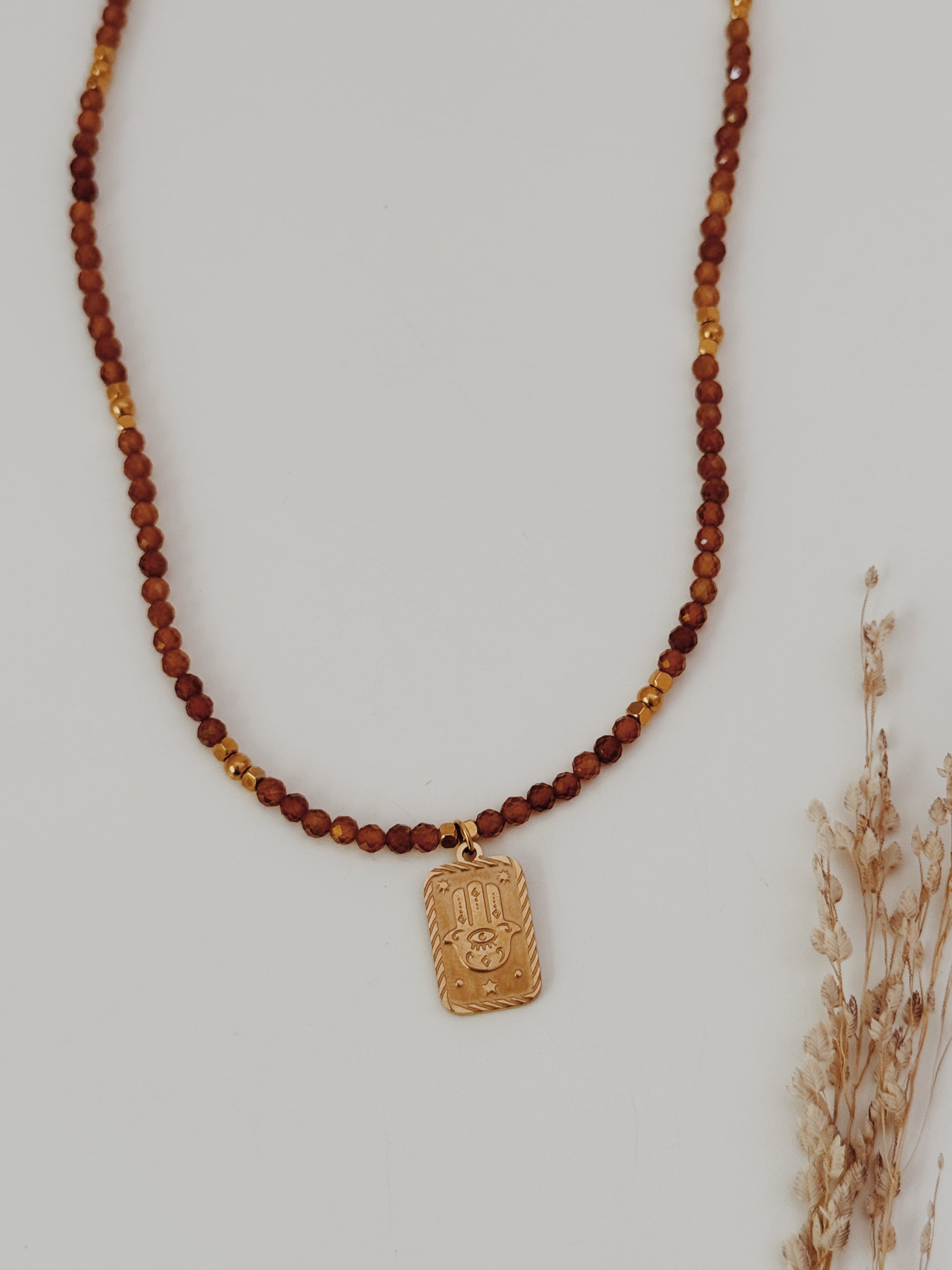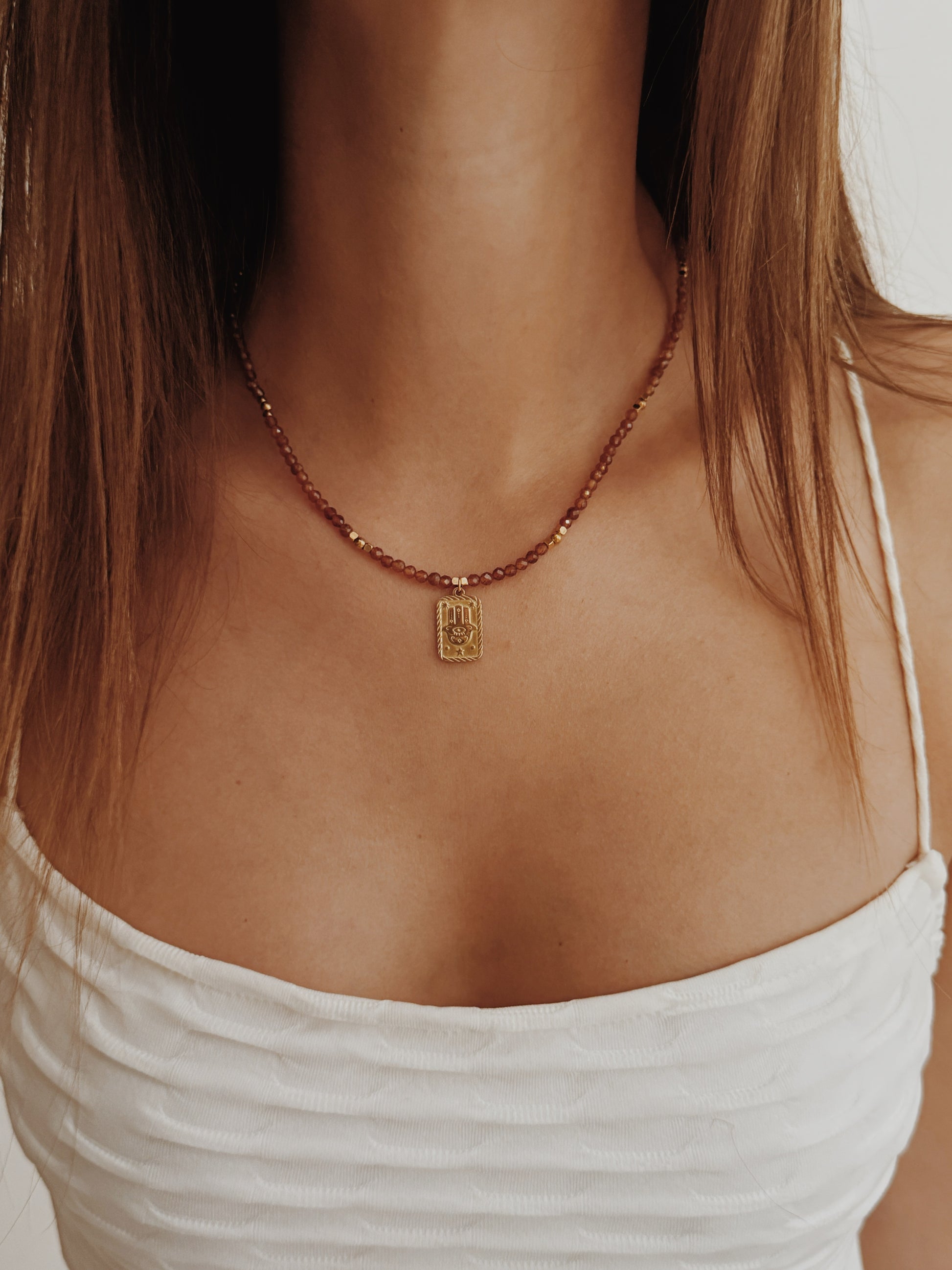 A mão Hamsá, presente em várias culturas, é um amuleto de proteção contra energias negativas e um convite à paz interior. As contas facetadas de âmbar captam a luz de forma única, criando reflexos quentes que transmitem calor e serenidade. Uma peça com significado profundo, perfeita para que deseja unir beleza e espiritualidade no dia a dia.