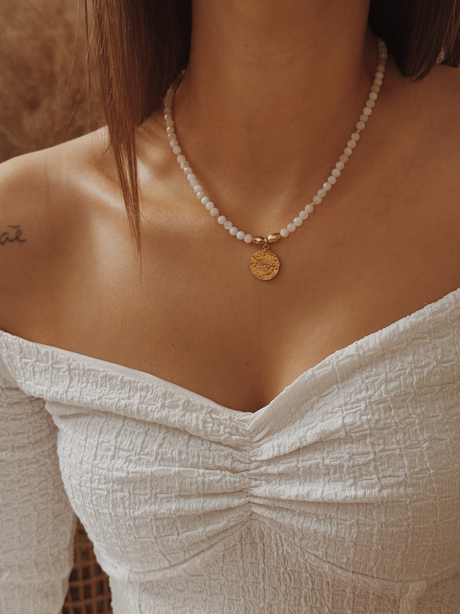 Material: pedra da lua facetada 6mm, complementos banhados a ouro 24k premium, chapa central em aço inoxidável