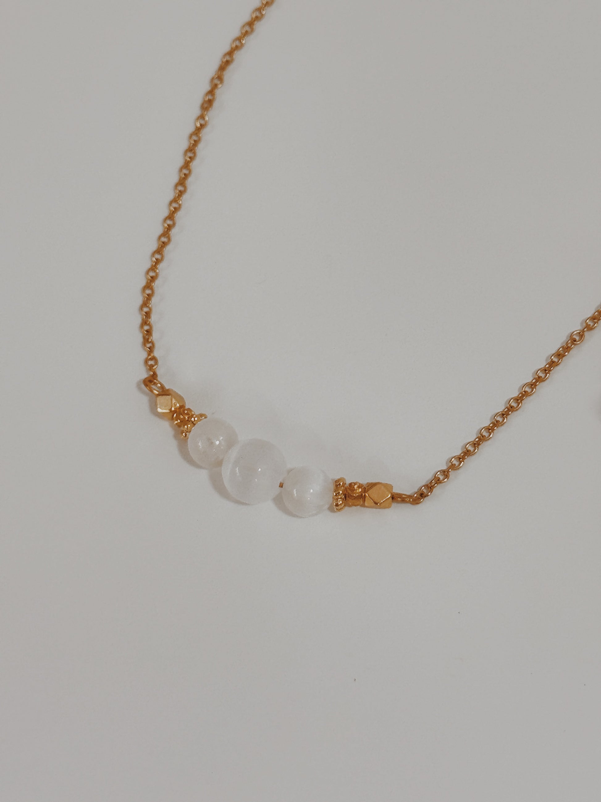 Material: corrente em aço inoxidável, complementos banhados a ouro 24k premium, Selenite 6mm e 8mm