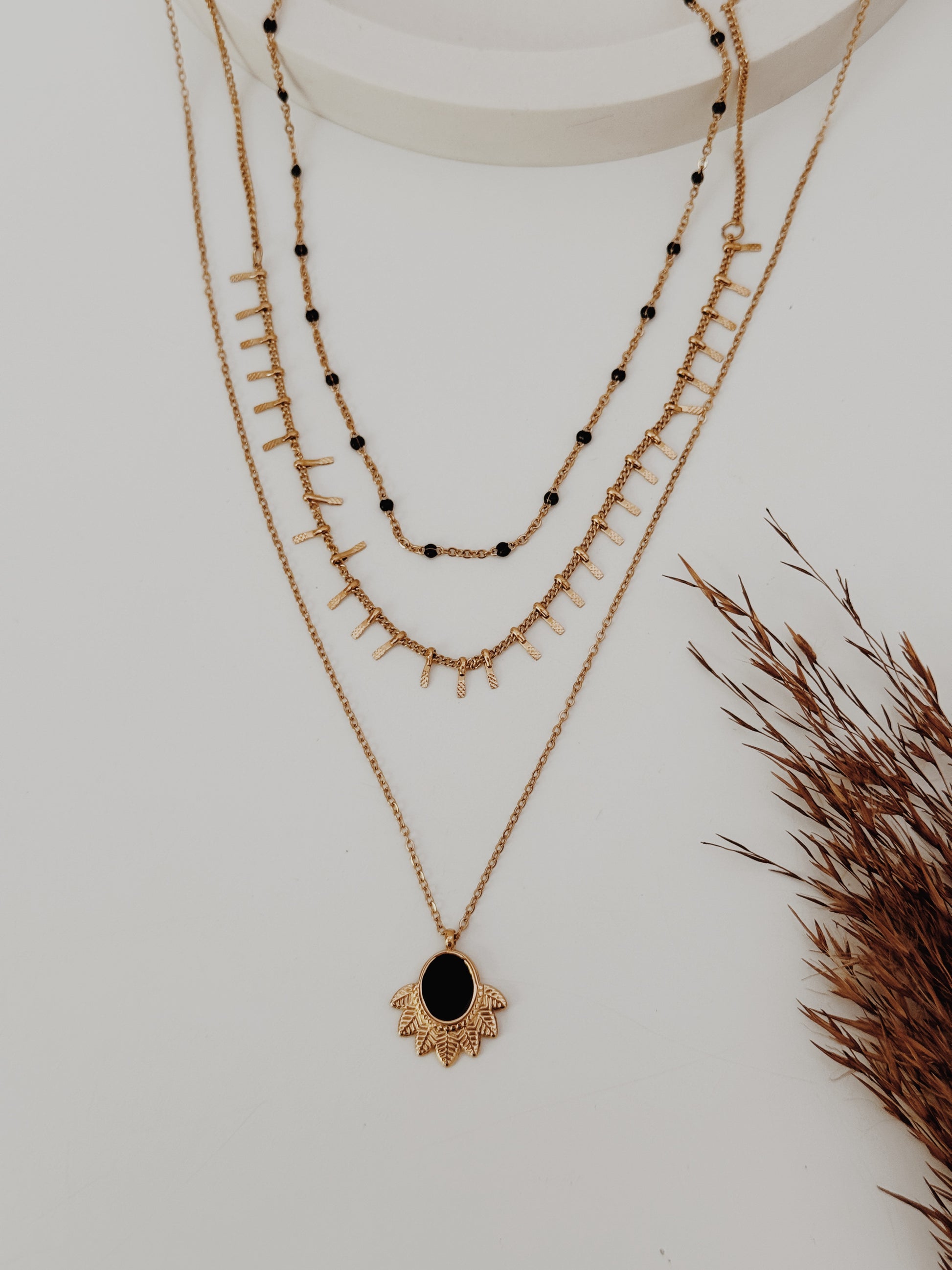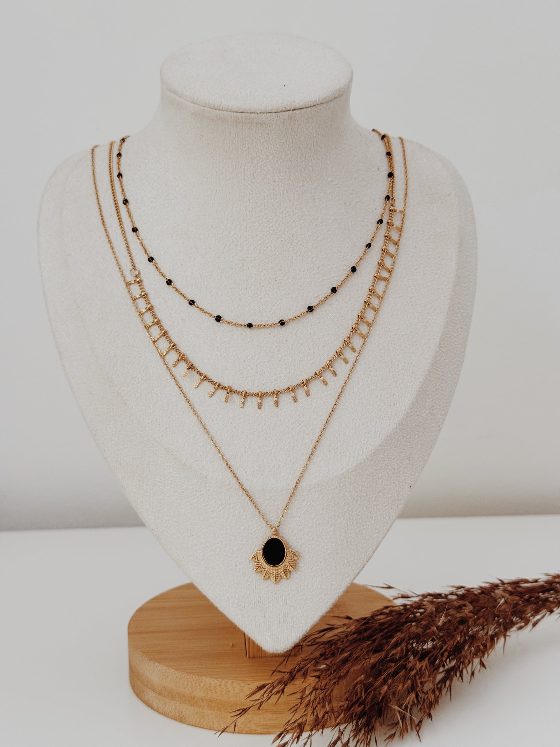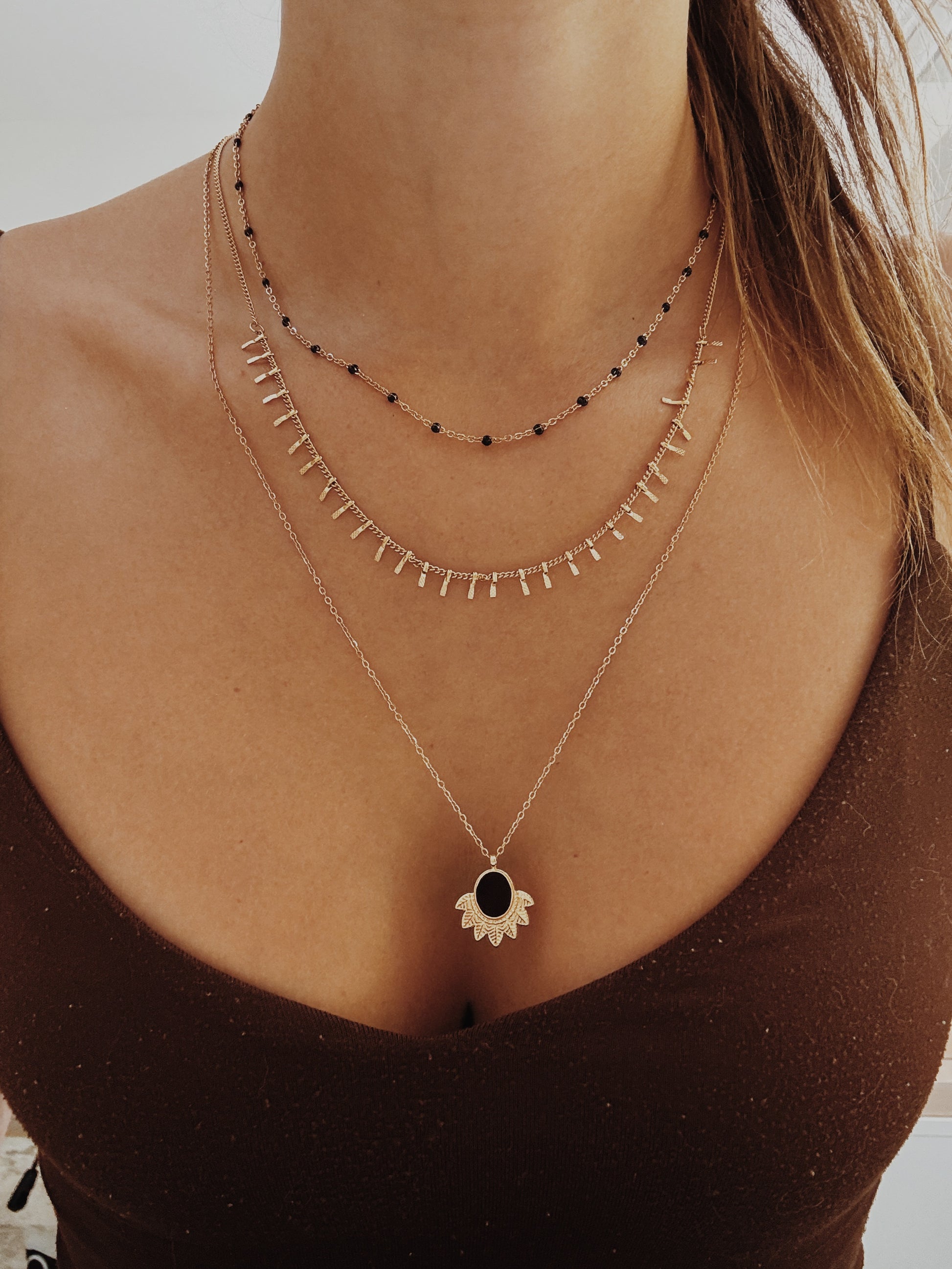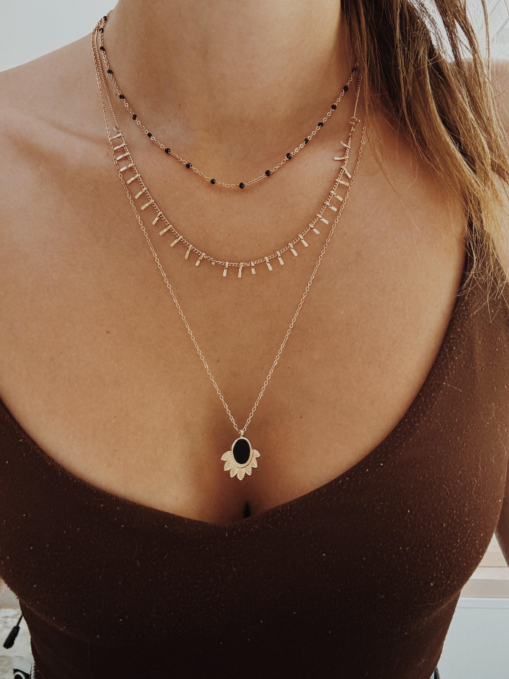 Um colar moderno e elegante que combina camadas em harmonia, adornadas com detalhes em preto. Uma peça versátil, que pode ser usada no dia a dia ou em momentos especiais, elevando qualquer look com um toque de sofisticação.
