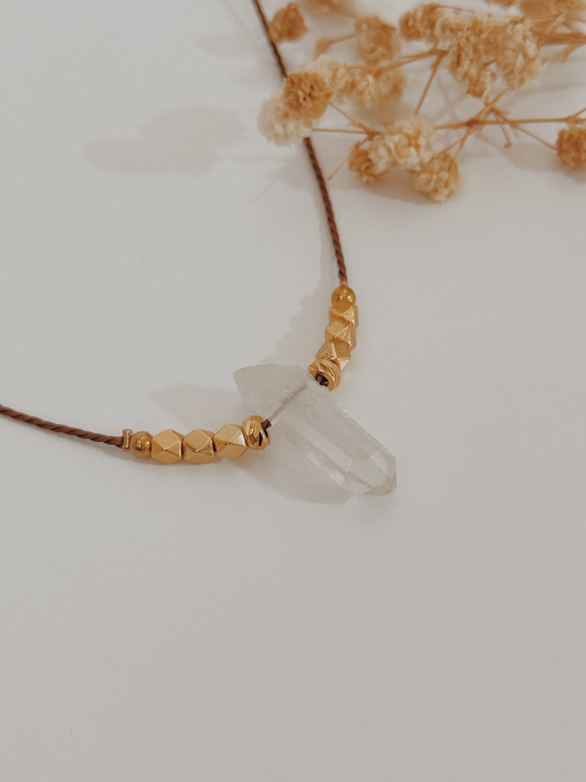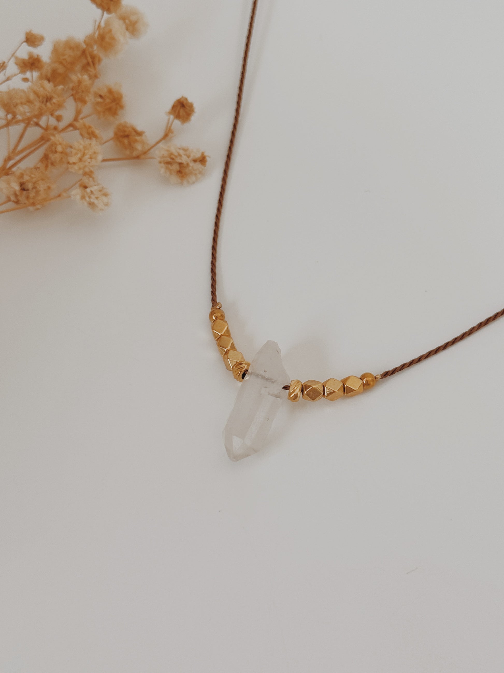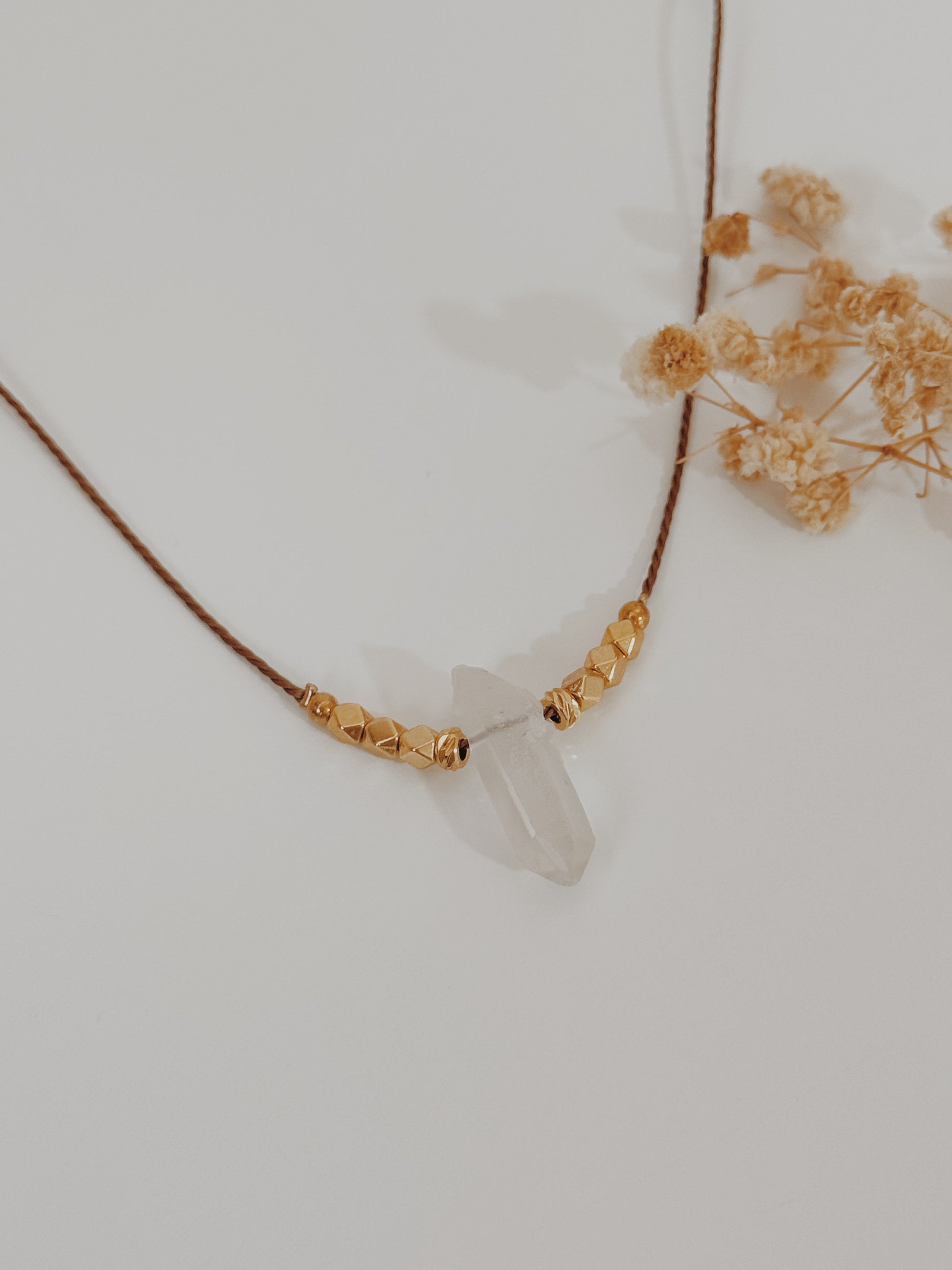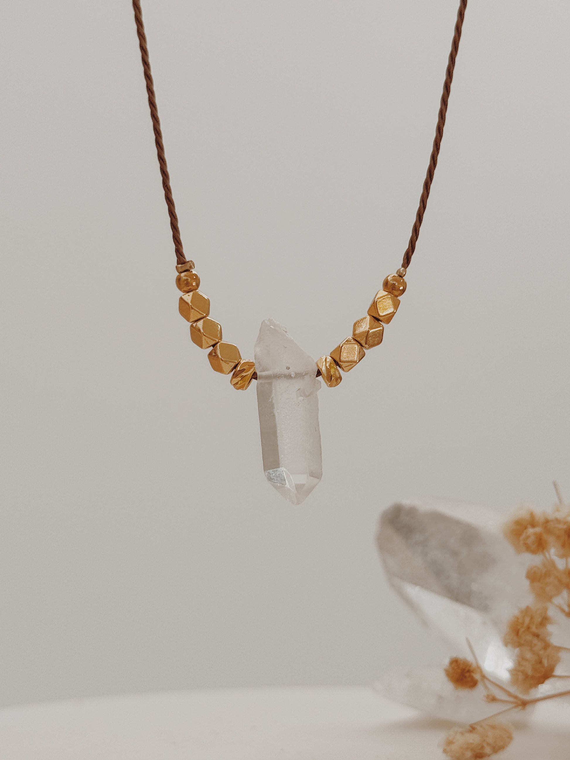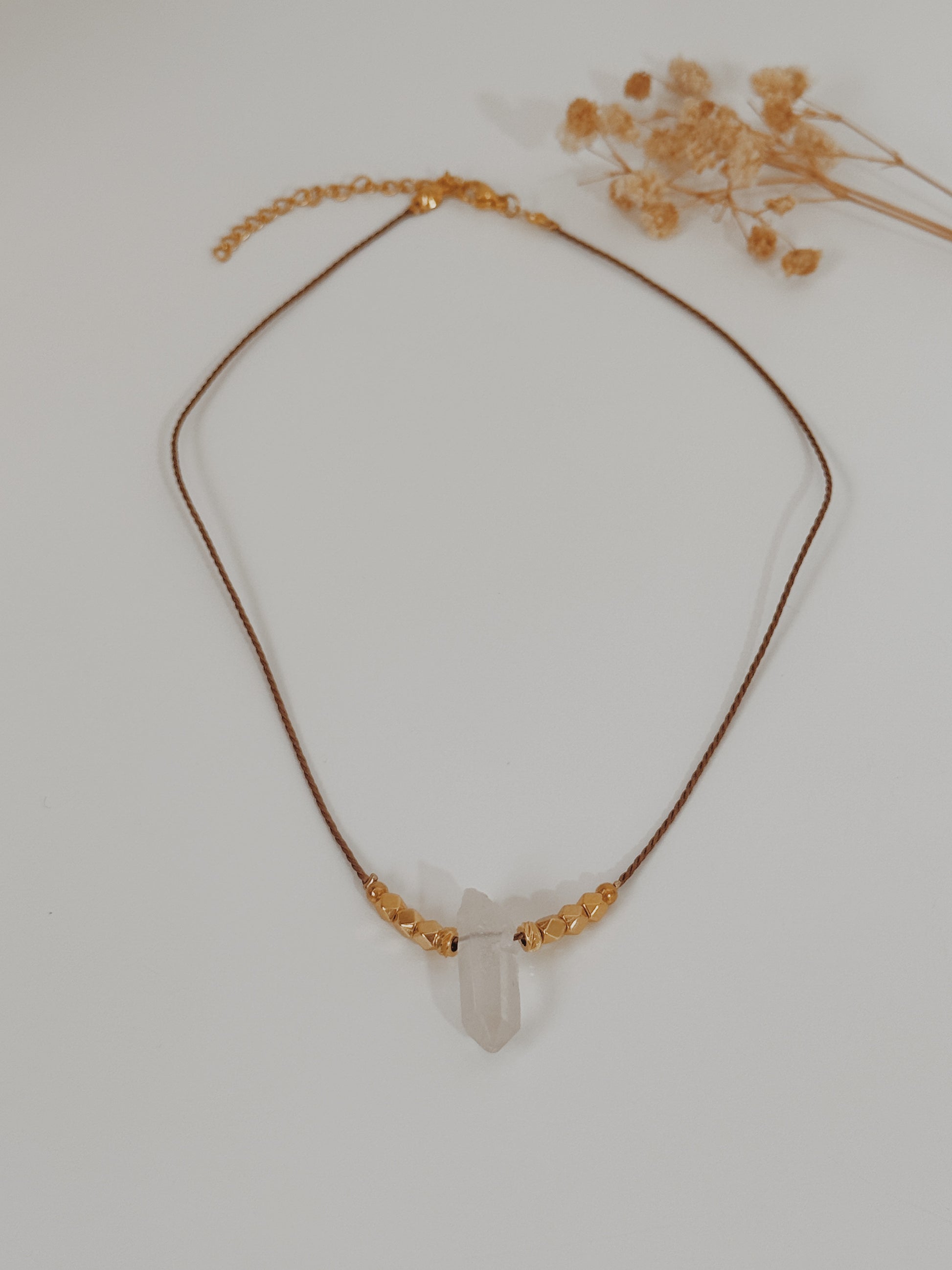 Material: fio castanho, complementos banhados a ouro 24k premium , ponta de Quartzo