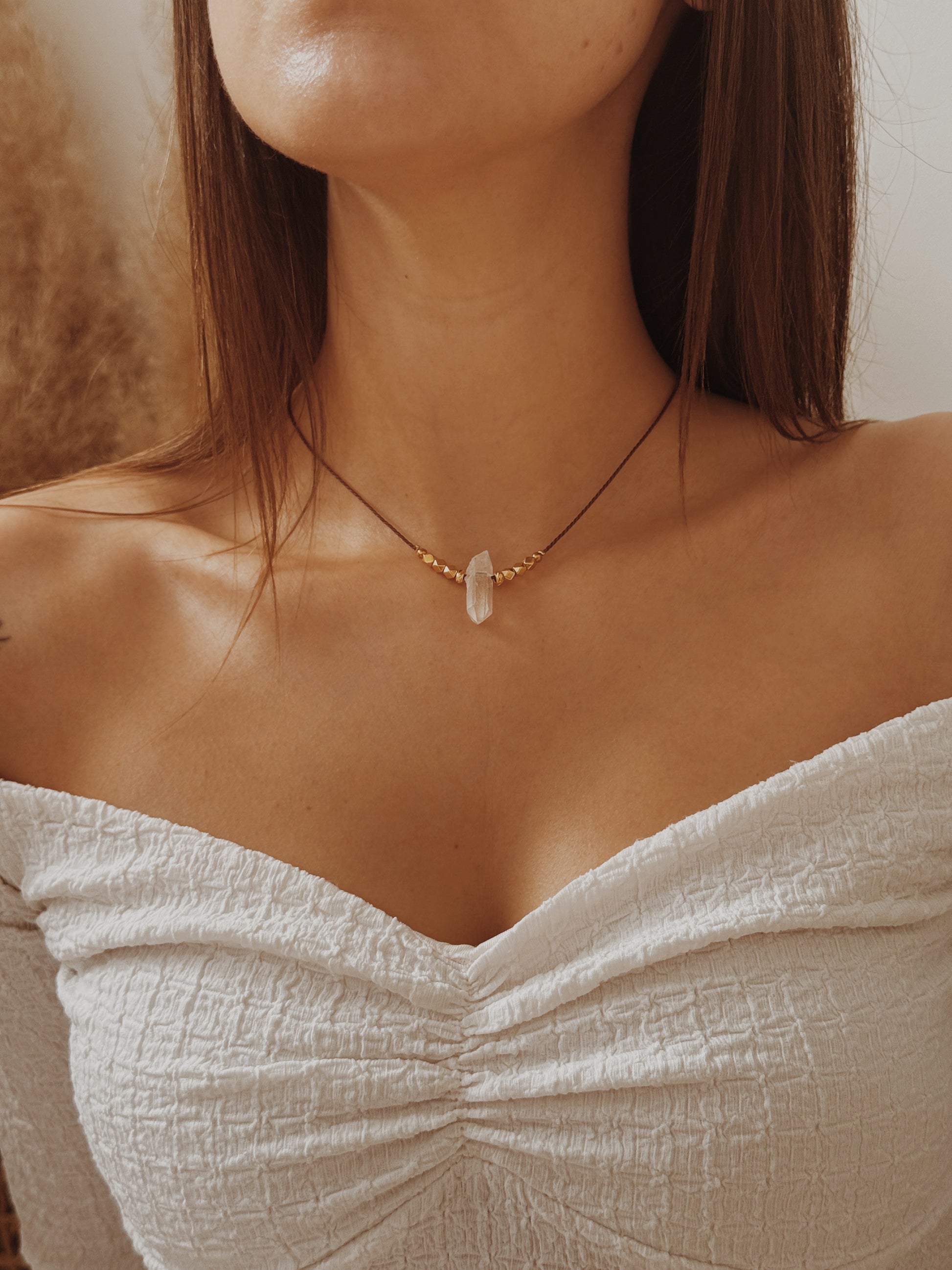 Utilizares esta peça é convidares a calma e a harmonia para o teu dia, é transformares a tua mente num refúgio de tranquilidade e clareza, permitindo-te obter a percepção necessária para as várias situações do teu dia. A ponta de Quartzo bem no centro deste colar, vai facilitar o fluxo de energia em todos os teus chakras sem qualquer bloqueio, permitindo alcançar o equilíbrio e o bem estar.