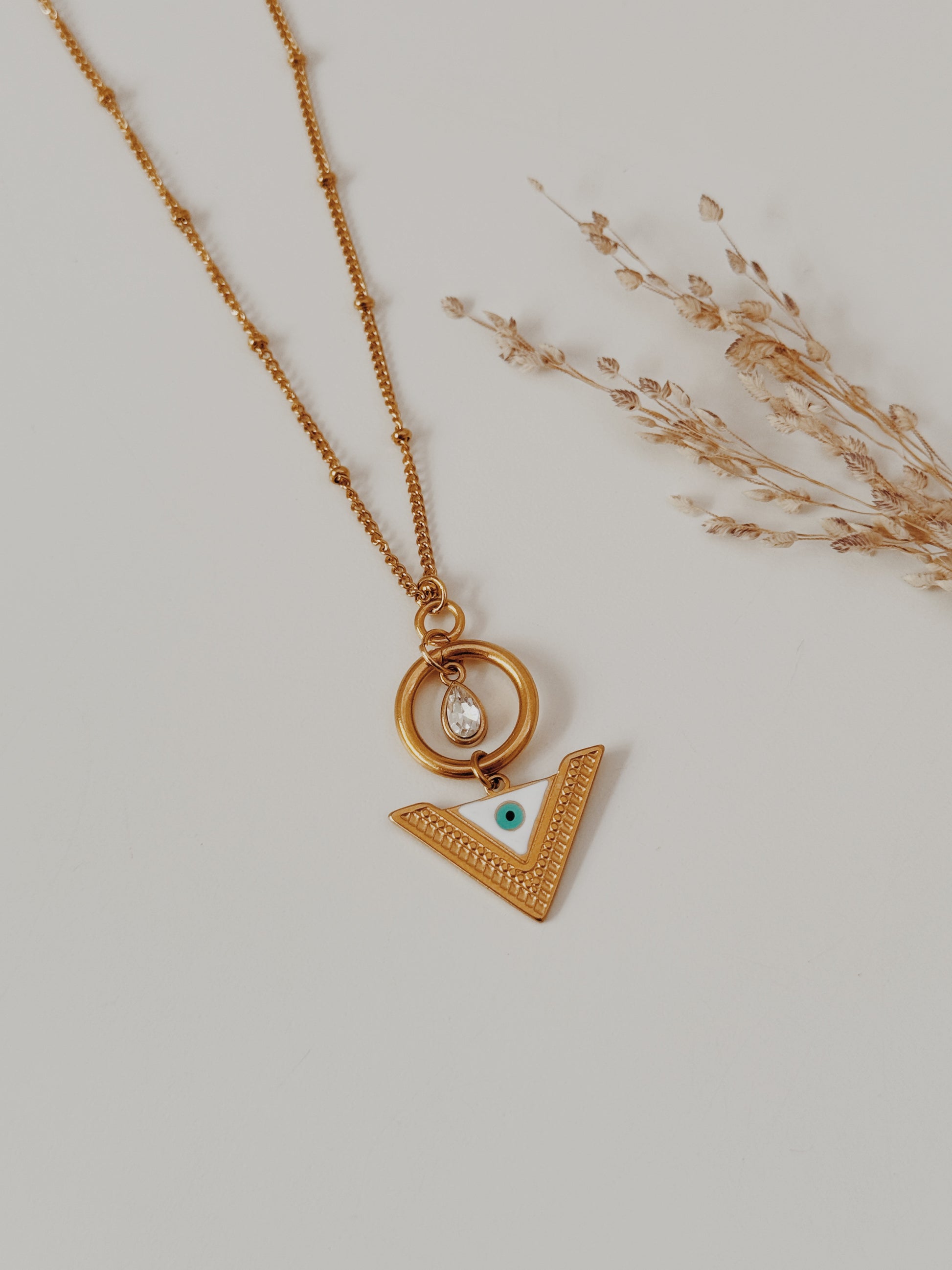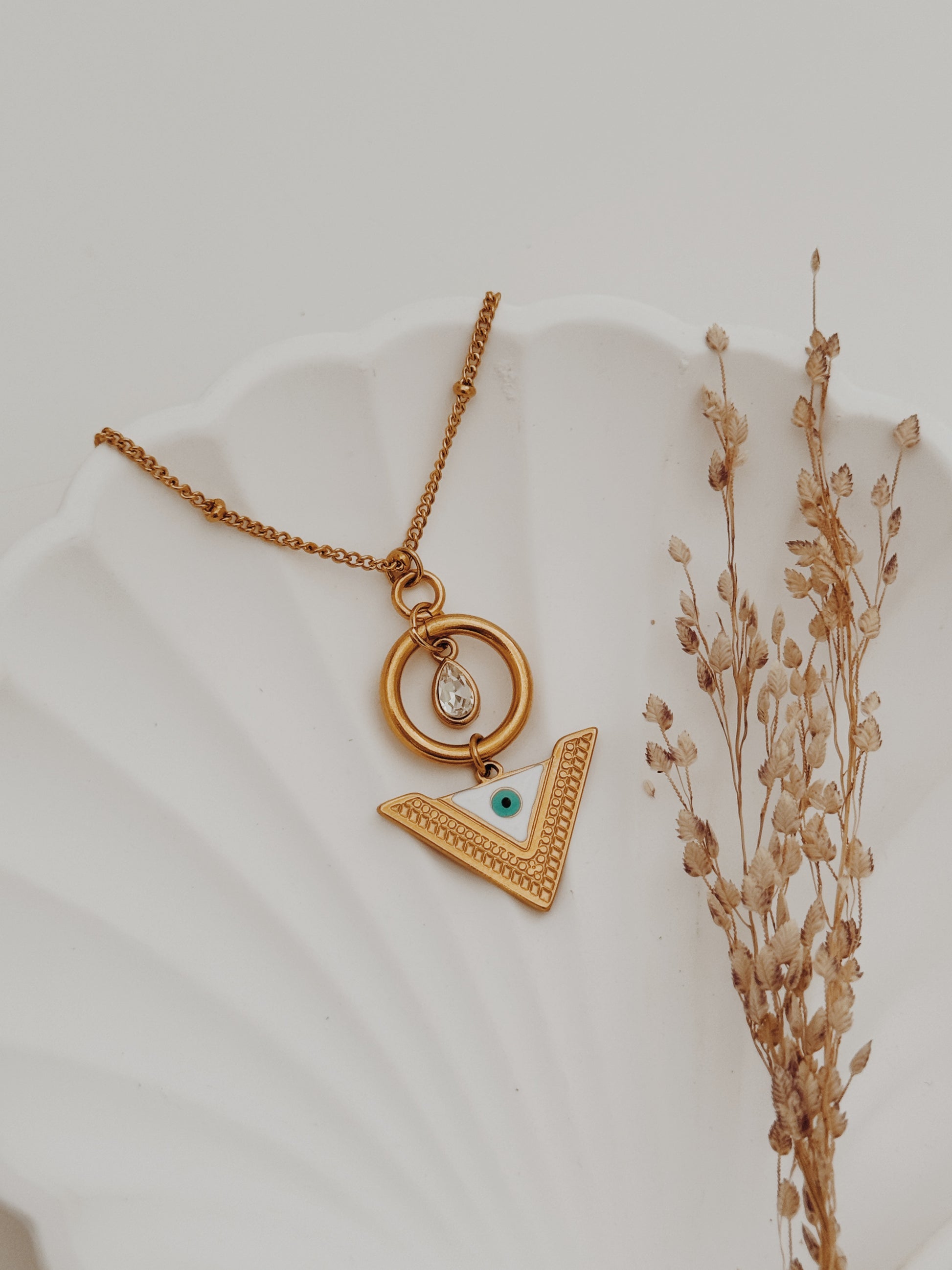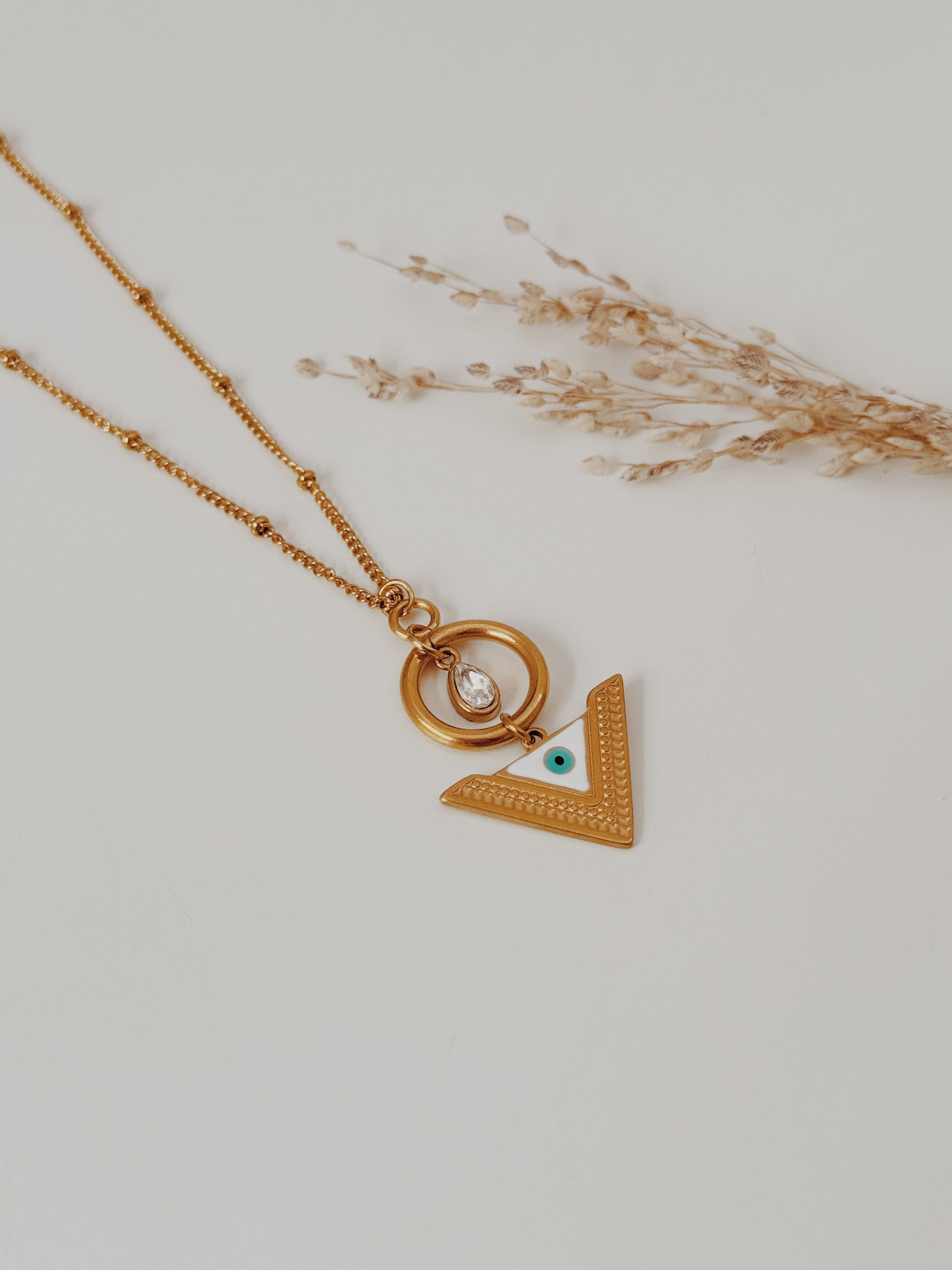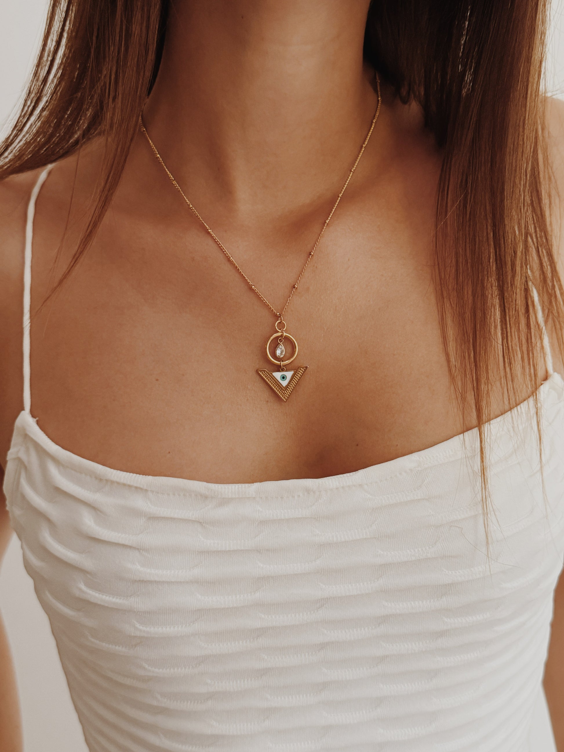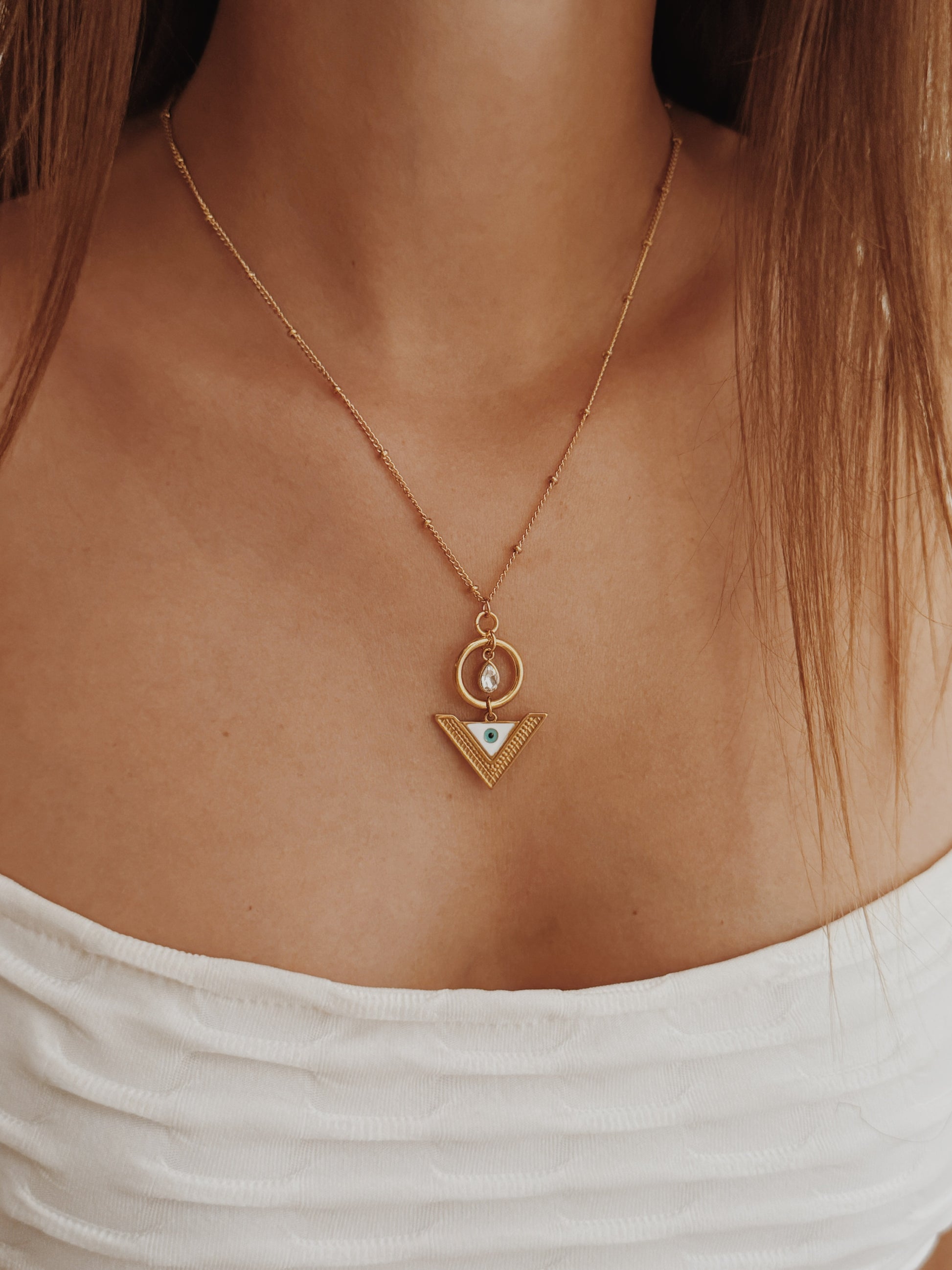 O Colar Zafir é uma peça que une o dourado sofisticado a símbolos poderosos: o olho grego, conhecido por afastar más energias e uma zirconia em formato gota que reflete luz e clareza.