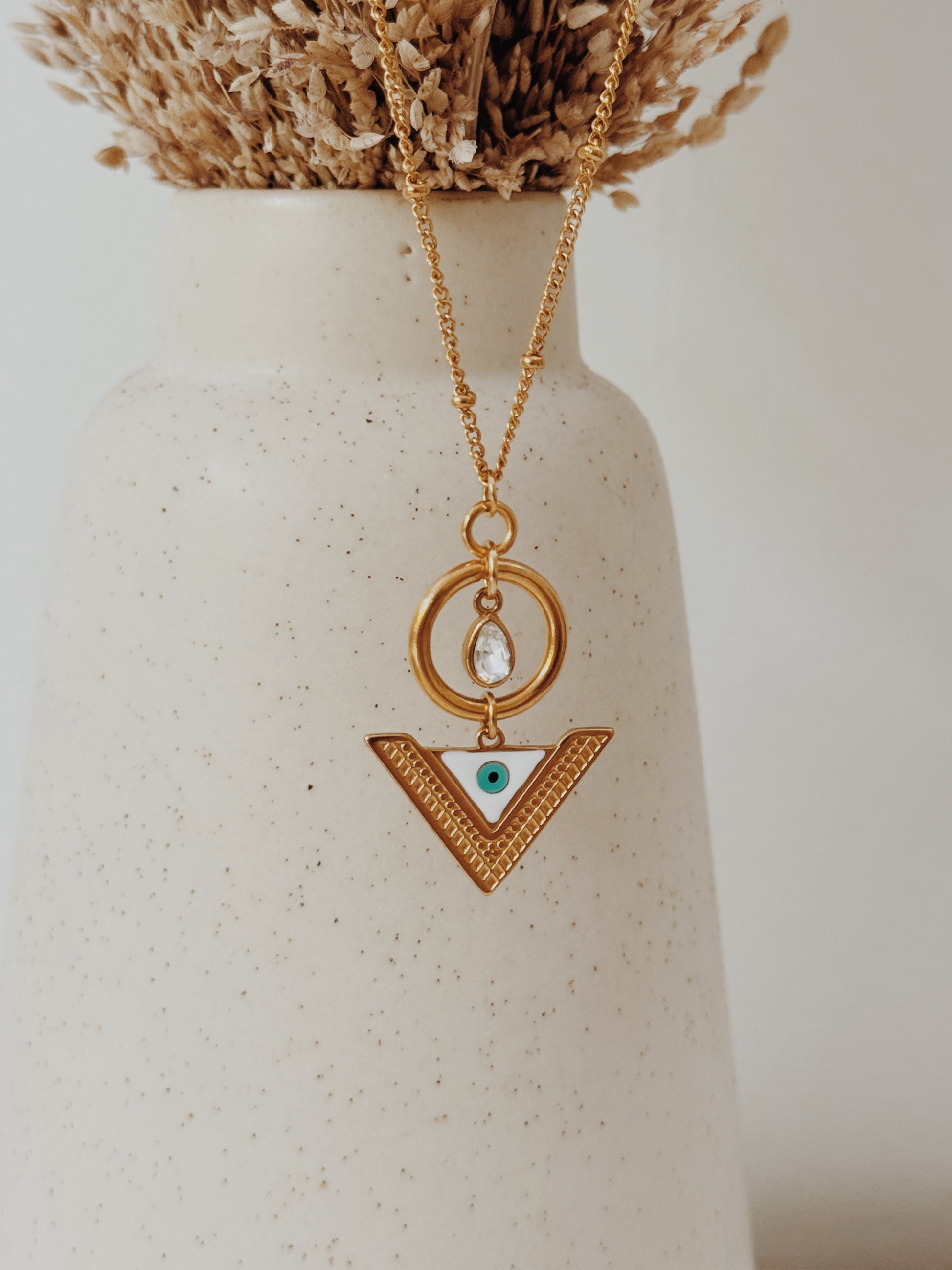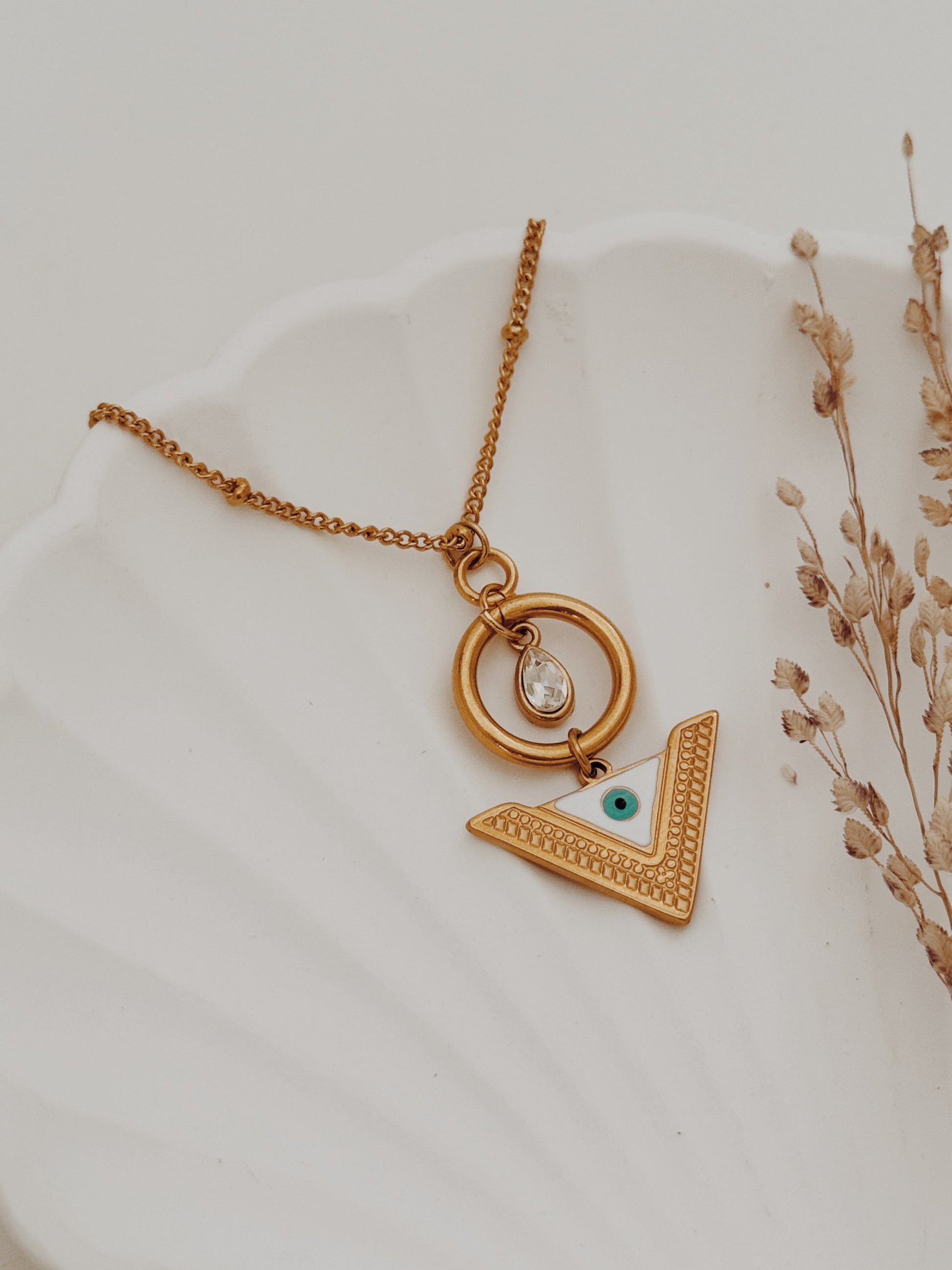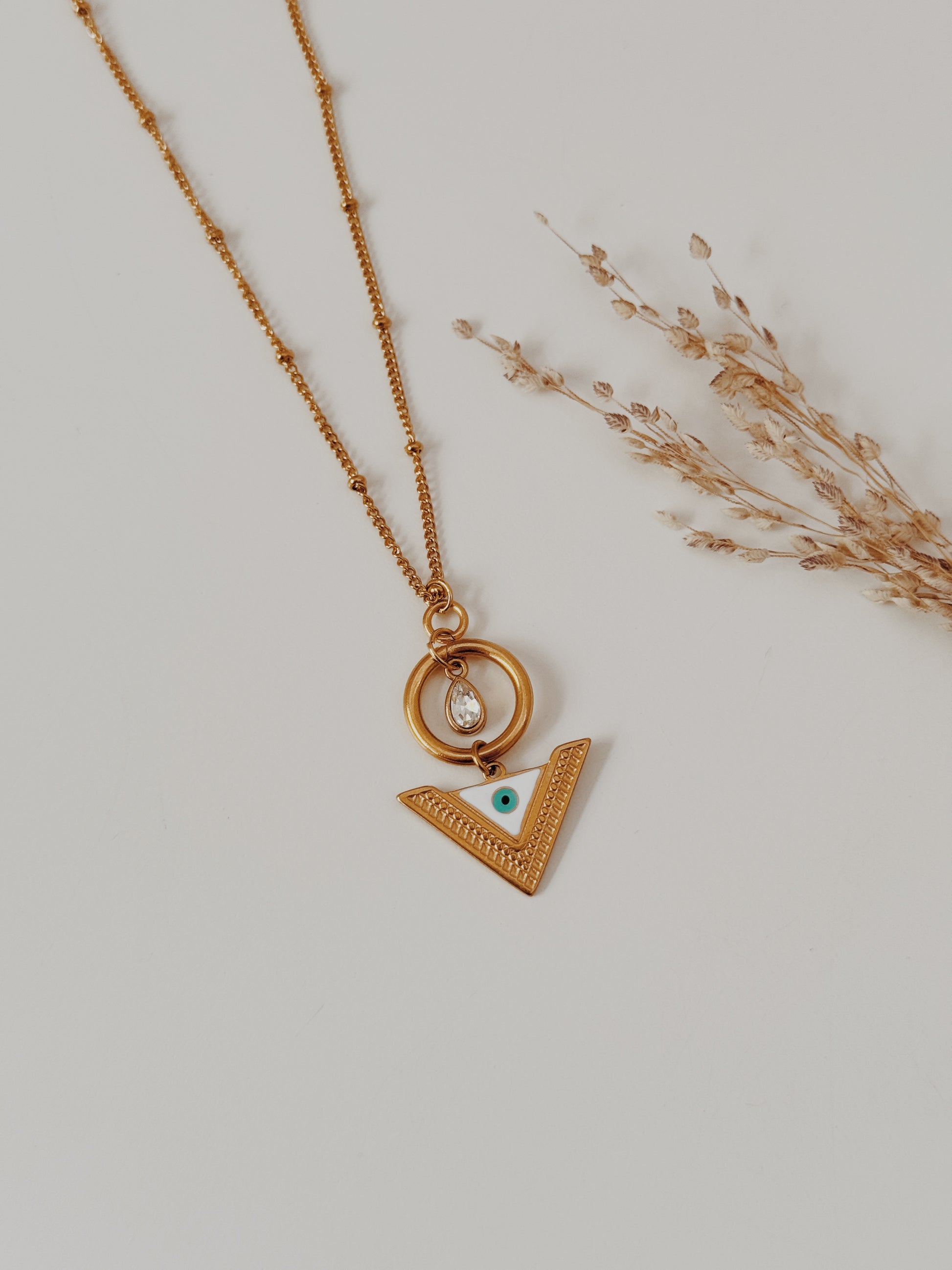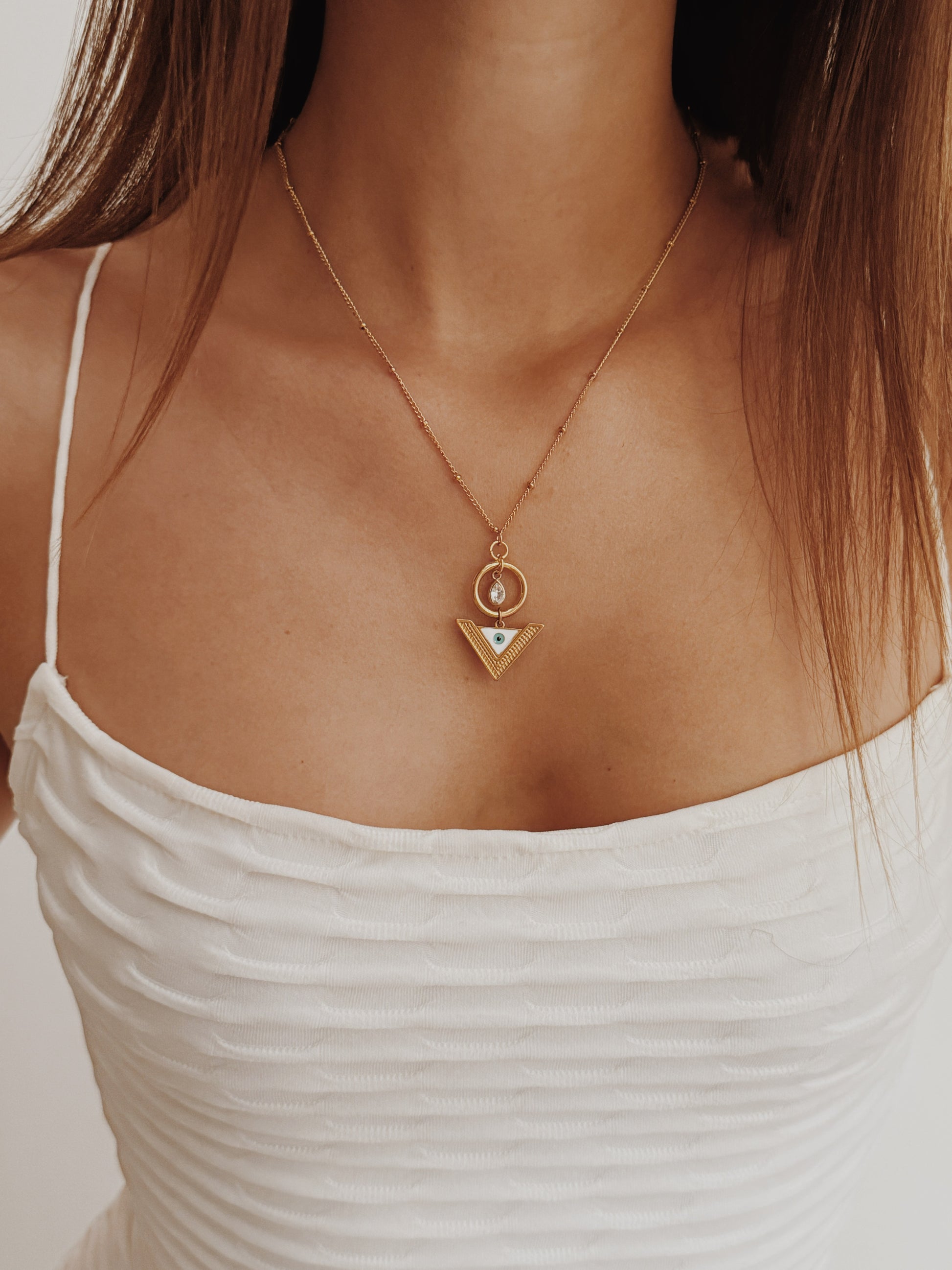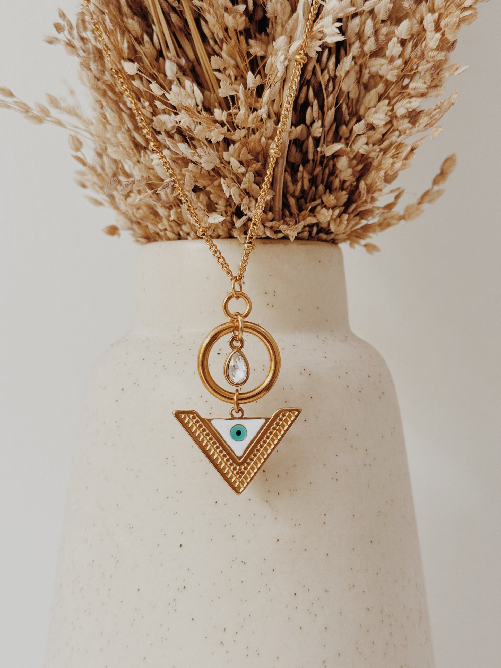 O Colar Zafir é uma peça que une o dourado sofisticado a símbolos poderosos: o olho grego, conhecido por afastar más energias e uma zirconia em formato gota que reflete luz e clareza.