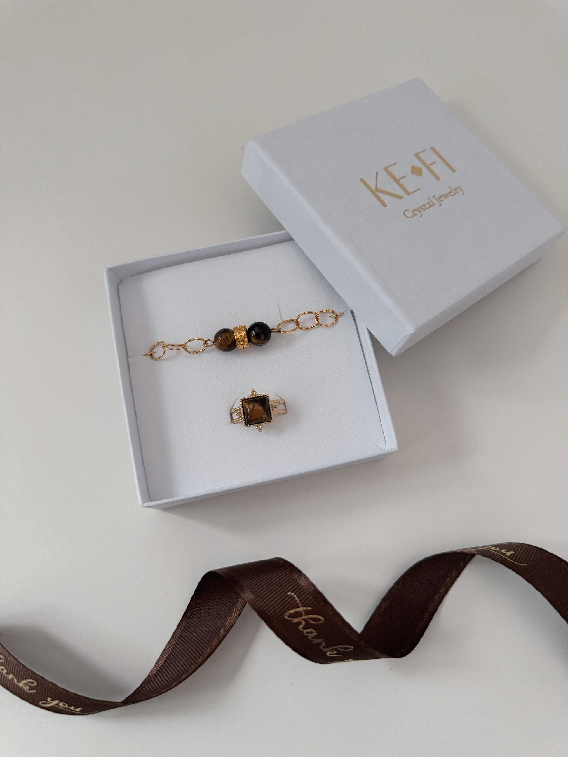Um conjunto composto por Olho de Tigre, um cristal que transmite confiança, força pessoal e coragem para agir.