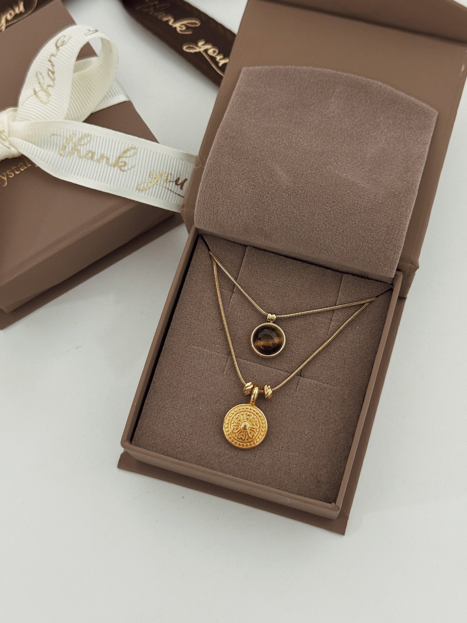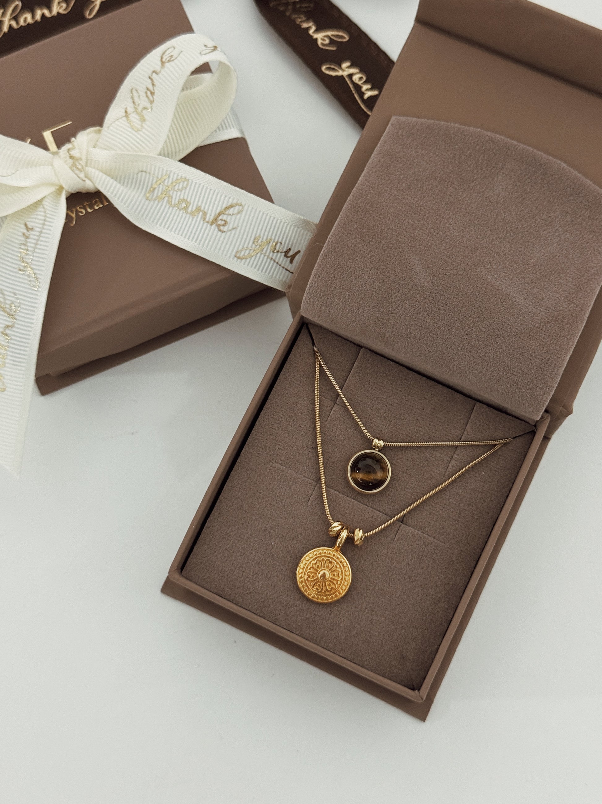 Conjunto composto por Olho de Tigre, um cristal que aumenta a confiança, coragem e oferece proteção contra inveja e más vibrações.