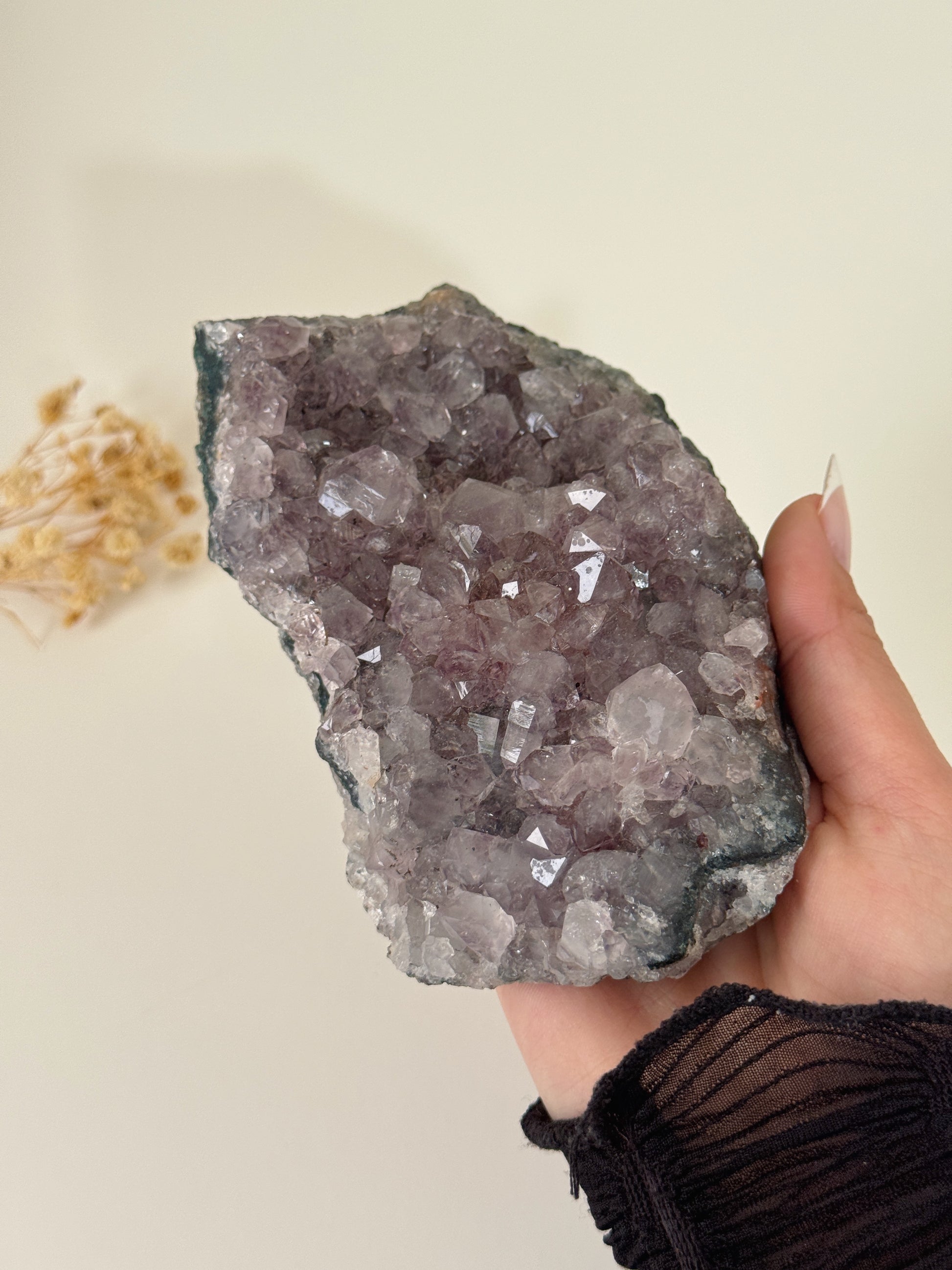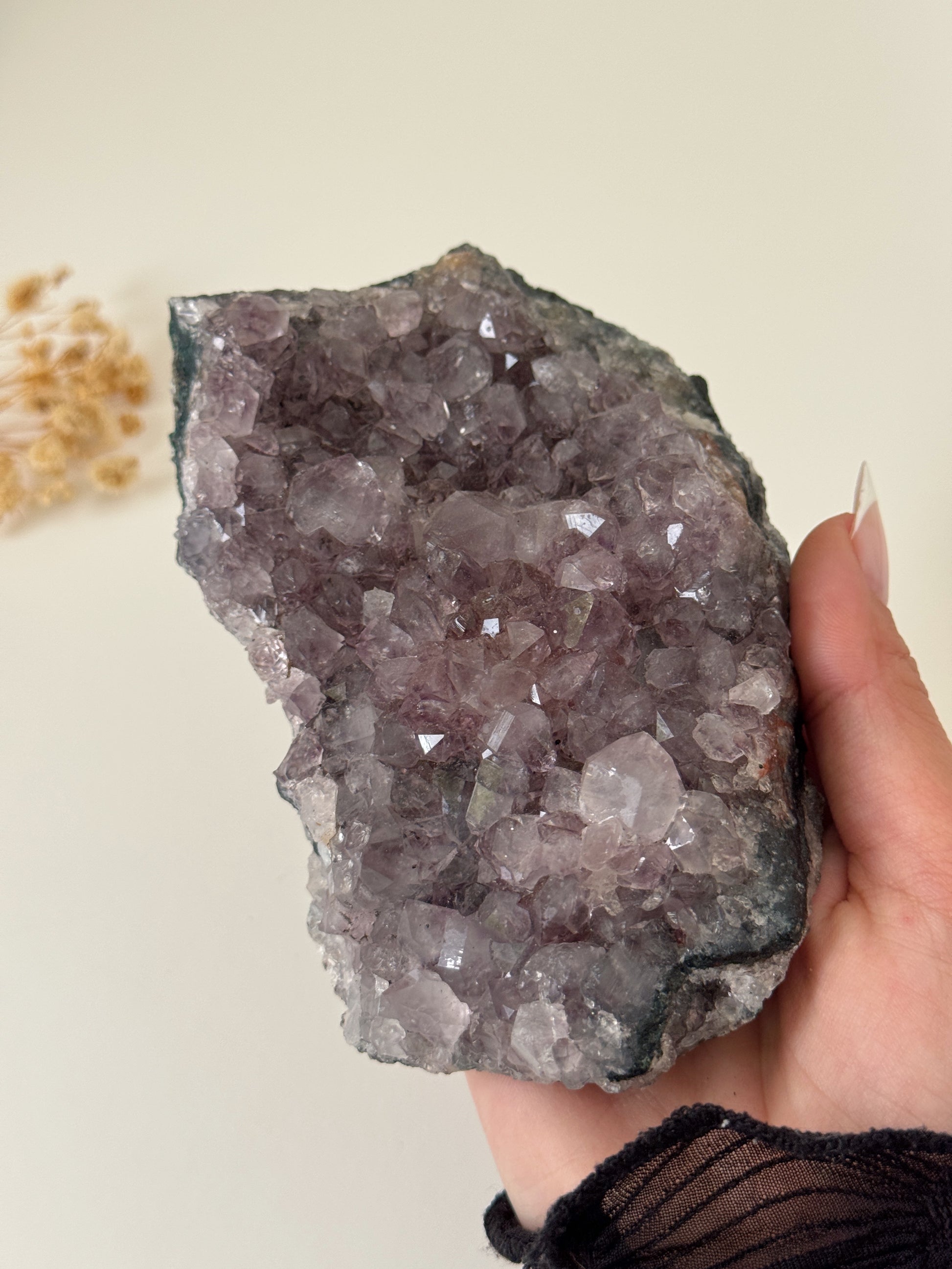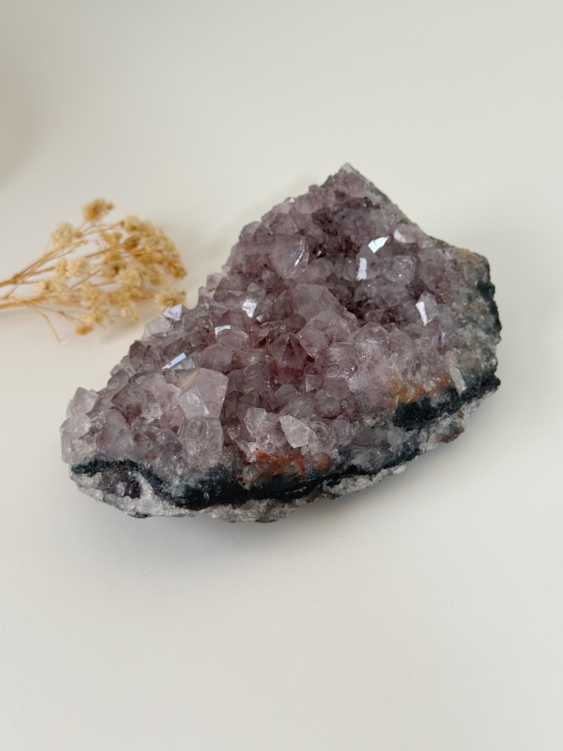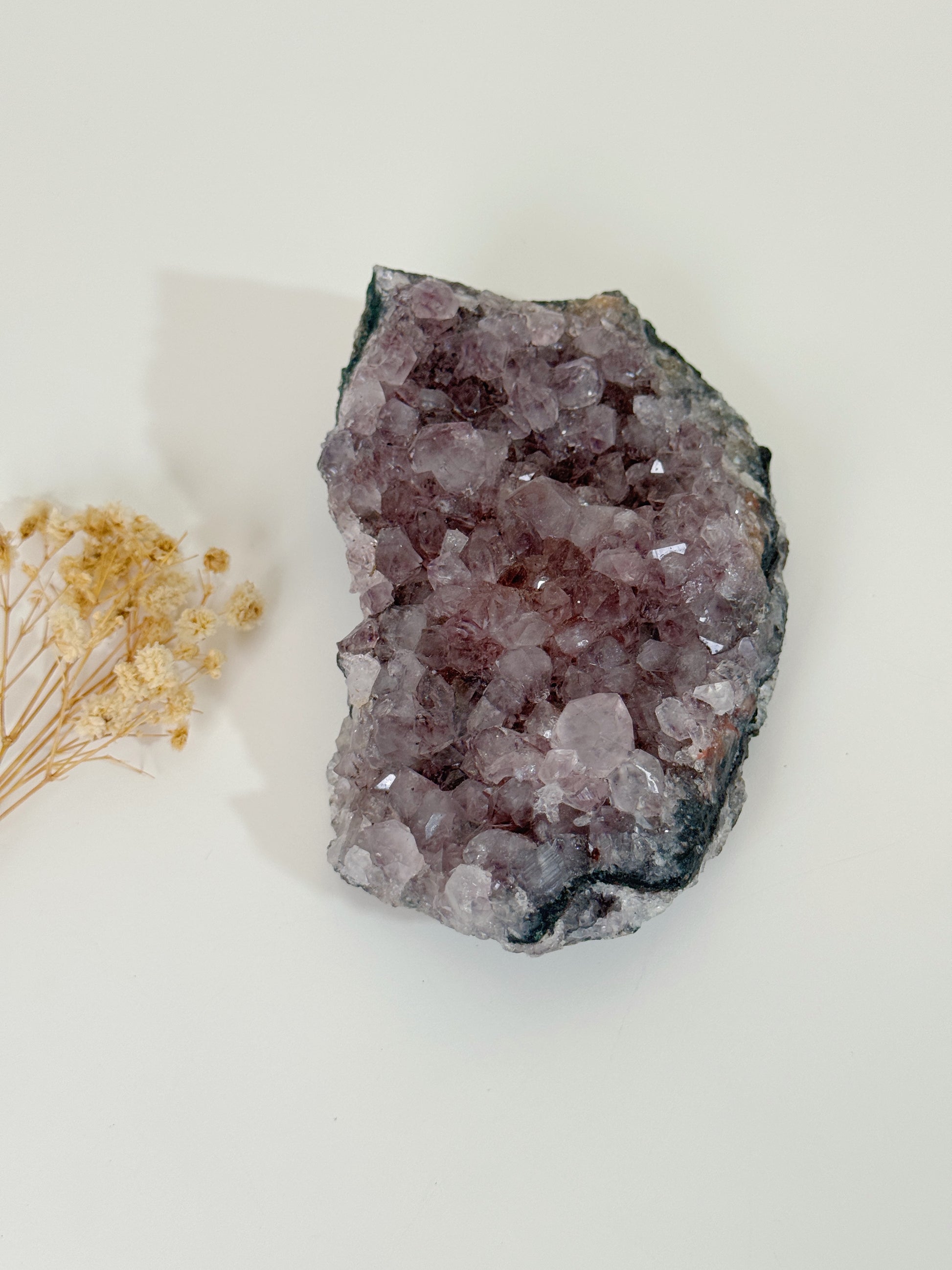 Cristal de elevada proteção espiritual, com a sua qualidade de tranquilizante natural, a Ametista bloqueia o stress e as energias negativas.Tem fortes poderes de cura e de limpeza e desenvolve a consciência espiritual. Permite ultrapassar dependências e bloqueios de todos os tipos.