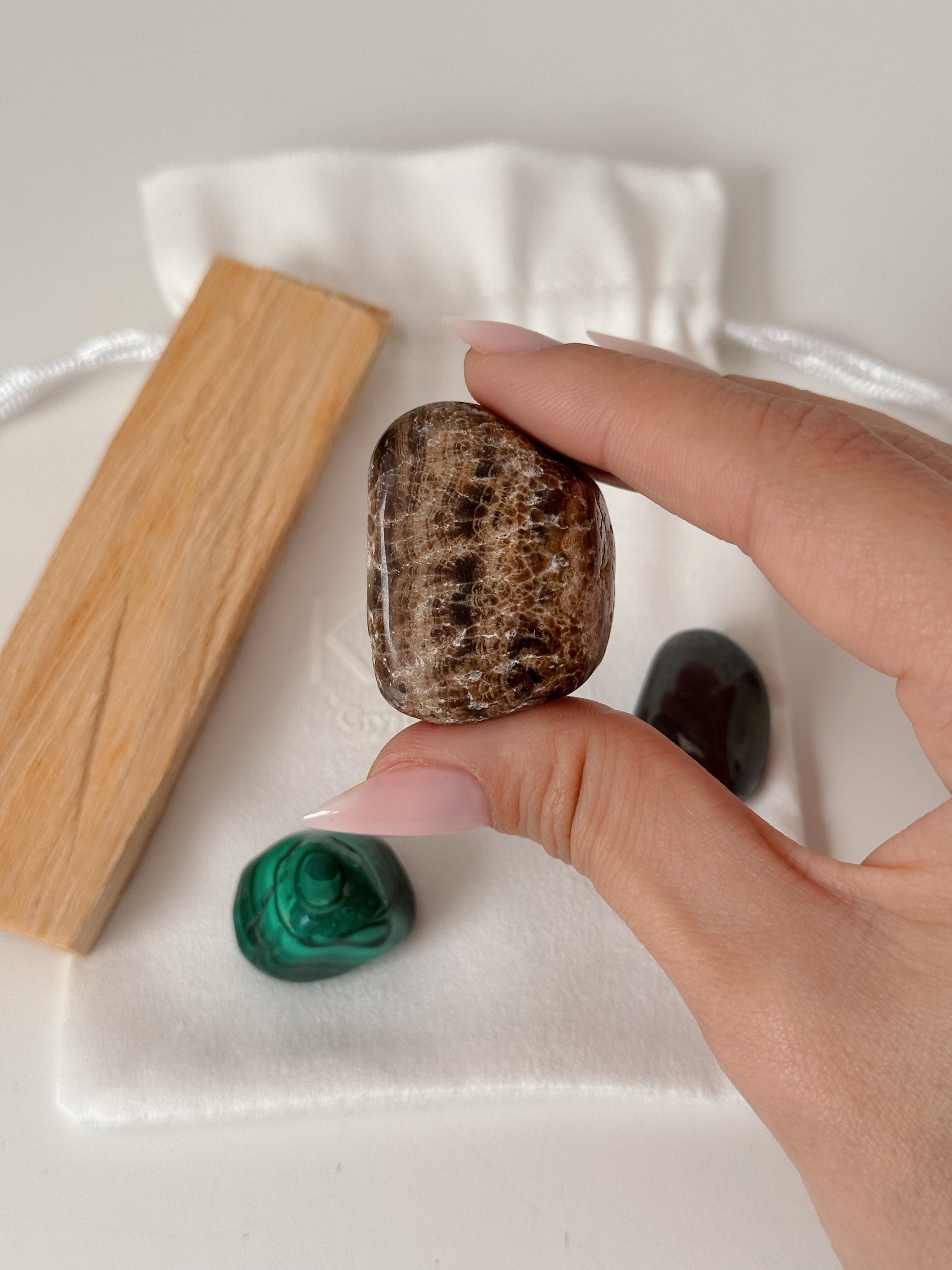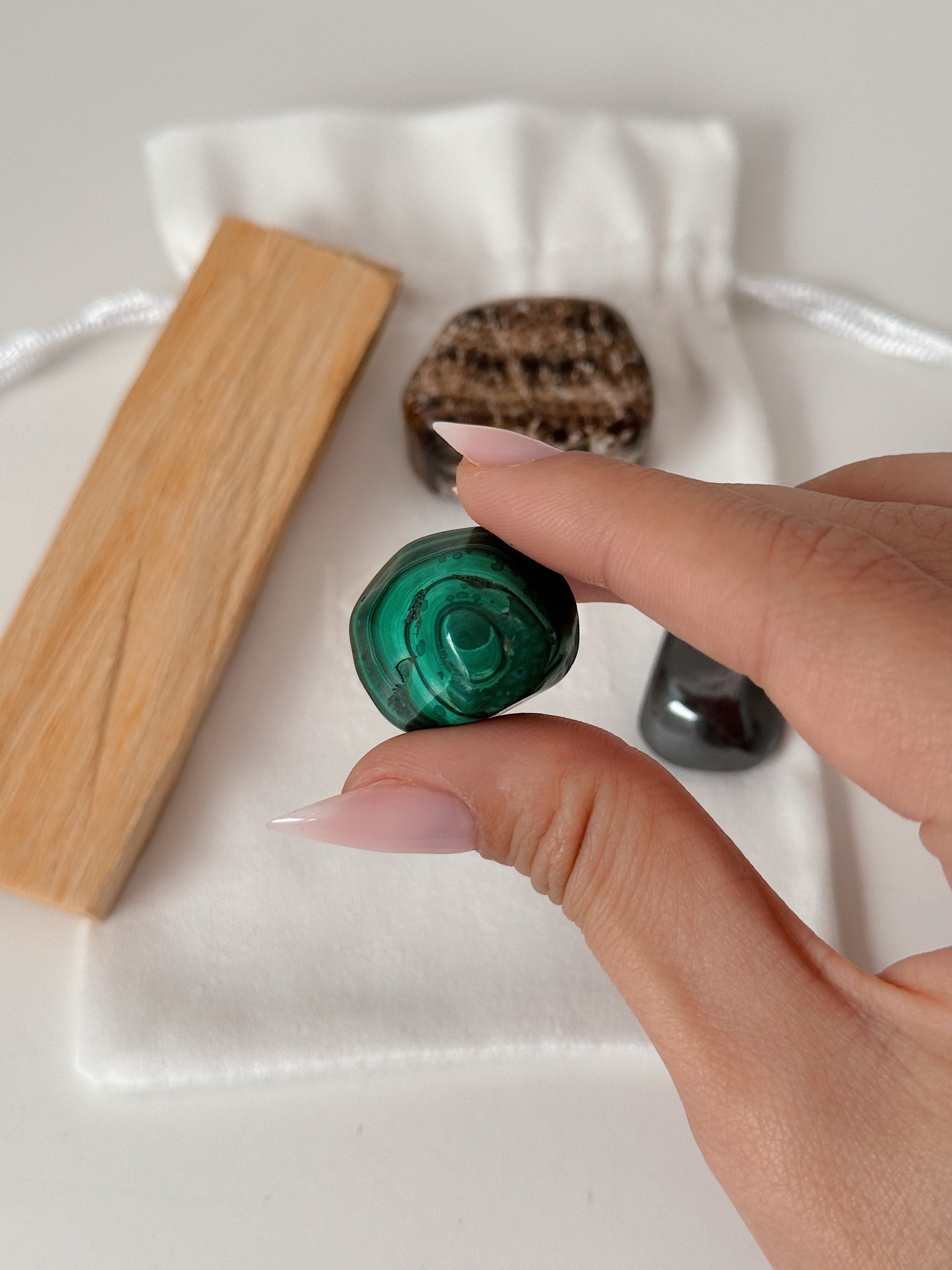 Este conjunto combina cristais associados à proteção, transformação e estabilidade emocional, juntamente com pau santo para limpeza energética.