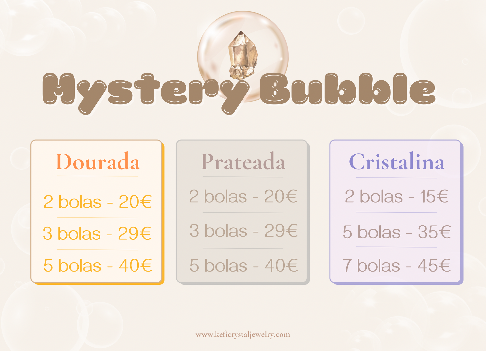 Na Mystery Bubble Cristalina, encontras artigos desde 3€ e que vão até 40€, sendo que a maioria dos artigos varia entre 10€ e 27€. E estão disponíveis cristais rolados, cristais em bruto, Drusas , pulseiras com cristais e ferramentas energéticas.