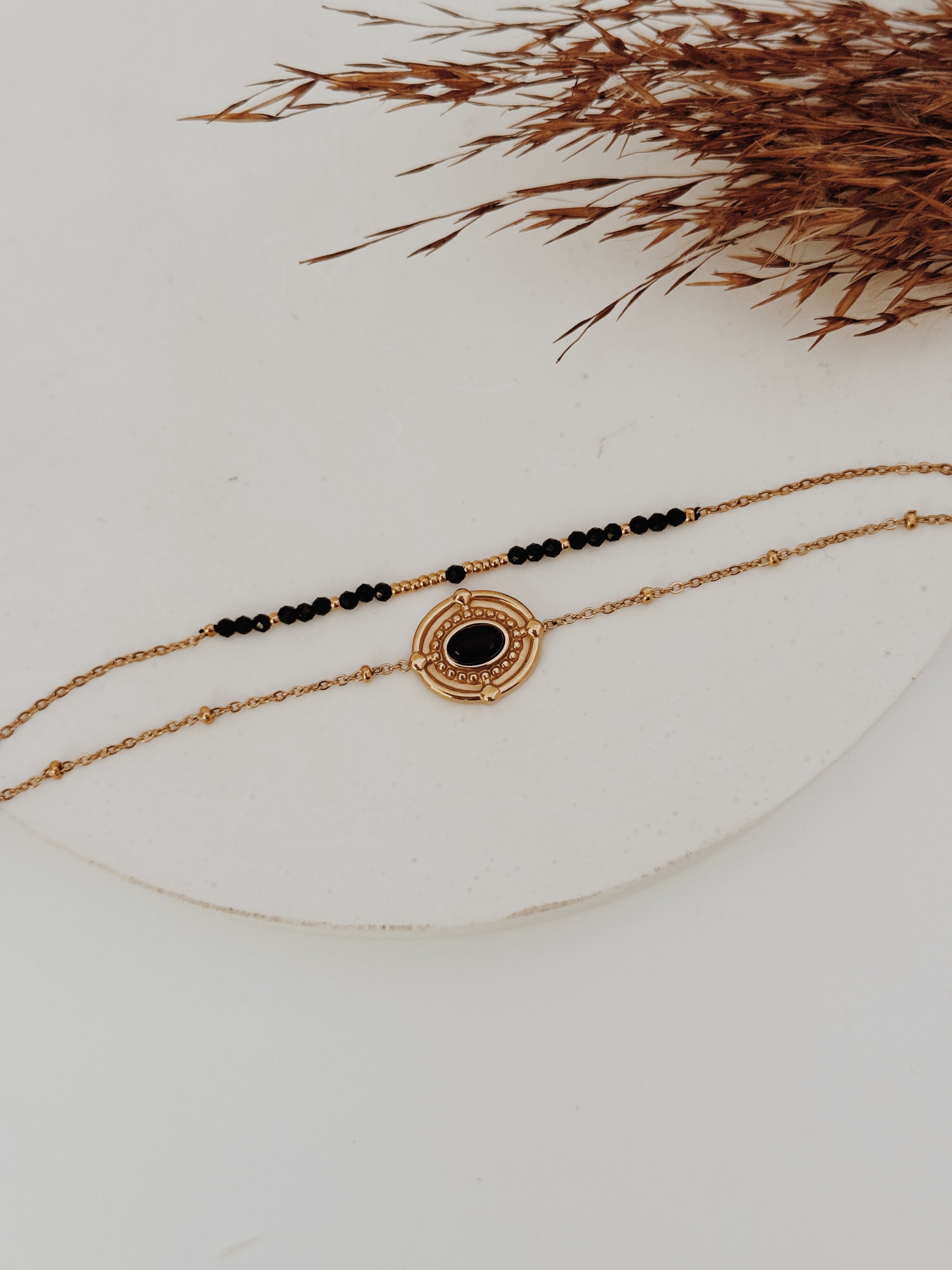 Uma pulseira com duas camadas que une a força da Turmalina negra e a estabilidade do Onix , criando um escudo protetor contra energias negativas e influências externas.