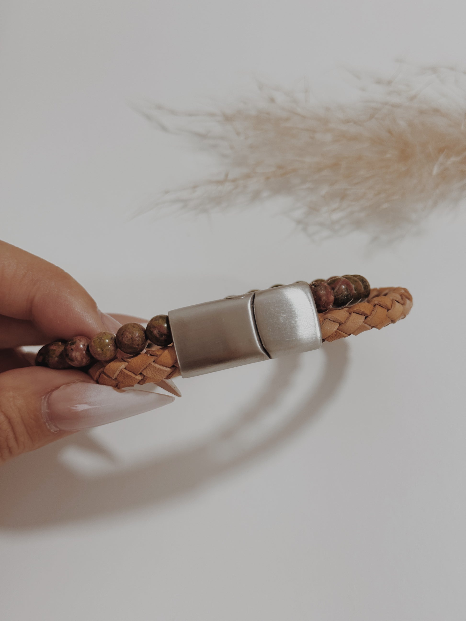 Material: aço inoxidável ( fecho ), couro trançado castanho ( pulseira ) e unakite 6mm (pulseira)