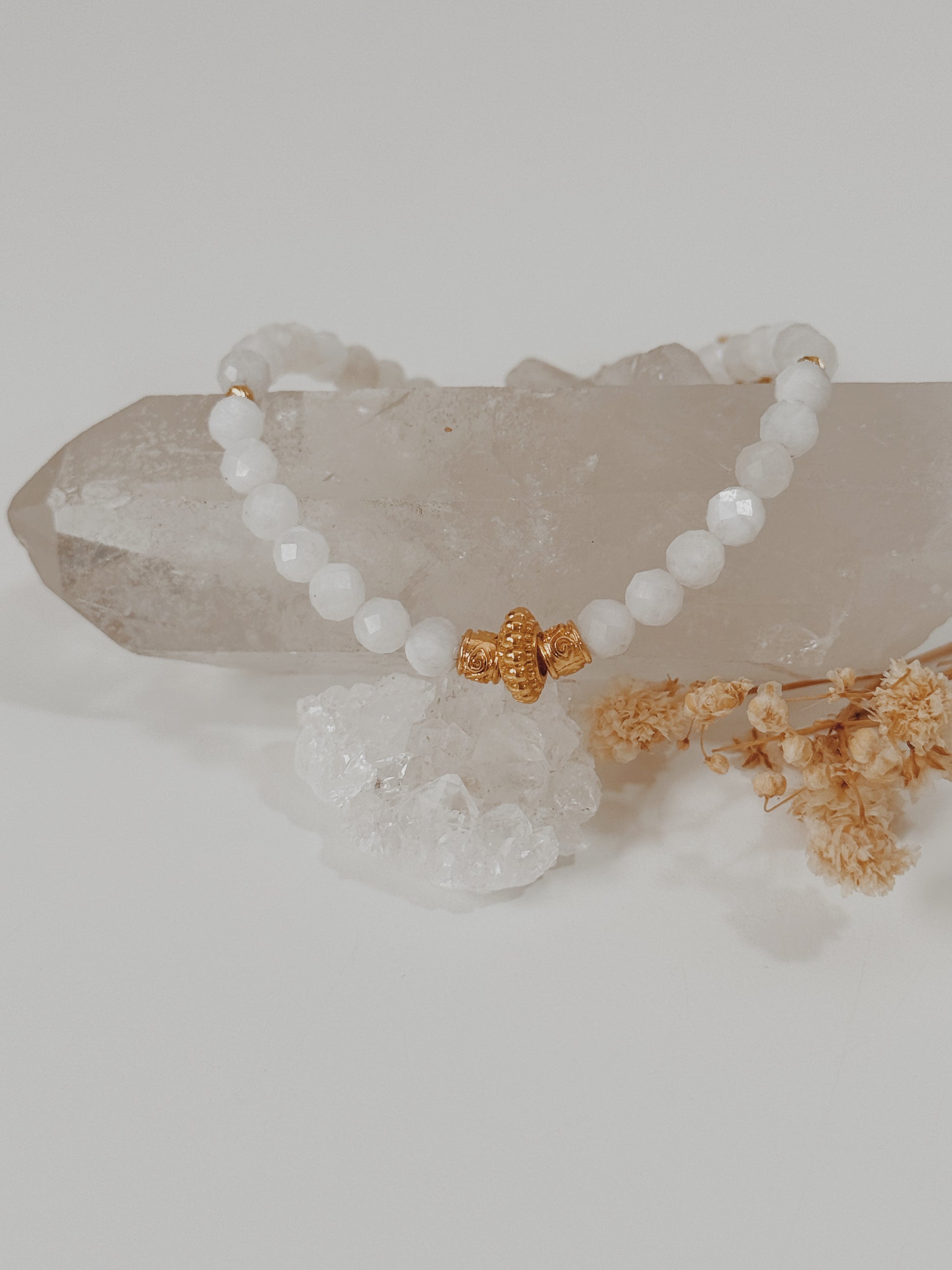 A Pedra da Lua é conhecida por acalmar as emoções, promover o equilíbrio interior, favorecer a conexão com a nossa intuição e abrir portas aos novos começos e às novas oportunidades. Utilizares esta peça é cercares-te de uma energia serena e reconfortante, que acalma as emoções, conecta-te com os ciclos naturais do corpo e da mente, oferecendo um apoio valioso durante as mudanças da tua vida.