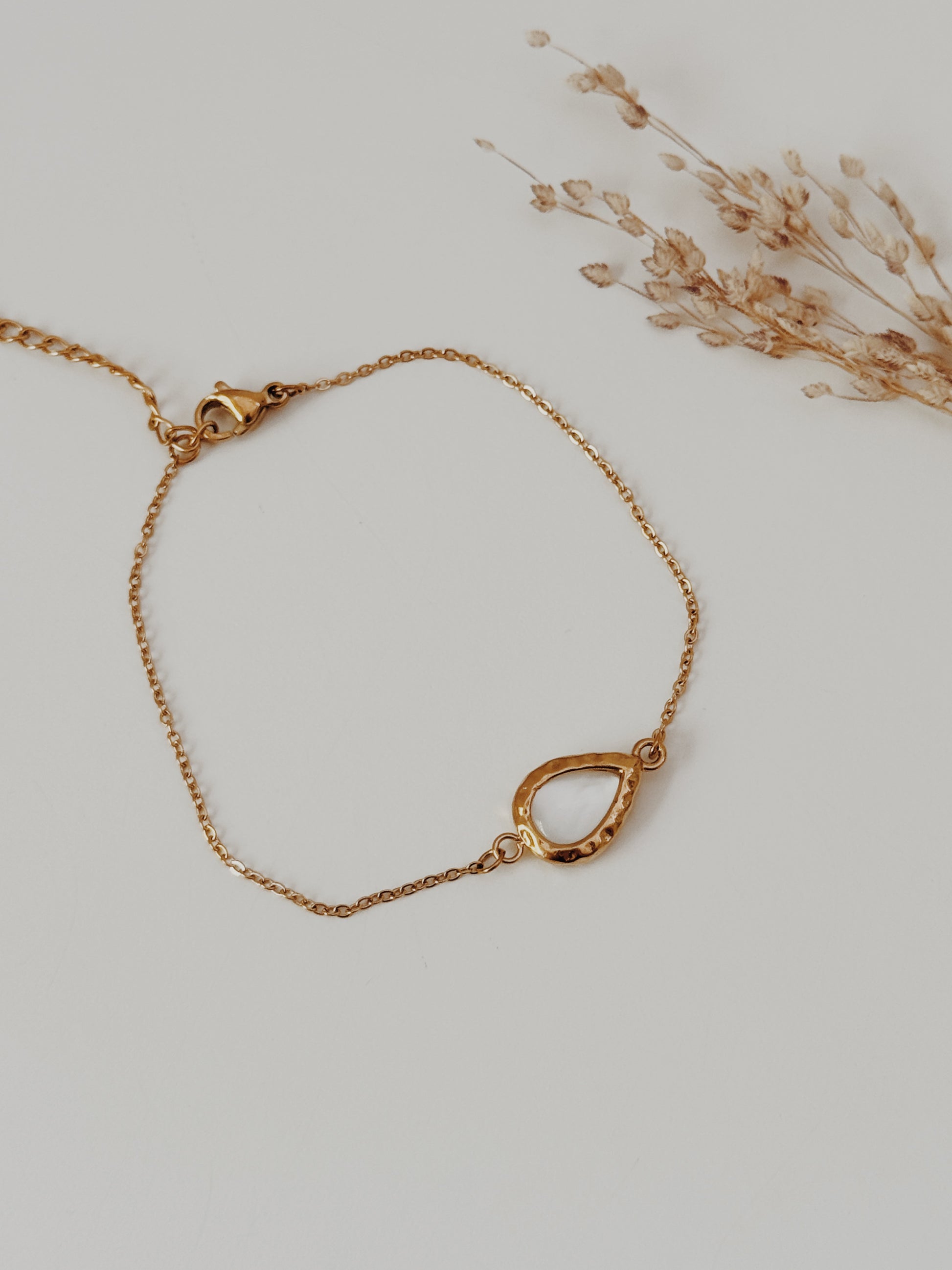 Leveza, delicadeza e inspiração aquática. A pulseira nayade é uma peça minimalista que reflete a fluidez e a harmonia da água. O seu pendente em forma de gota orgânica, com acabamento martelado em dourado, cria um jogo subtil de luz e textura, evocando a beleza natural das ondas e das gotas do mar.