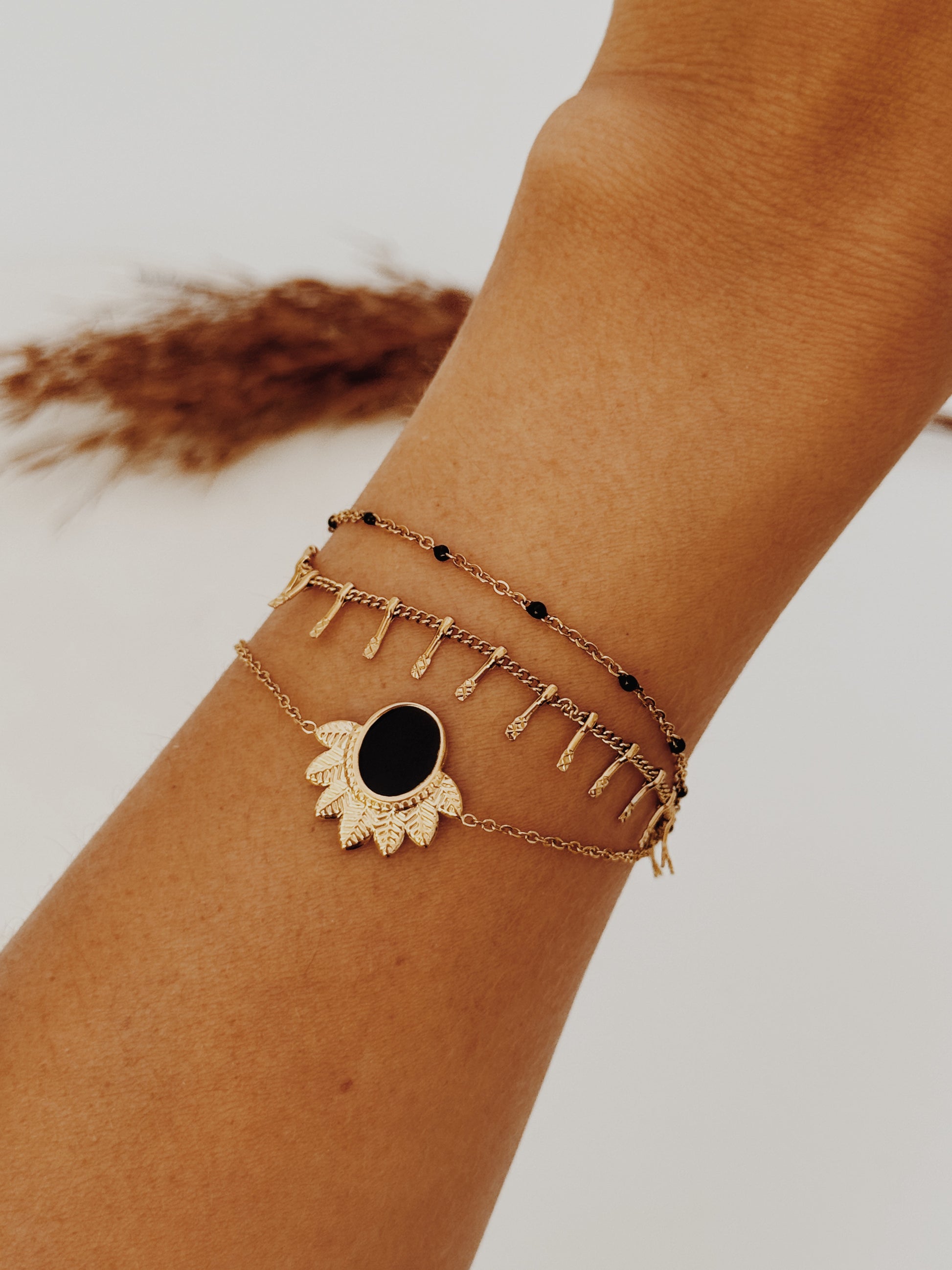 Uma pulseira moderna e elegante que combina camadas em harmonia, adornadas com detalhes em preto. Uma peça versátil, que pode ser usada no dia a dia ou em momentos especiais, elevando qualquer look com um toque de sofisticação.